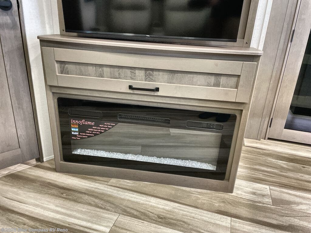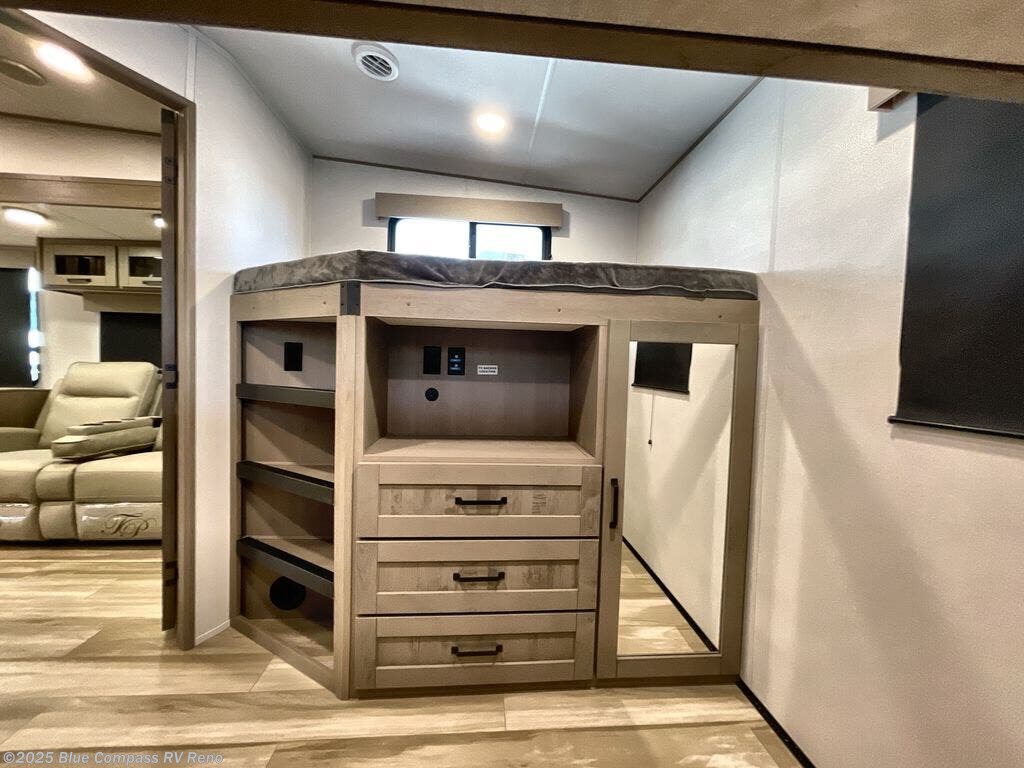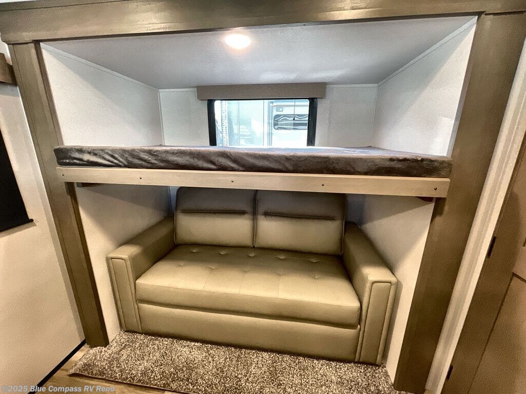 Are you looking to travel with your family and friends and want enough space for everyone to be comfortable? Step inside using the Step Above wit lift assist entry steps, to find a private bunkhouse in the rear of this fifth wheel which offers a slide out flip bunk above a tri-fold sofa, a 44" bunk bed with window and storage below, plus its very own private half bathroom. The theater seating or tri-fold sofa option is a great place to unwind at night in front of the entertainment center with a 40" LED HDTV and fireplace below it. There is a booth dinette or you can a swivel dinette option to dine at, and the kitchen island will provide more counter space to prep meals. You will find full amenities including a 16 cu. ft. 12V refrigerator and a hutch. This fifth wheel also includes a double entry bathroom with a radius shower, and you can wake up refreshed each morning after sleeping on your own queen bed.