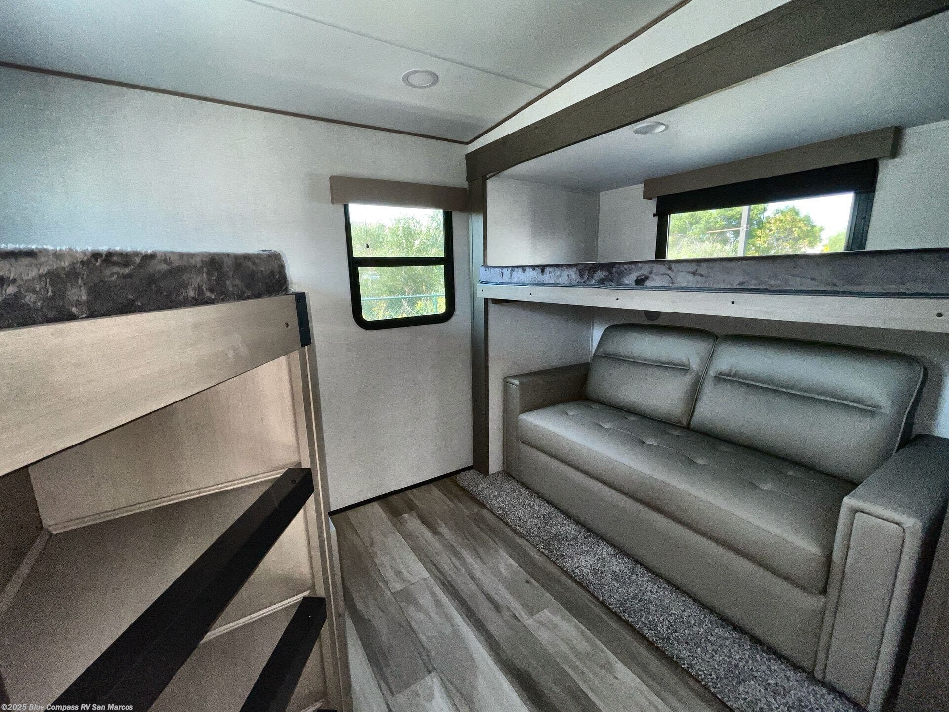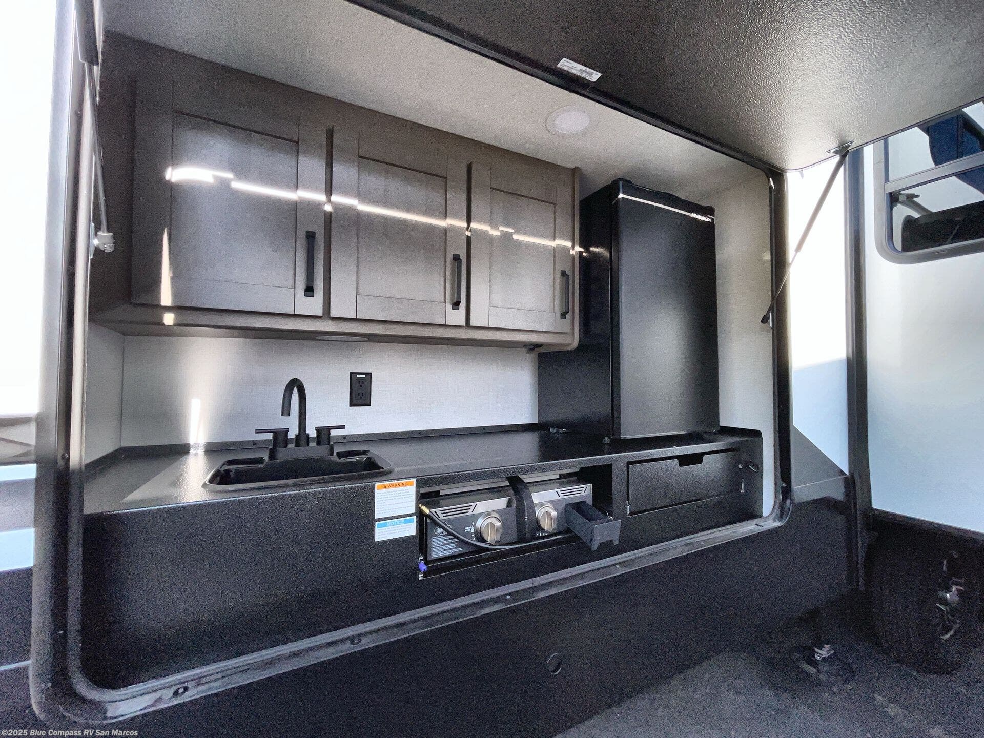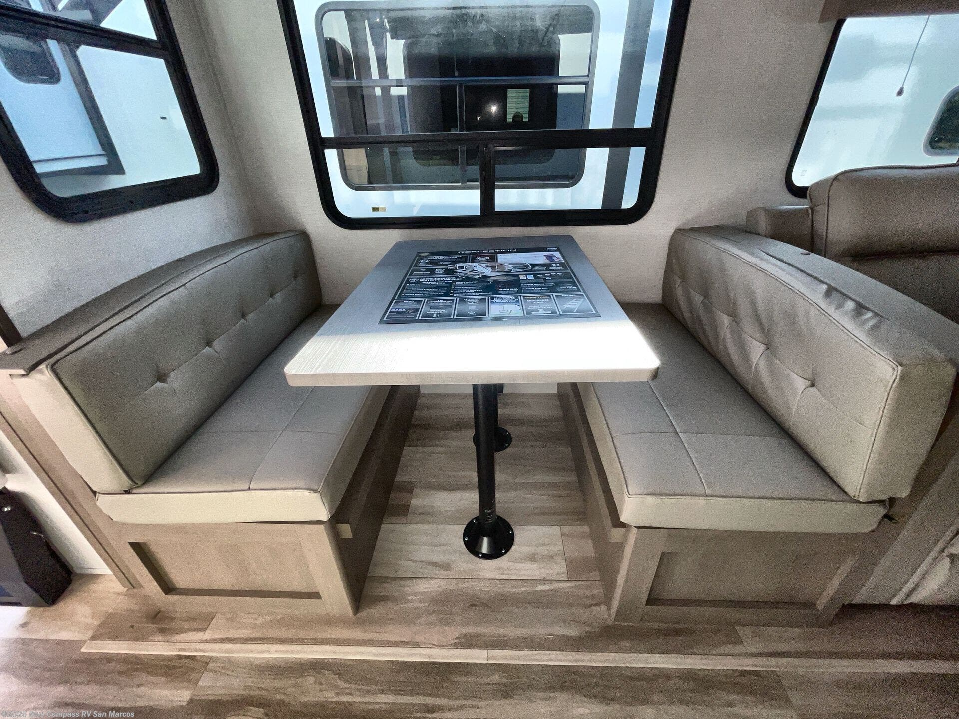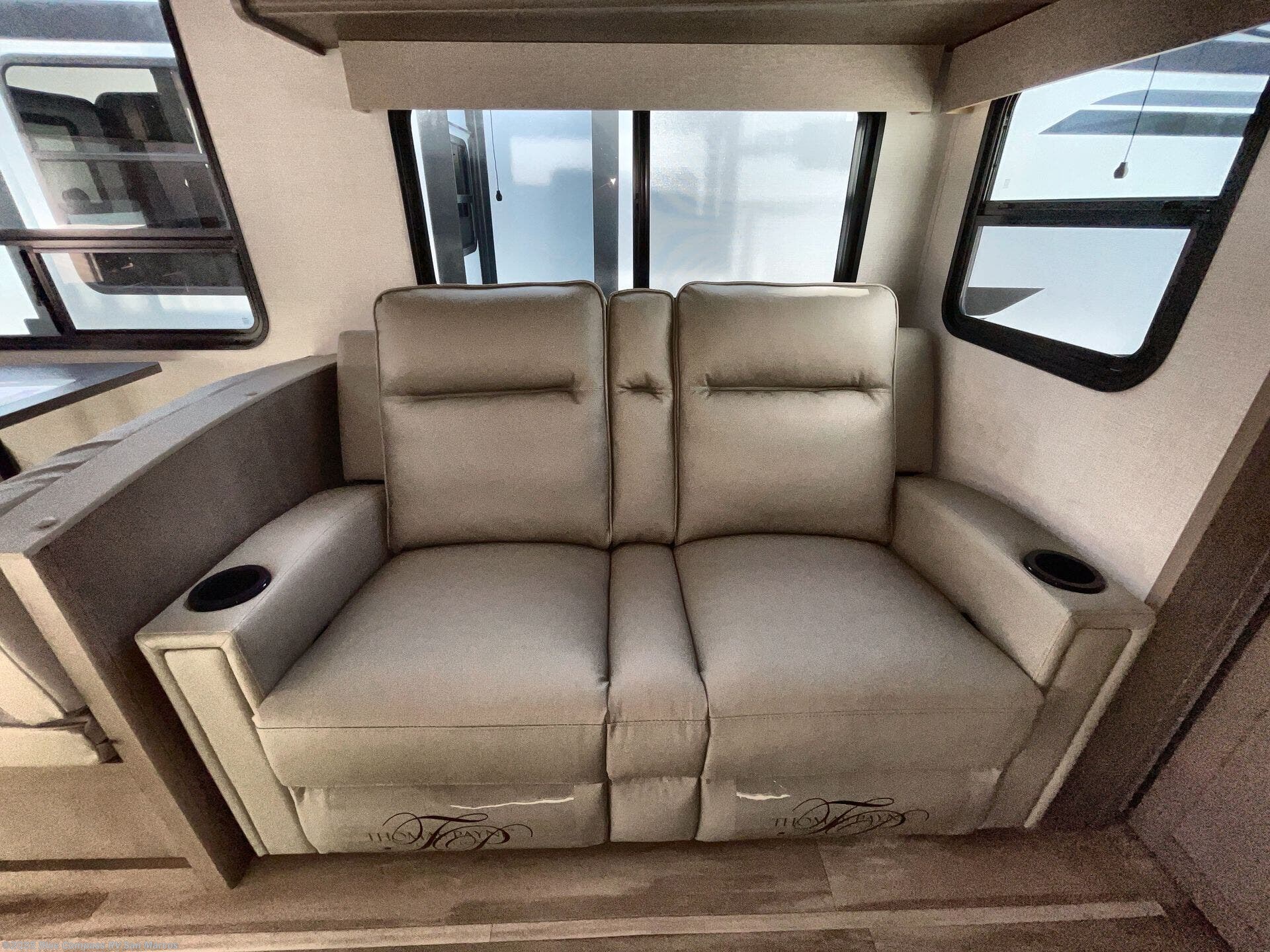 Are you looking to travel with your family and friends and want enough space for everyone to be comfortable? Step inside using the Step Above wit lift assist entry steps, to find a private bunkhouse in the rear of this fifth wheel which offers a slide out flip bunk above a tri-fold sofa, a 44" bunk bed with window and storage below, plus its very own private half bathroom. The theater seating or tri-fold sofa option is a great place to unwind at night in front of the entertainment center with a 40" LED HDTV and fireplace below it. There is a booth dinette or you can a swivel dinette option to dine at, and the kitchen island will provide more counter space to prep meals. You will find full amenities including a 16 cu. ft. 12V refrigerator and a hutch. This fifth wheel also includes a double entry bathroom with a radius shower, and you can wake up refreshed each morning after sleeping on your own queen bed.