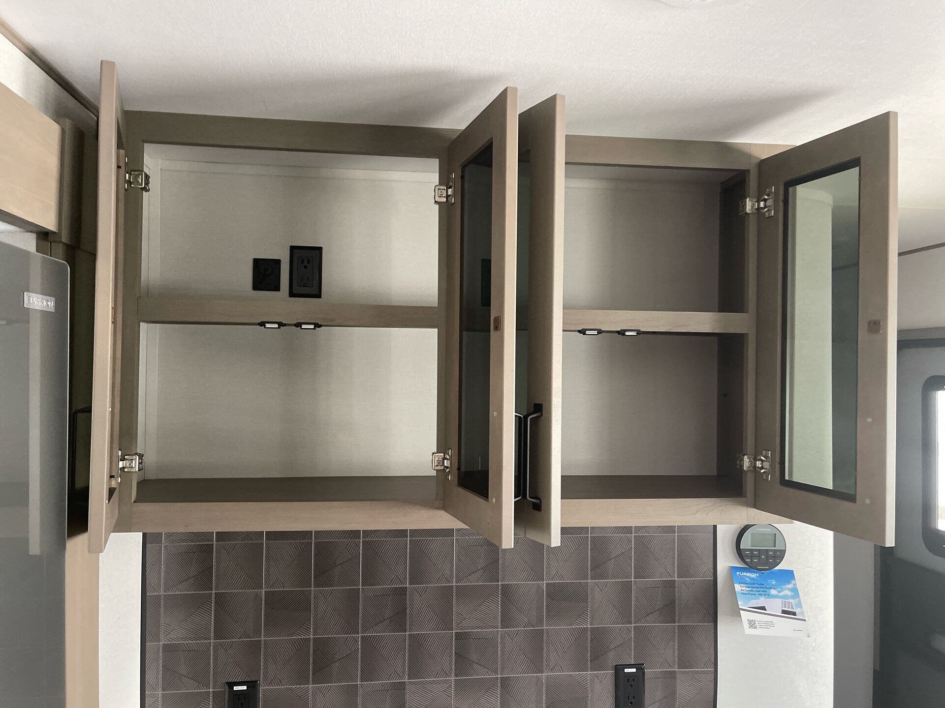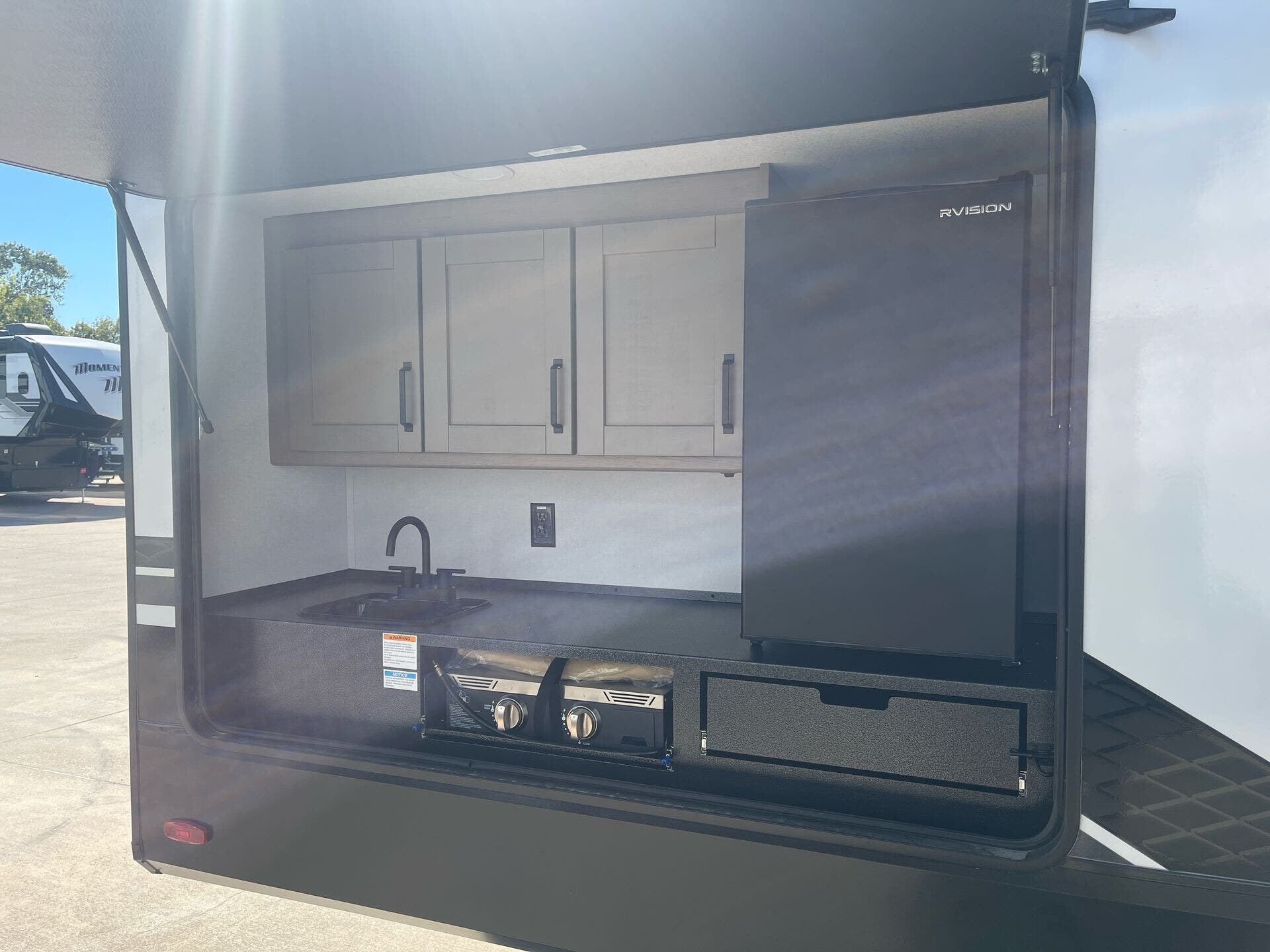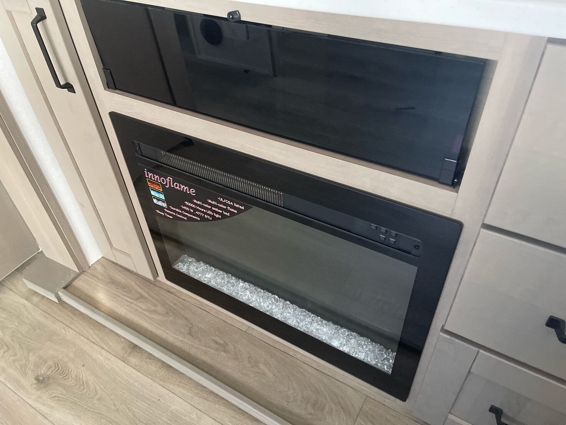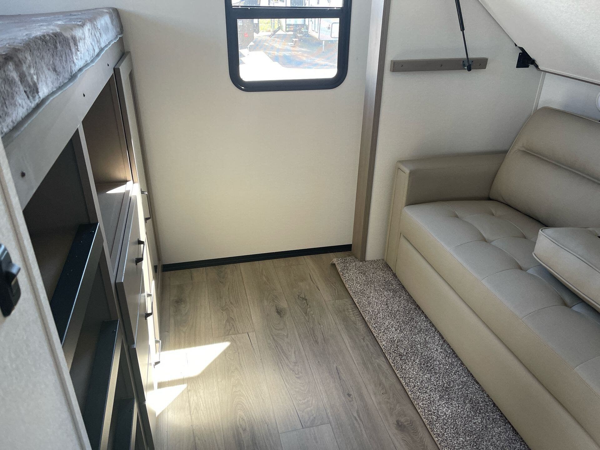 Sleeping up to 6-7 people, the 312BHTS features a rear bunkhouse with dual bunks, including a flip-bunk above a tri-fold sofa and another bunk with storage below, plus a large panoramic rear window. The front bedroom has a walk-around queen bed with dual wardrobes and plenty of storage. In between lies a full kitchen with an island, large refrigerator (≈ 16 cu ft), two hutches, and a full bathroom with a 30″×36″ shower, linen storage, and space-saving sliding door.