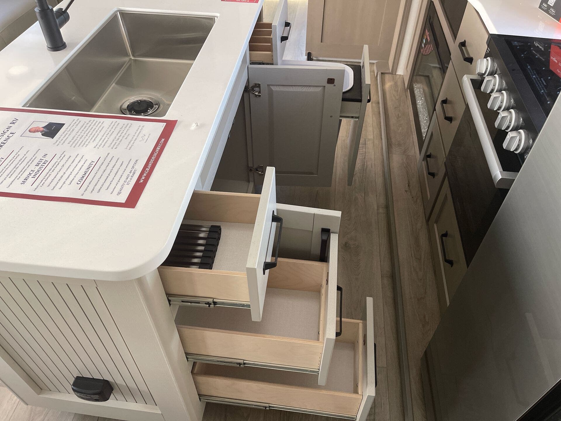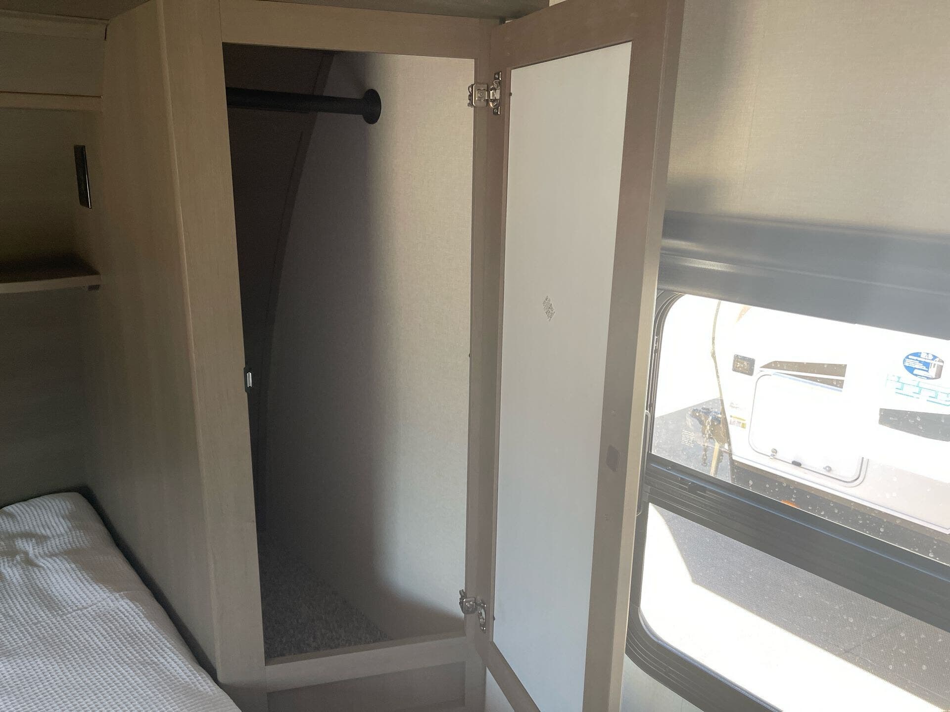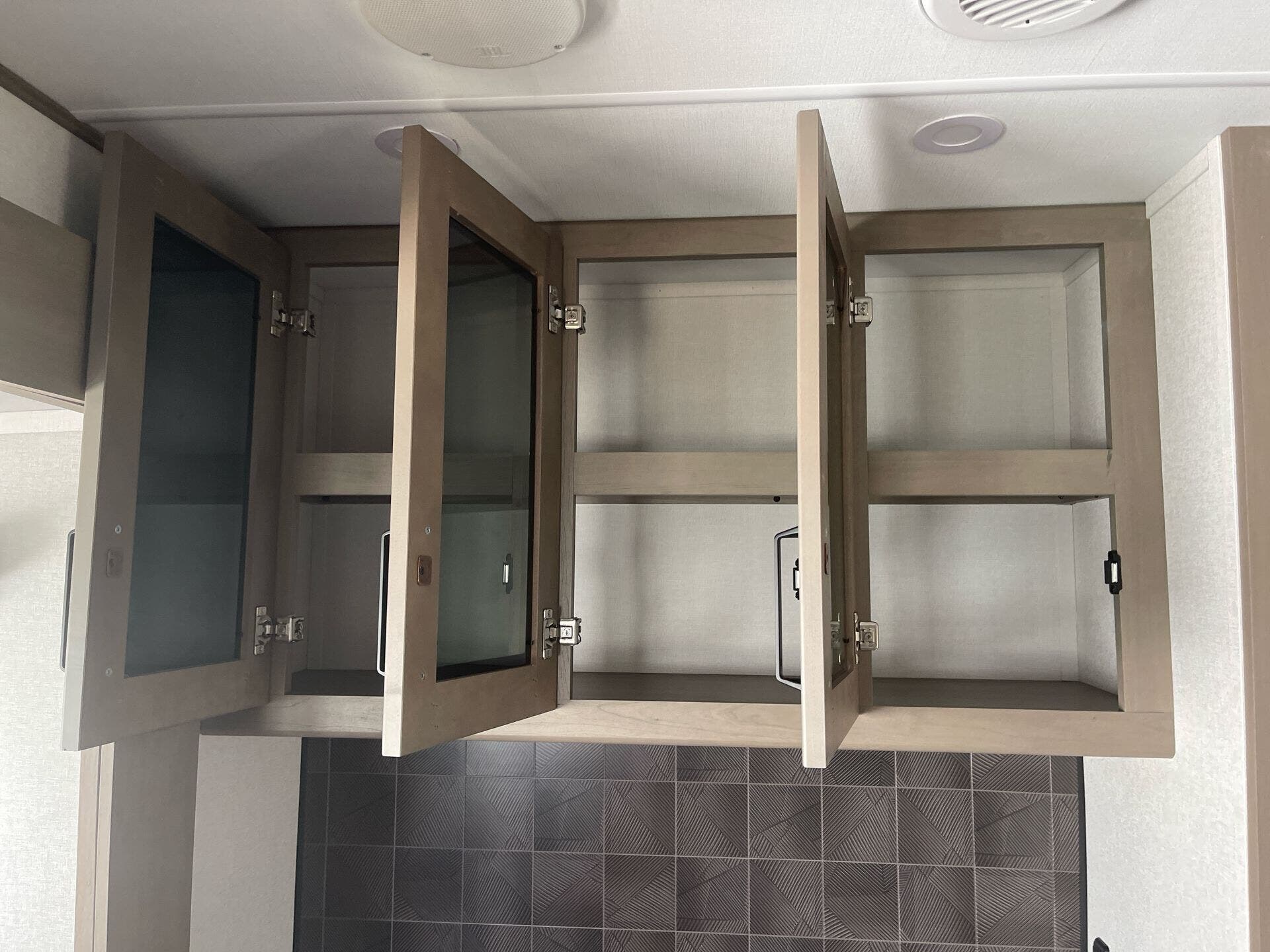 Sleeping up to 6-7 people, the 312BHTS features a rear bunkhouse with dual bunks, including a flip-bunk above a tri-fold sofa and another bunk with storage below, plus a large panoramic rear window. The front bedroom has a walk-around queen bed with dual wardrobes and plenty of storage. In between lies a full kitchen with an island, large refrigerator (≈ 16 cu ft), two hutches, and a full bathroom with a 30″×36″ shower, linen storage, and space-saving sliding door.