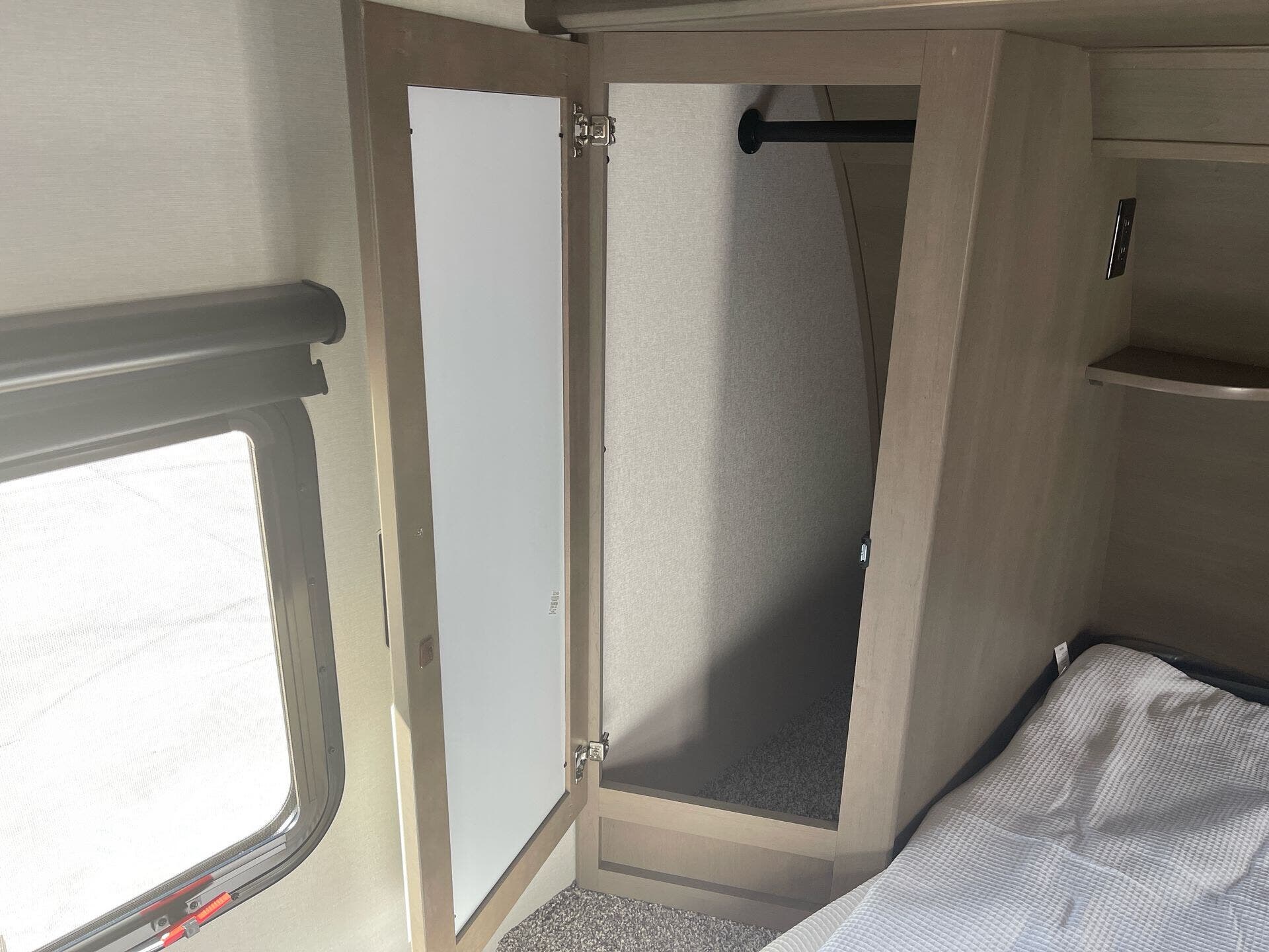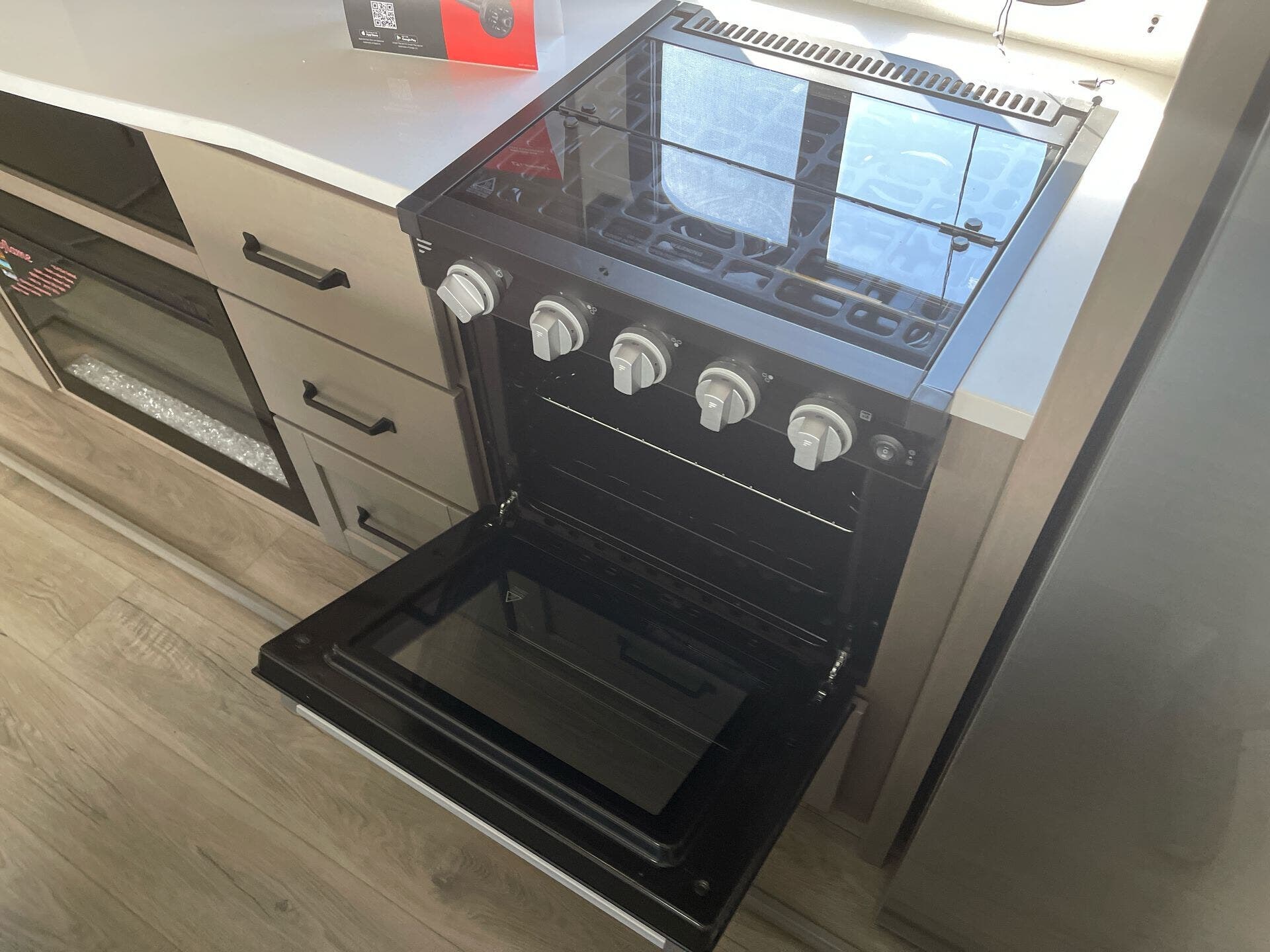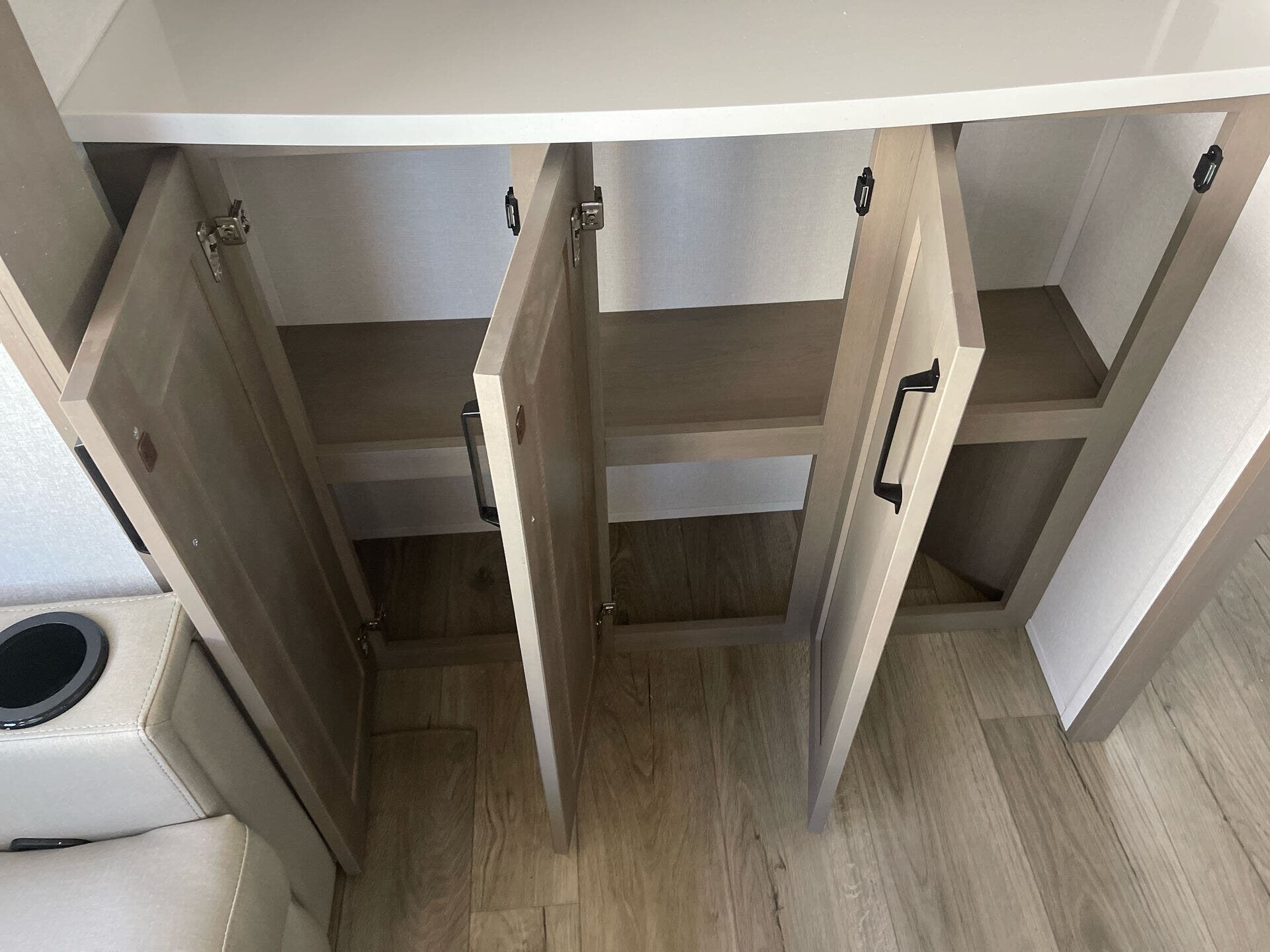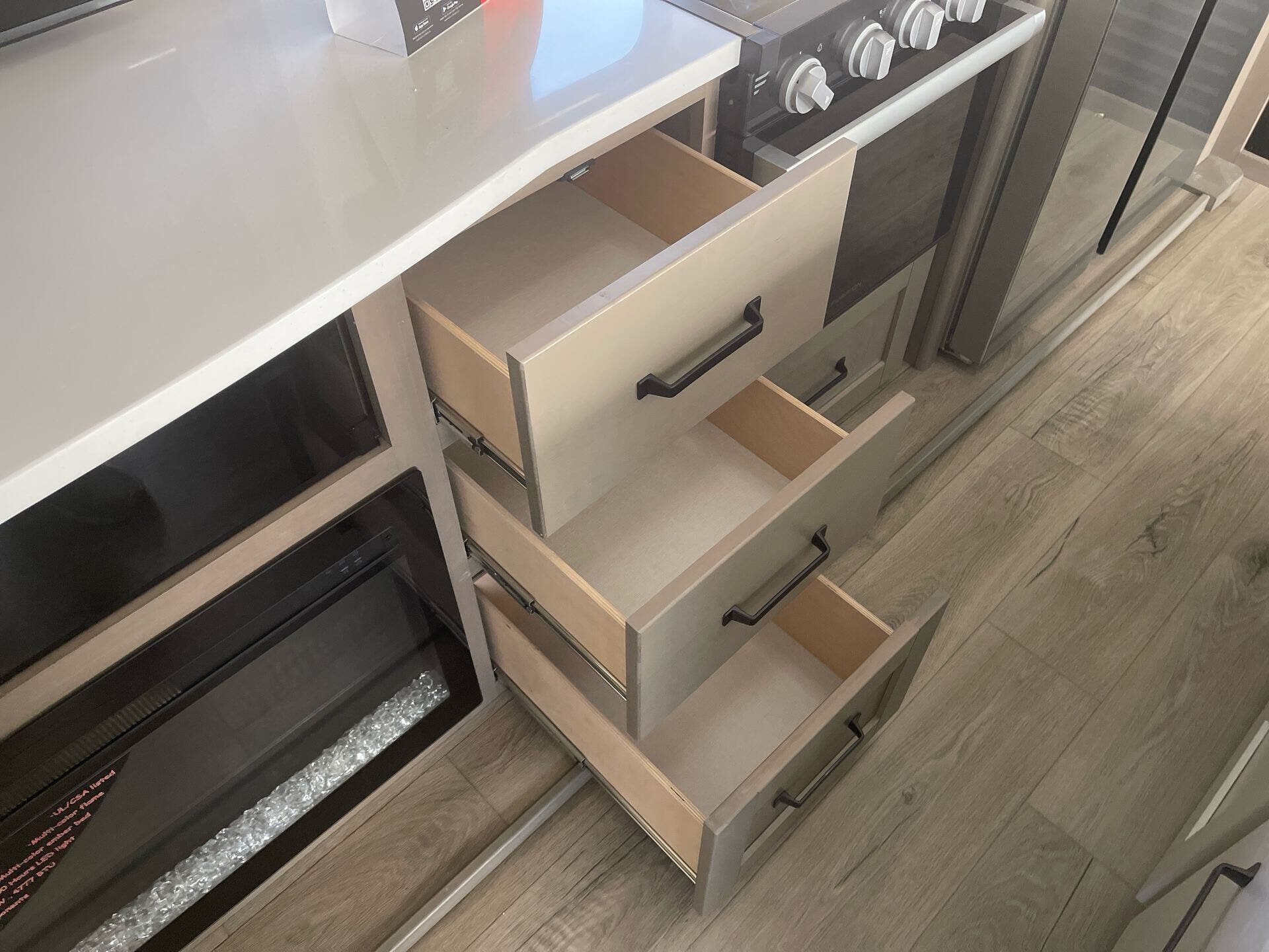 Sleeping up to 6-7 people, the 312BHTS features a rear bunkhouse with dual bunks, including a flip-bunk above a tri-fold sofa and another bunk with storage below, plus a large panoramic rear window. The front bedroom has a walk-around queen bed with dual wardrobes and plenty of storage. In between lies a full kitchen with an island, large refrigerator (≈ 16 cu ft), two hutches, and a full bathroom with a 30″×36″ shower, linen storage, and space-saving sliding door.