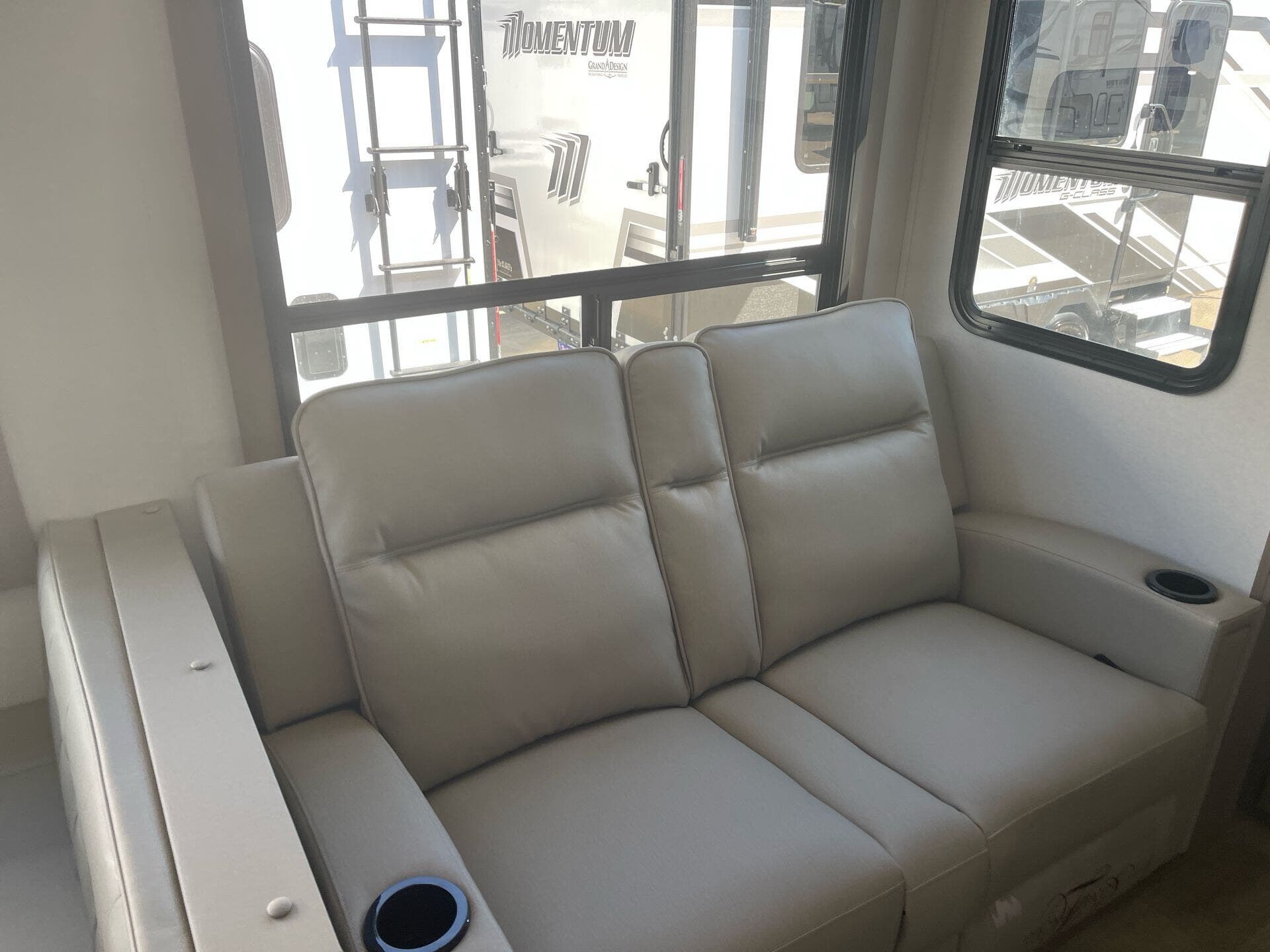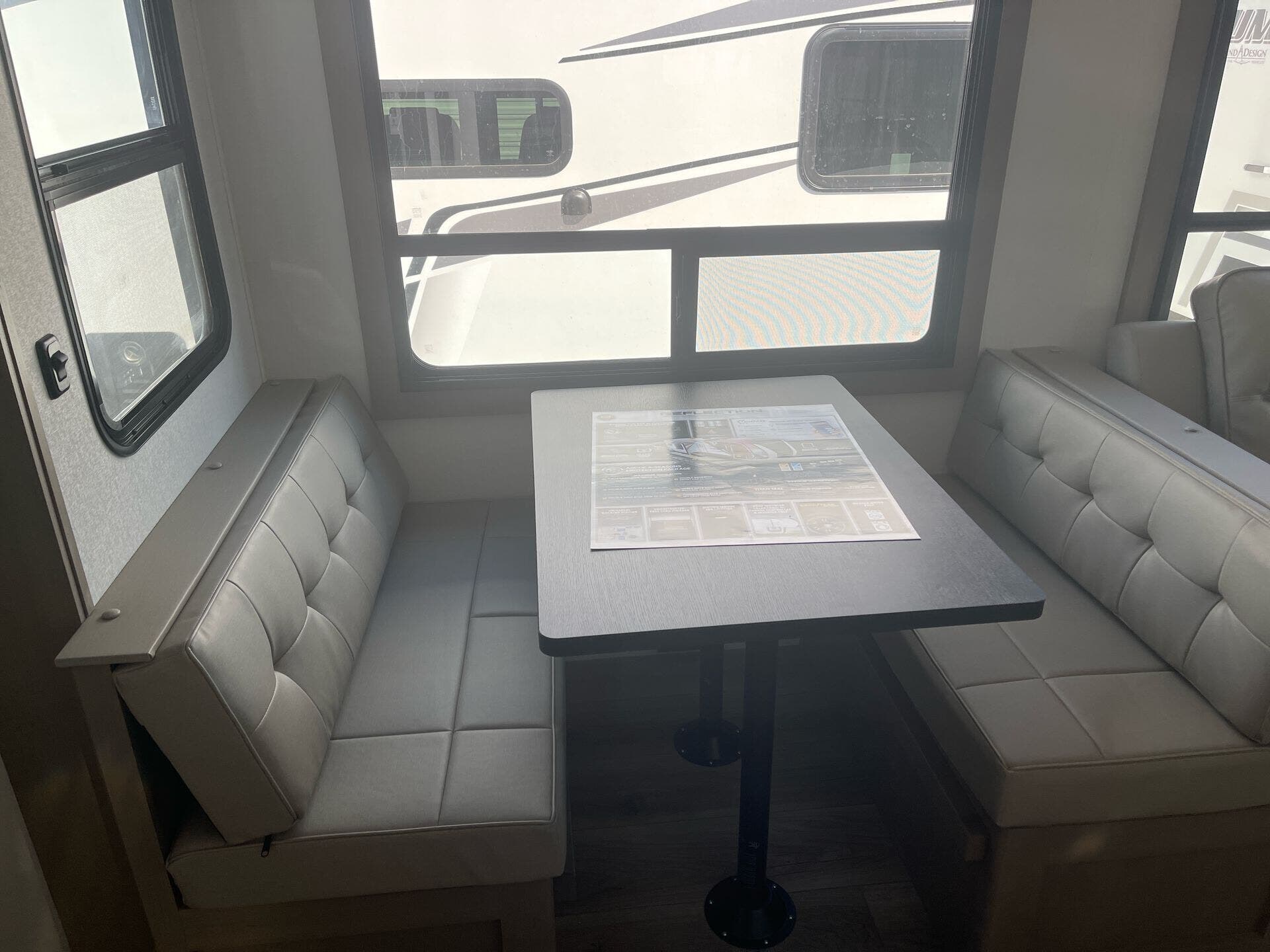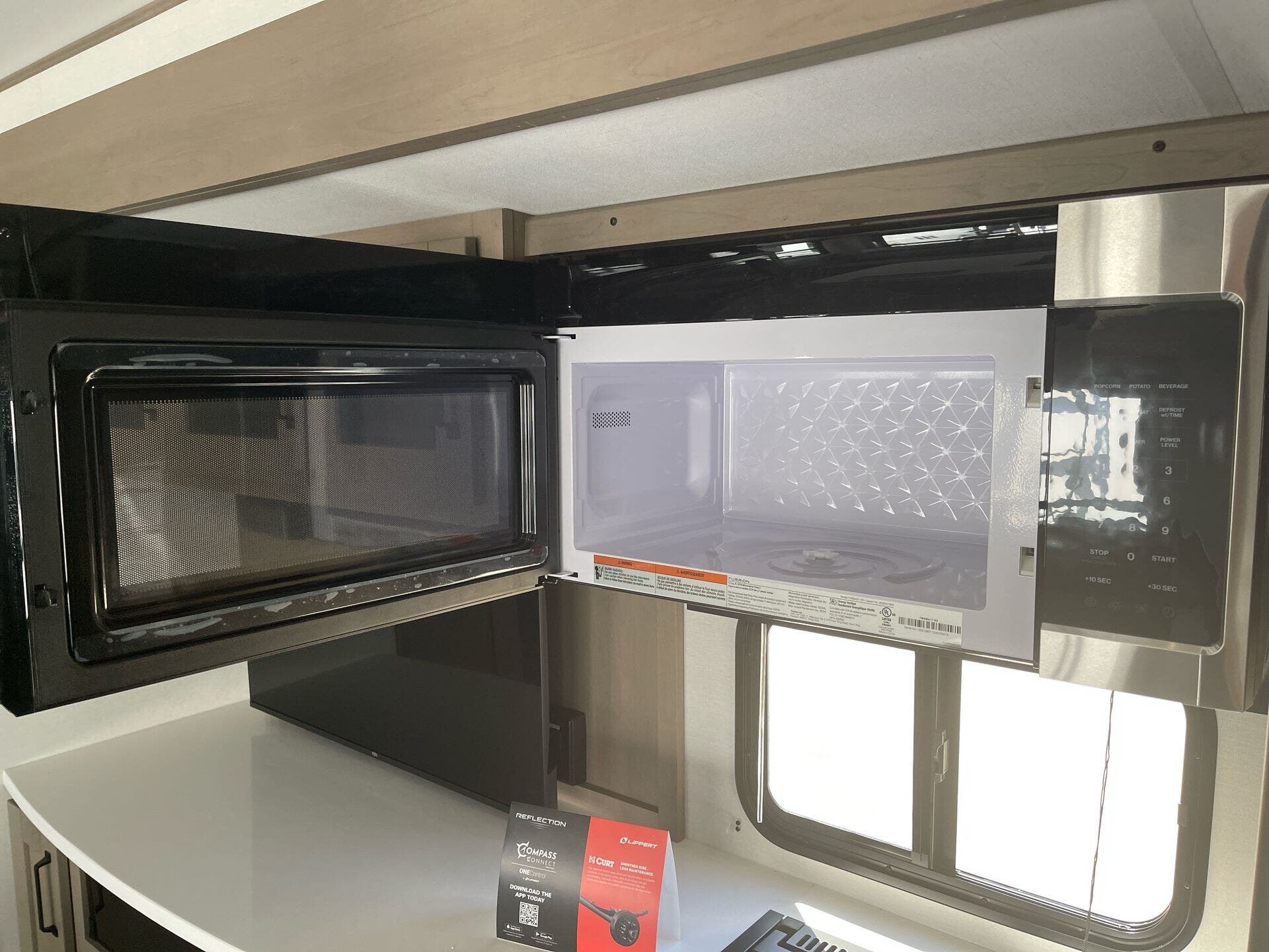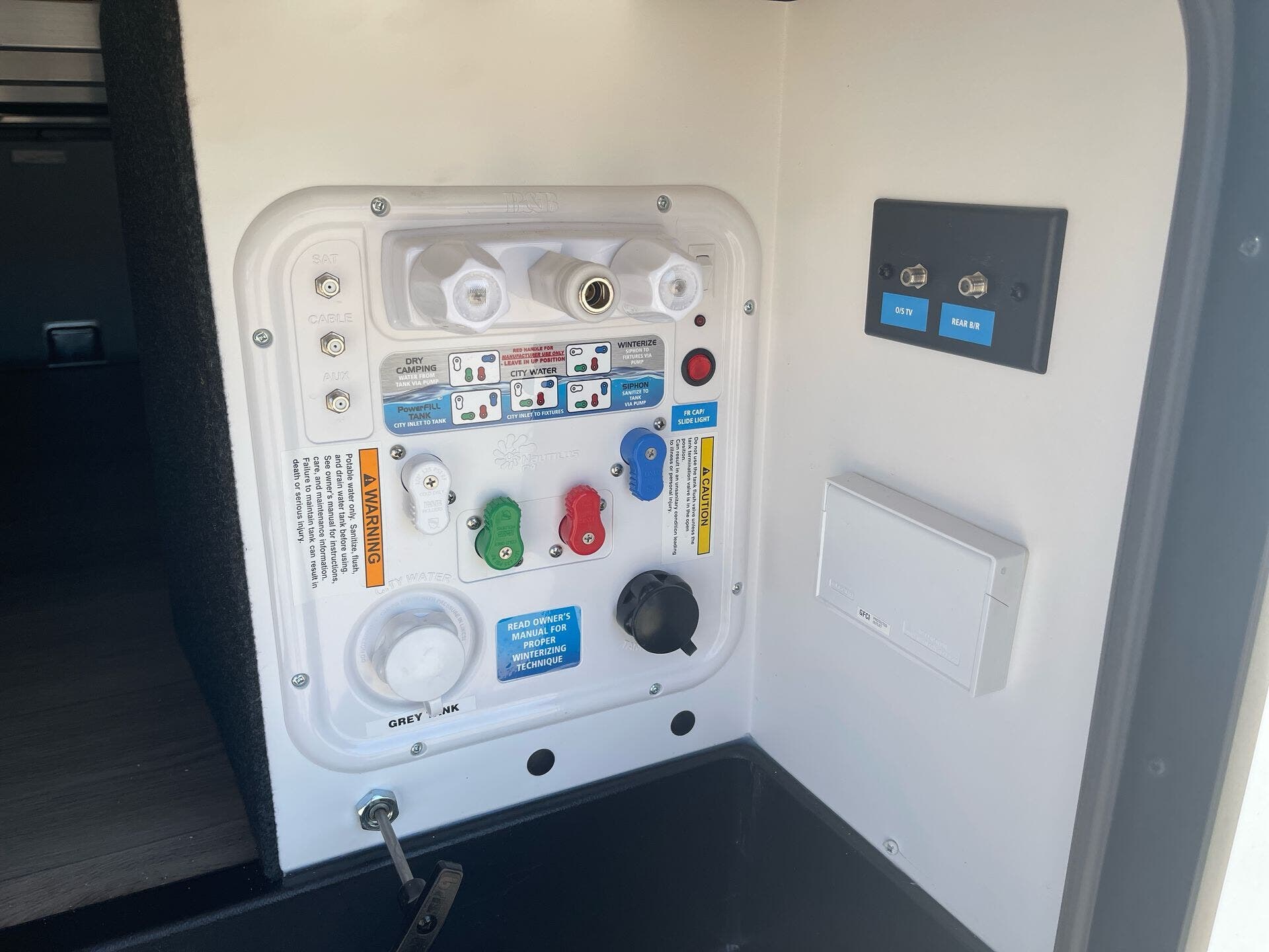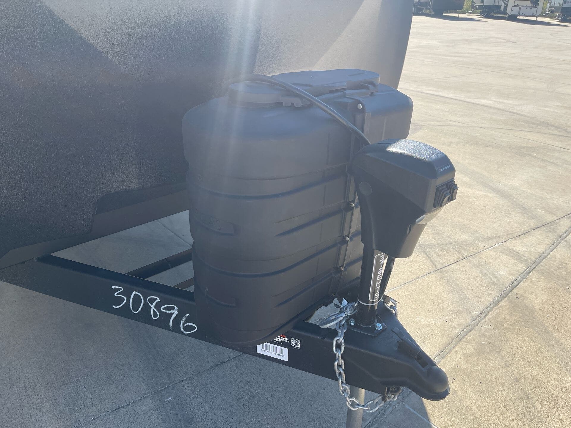 Utility capacities are generous: 54 gallons fresh, 86 gallons gray, 43 gallons black with two 30-lb propane tanks. The heating is handled by a 35,000 BTU furnace and cooling by a 15,000 BTU air conditioner. Outside, features include a 19- to 21-foot one-touch LED awning, an outside kitchen, pass-through storage, solar prep with a 60-amp charge controller/inverter options, and Goodyear Endurance tires. Construction is rugged: R-30 floor insulation, R-40 roof, strong slide-out insulation, gel-coat sidewalls, walk-on roof decking, heated & enclosed underbelly, etc.