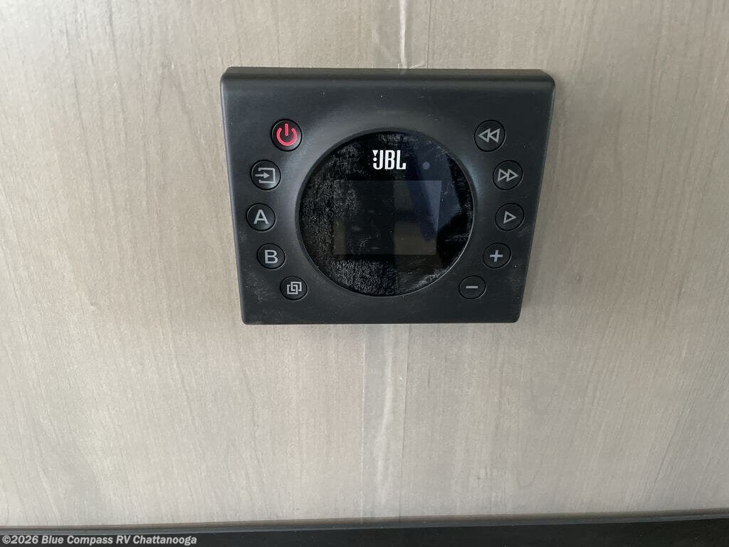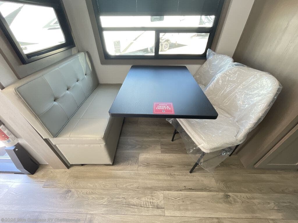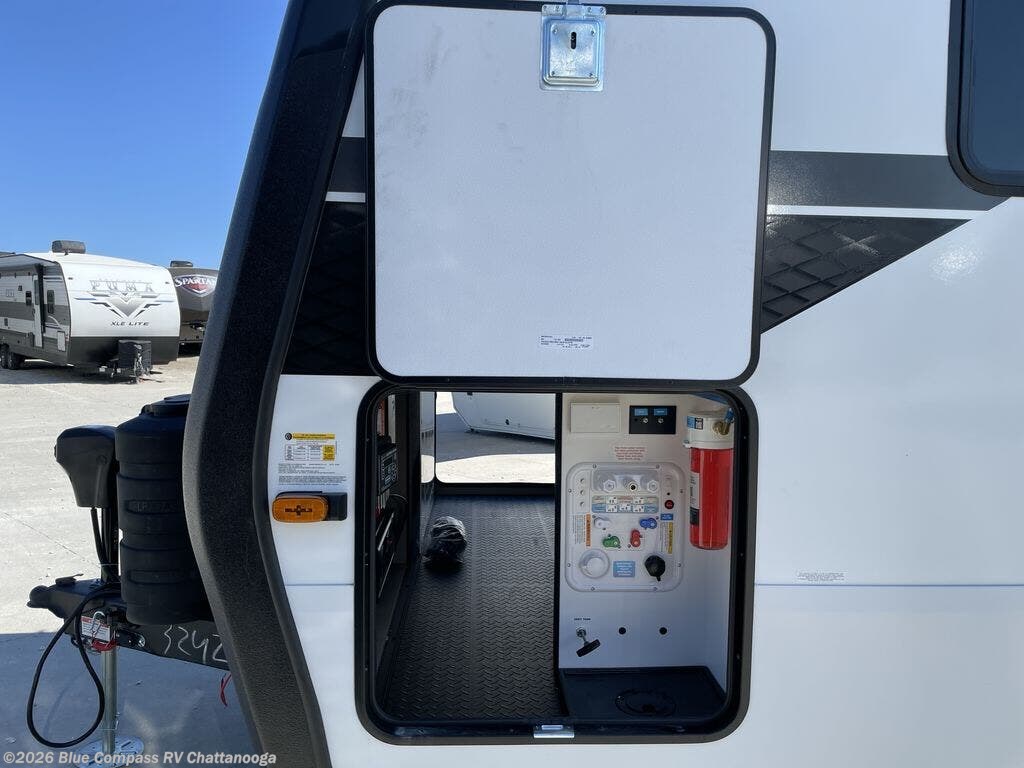 Whether you travel to explore or relax, this trailer will give you the choice depending where you park it! The kitchen amenities offer a gourmet kitchen including a 16 cu. ft. refrigerator, an island, and a hutch. You and your guests will find theater seating with cupholders, a booth dinette or optional swivel dinette, and a tri-fold sofa to sit on and visit while you watch the 40" LED HDTV with a fireplace below. The full bathroom includes a space saving sliding door and linen storage, and the bedroom gives you a front walk-around queen bed with storage for your clothes on each side. There is even washer and dryer prep here if you choose to go full-time. Outside, you'll find a 12' electric awning, an LP Quick Connect and Coax TV hookup, plus an exterior griddle, 4.1 cu. ft. refrigerator and outside spray port!