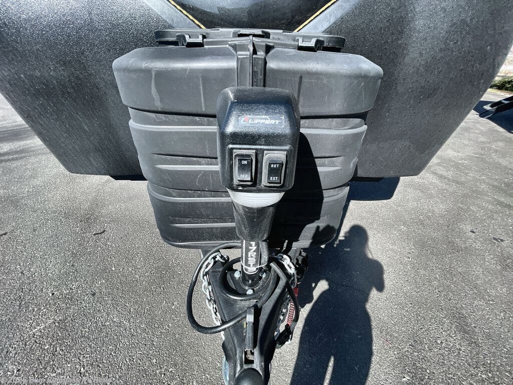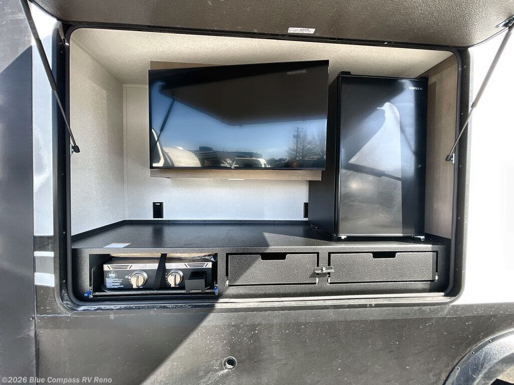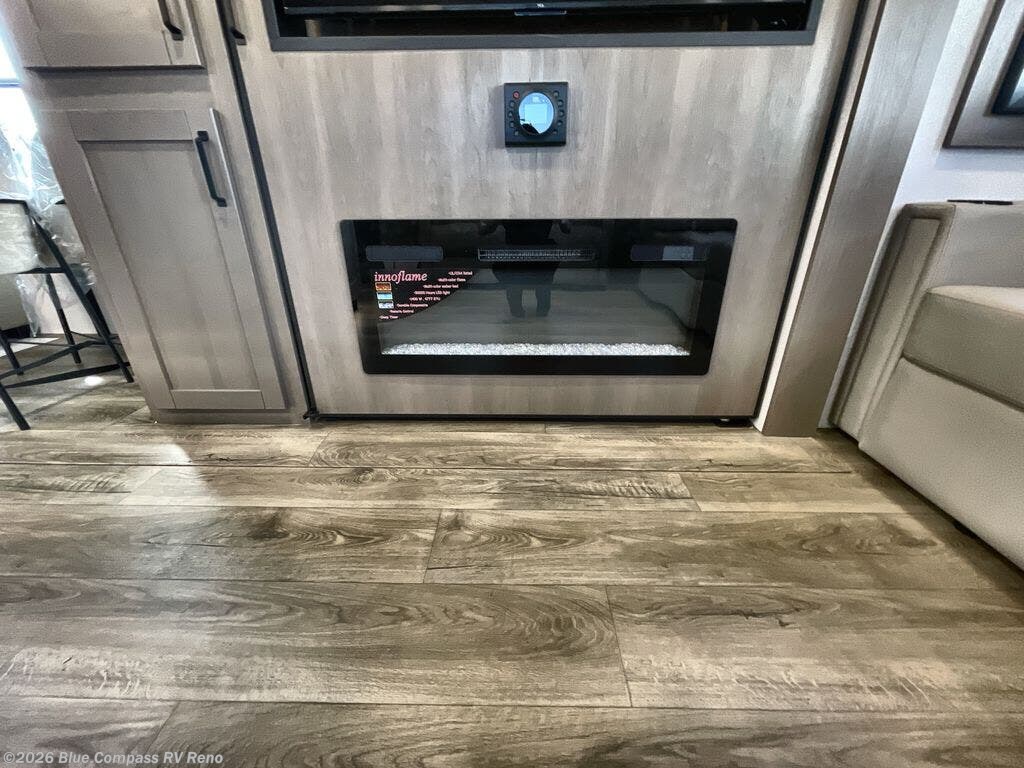 Whether you travel to explore or relax, this trailer will give you the choice depending where you park it! The kitchen amenities offer a gourmet kitchen including a 16 cu. ft. refrigerator, an island, and a hutch. You and your guests will find theater seating with cupholders, a booth dinette or optional swivel dinette, and a tri-fold sofa to sit on and visit while you watch the 40" LED HDTV with a fireplace below. The full bathroom includes a space saving sliding door and linen storage, and the bedroom gives you a front walk-around queen bed with storage for your clothes on each side. There is even washer and dryer prep here if you choose to go full-time. Outside, you'll find a 12' electric awning, an LP Quick Connect and Coax TV hookup, plus an exterior griddle, 4.1 cu. ft. refrigerator and outside spray port!