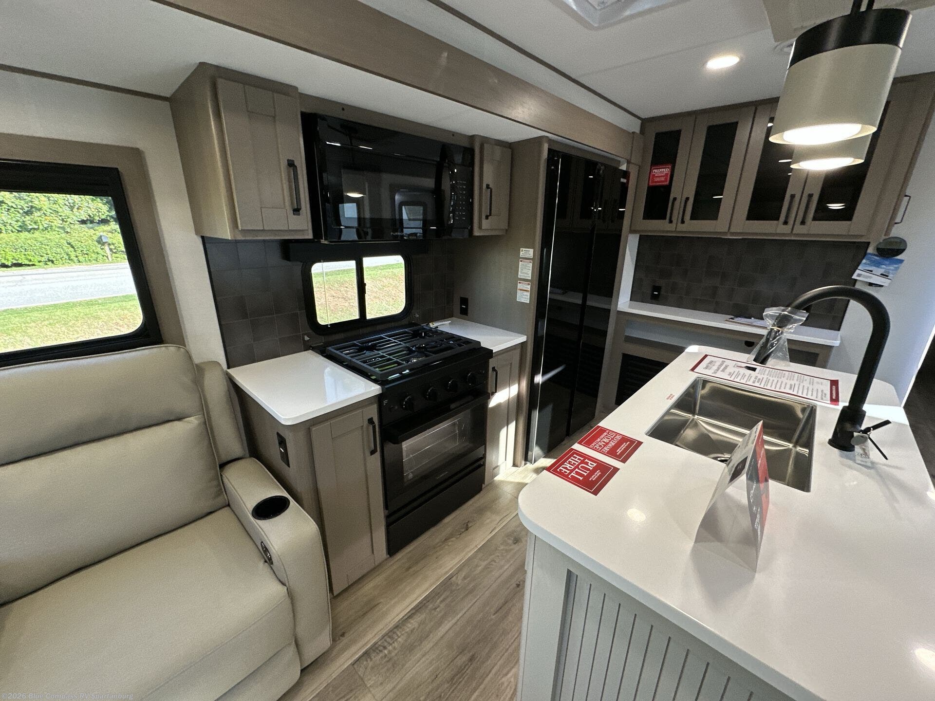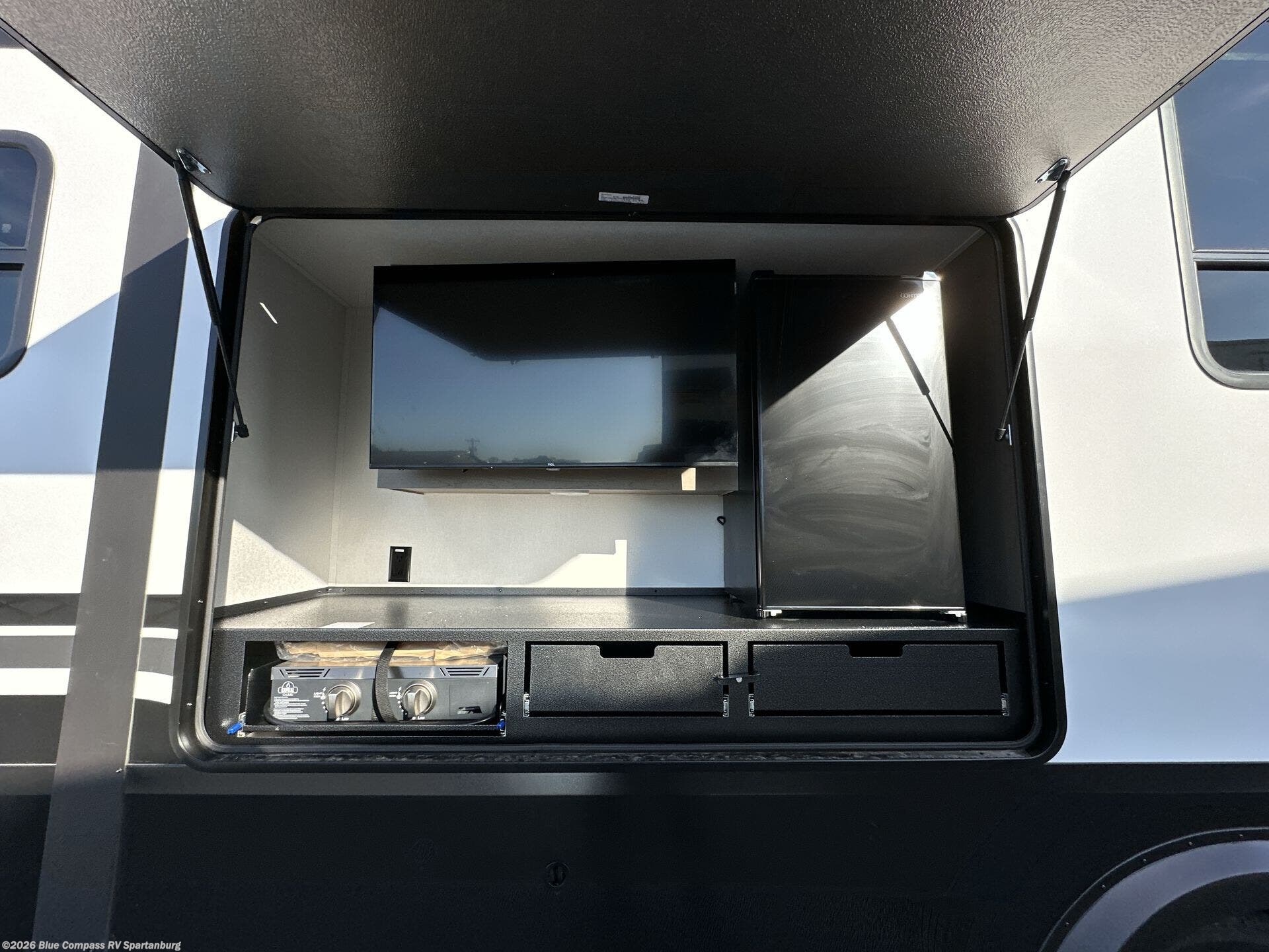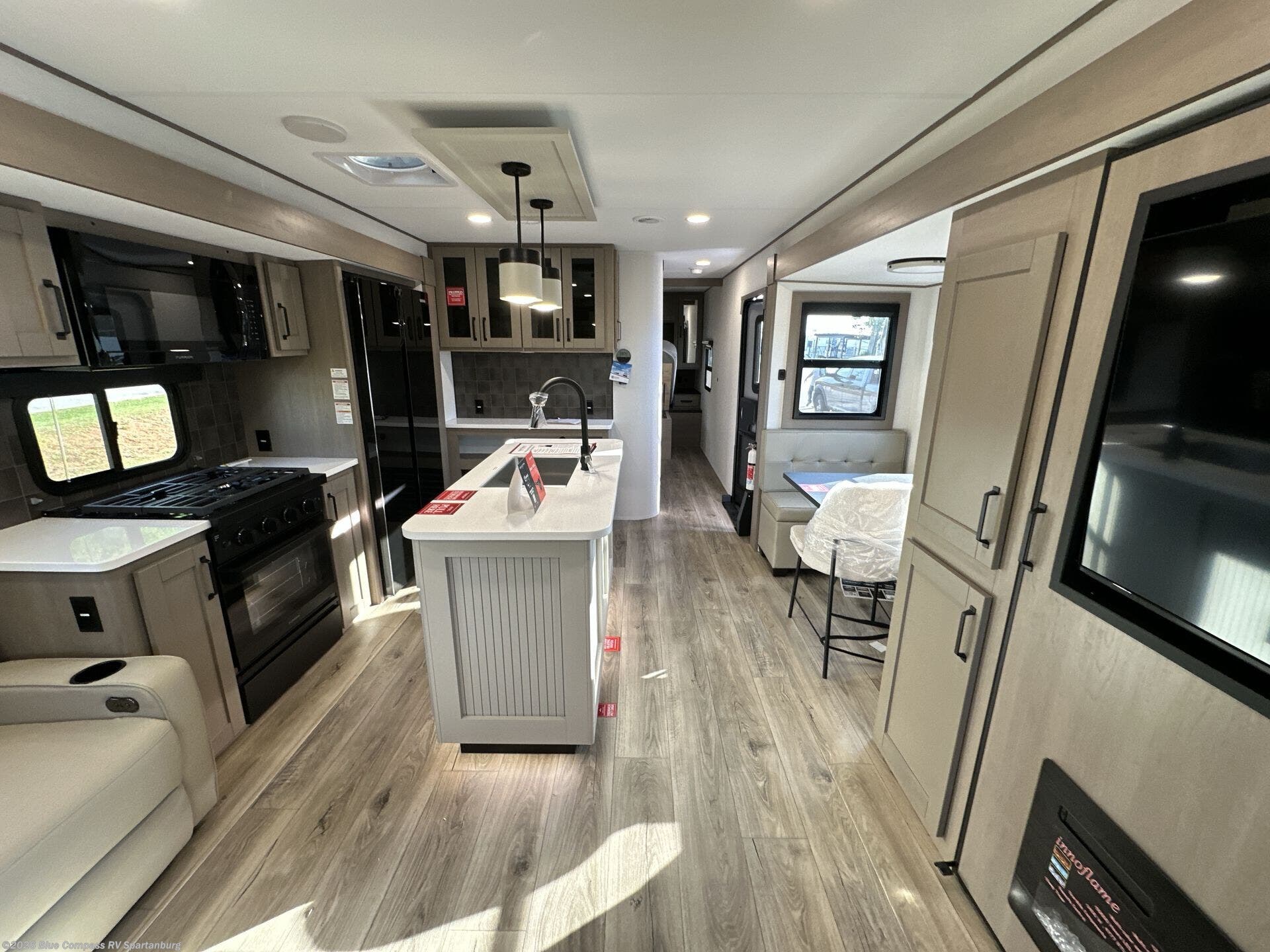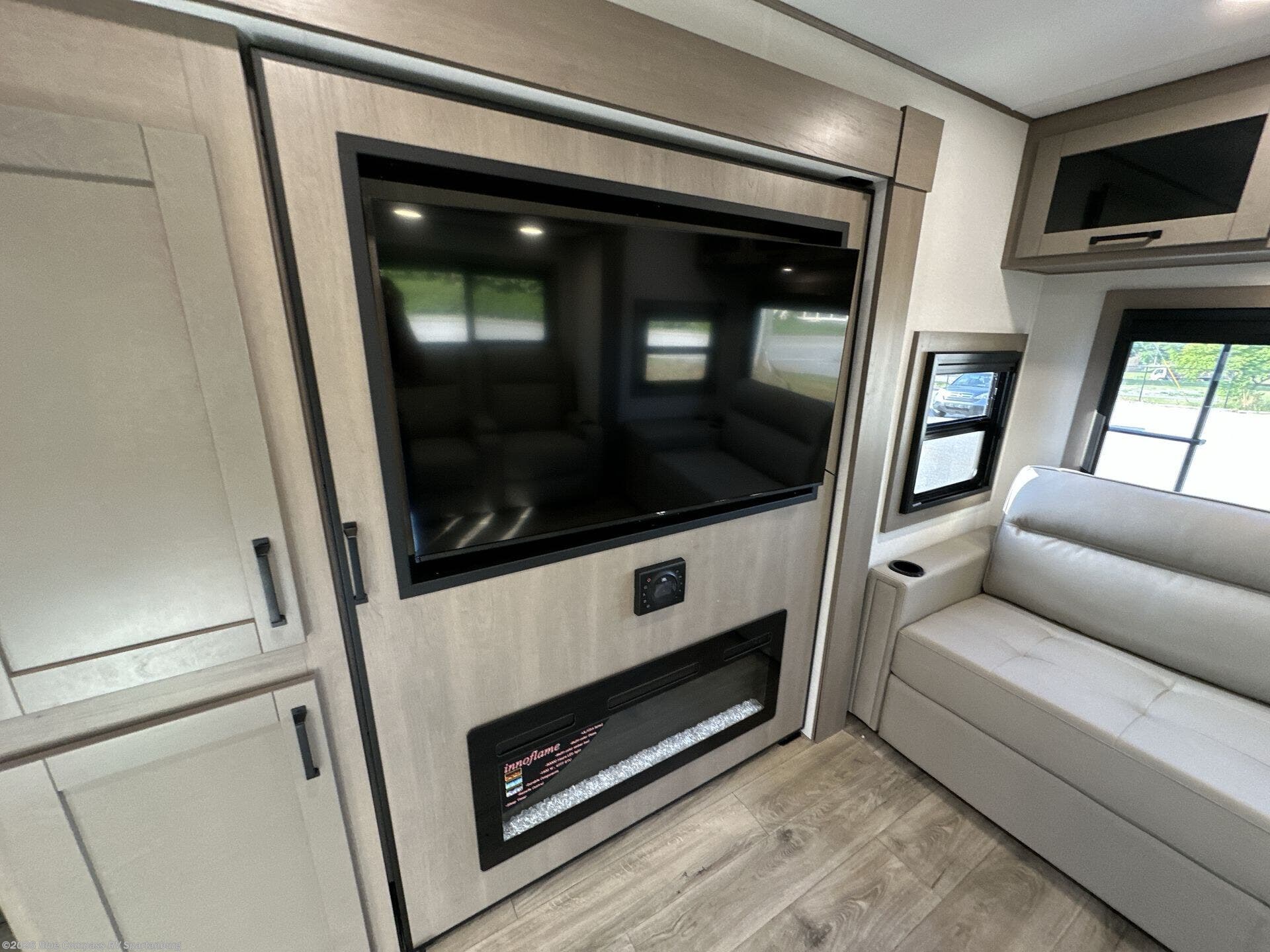 Whether you travel to explore or relax, this trailer will give you the choice depending where you park it! The kitchen amenities offer a gourmet kitchen including a 16 cu. ft. refrigerator, an island, and a hutch. You and your guests will find theater seating with cupholders, a booth dinette or optional swivel dinette, and a tri-fold sofa to sit on and visit while you watch the 40" LED HDTV with a fireplace below. The full bathroom includes a space saving sliding door and linen storage, and the bedroom gives you a front walk-around queen bed with storage for your clothes on each side. There is even washer and dryer prep here if you choose to go full-time. Outside, you'll find a 12' electric awning, an LP Quick Connect and Coax TV hookup, plus an exterior griddle, 4.1 cu. ft. refrigerator and outside spray port!
