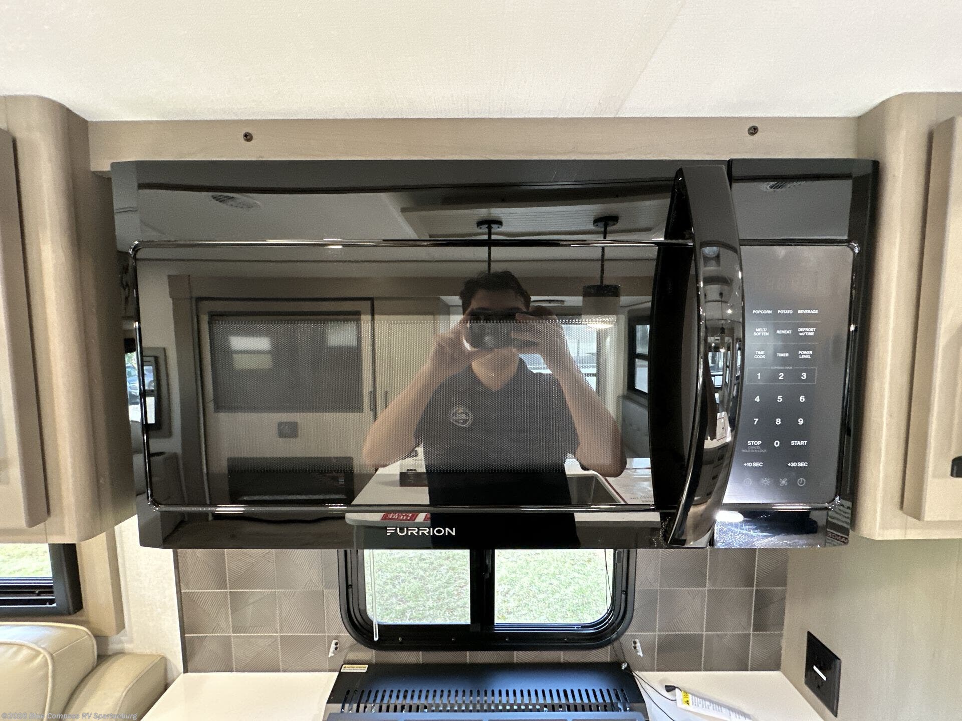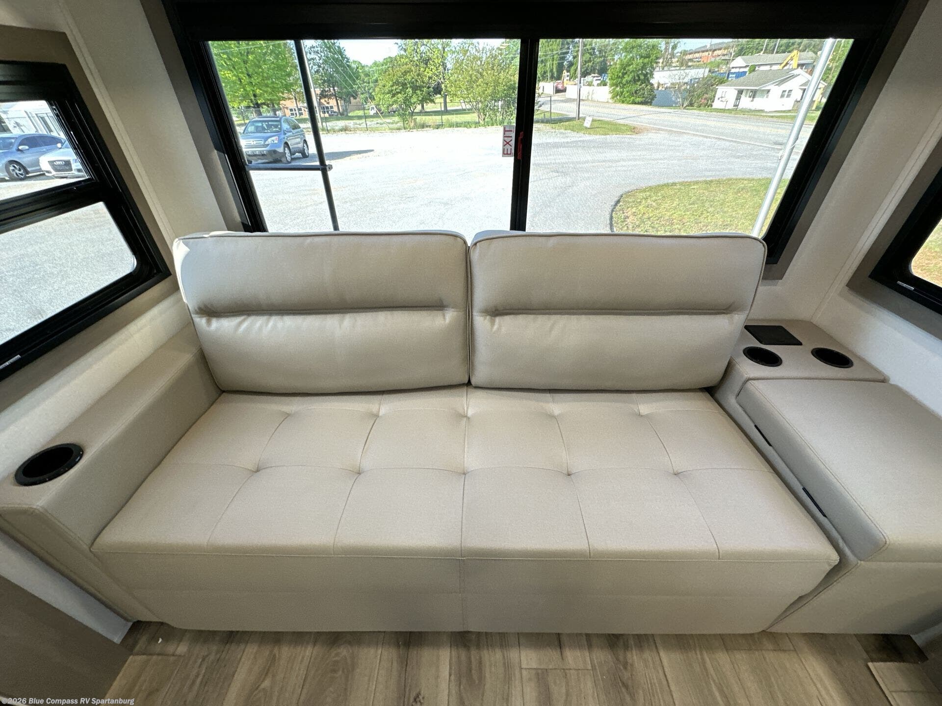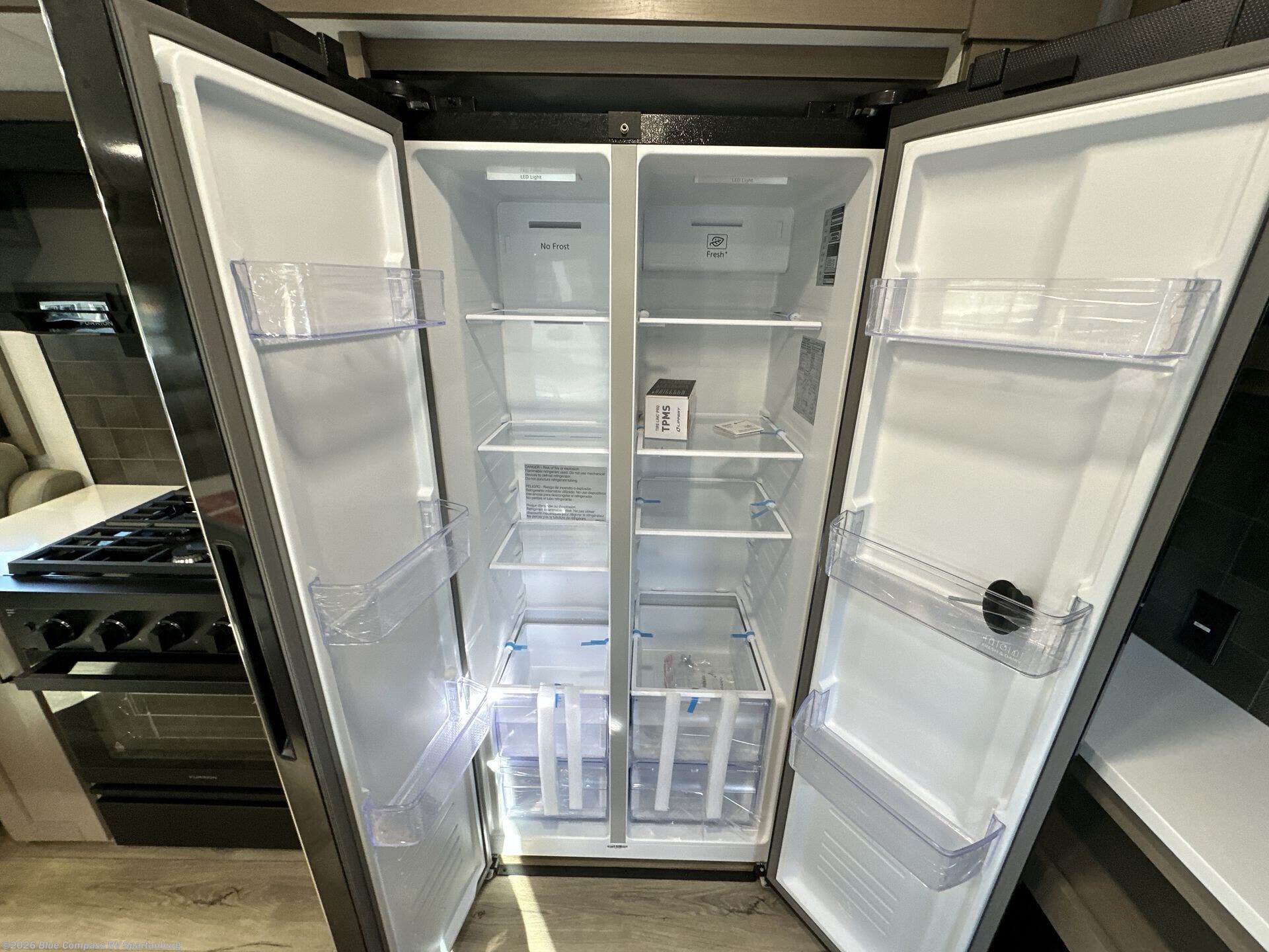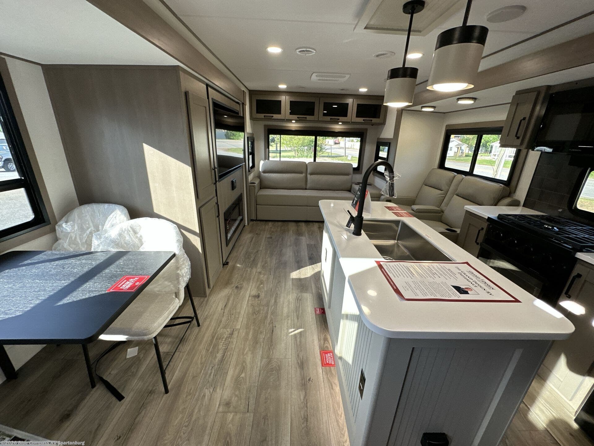 Whether you travel to explore or relax, this trailer will give you the choice depending where you park it! The kitchen amenities offer a gourmet kitchen including a 16 cu. ft. refrigerator, an island, and a hutch. You and your guests will find theater seating with cupholders, a booth dinette or optional swivel dinette, and a tri-fold sofa to sit on and visit while you watch the 40" LED HDTV with a fireplace below. The full bathroom includes a space saving sliding door and linen storage, and the bedroom gives you a front walk-around queen bed with storage for your clothes on each side. There is even washer and dryer prep here if you choose to go full-time. Outside, you'll find a 12' electric awning, an LP Quick Connect and Coax TV hookup, plus an exterior griddle, 4.1 cu. ft. refrigerator and outside spray port!