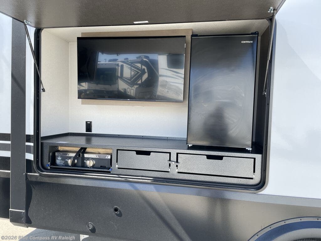 Whether you travel to explore or relax, this trailer will give you the choice depending where you park it! The kitchen amenities offer a gourmet kitchen including a 16 cu. ft. refrigerator, an island, and a hutch. You and your guests will find theater seating with cupholders, a booth dinette or optional swivel dinette, and a tri-fold sofa to sit on and visit while you watch the 40" LED HDTV with a fireplace below. The full bathroom includes a space saving sliding door and linen storage, and the bedroom gives you a front walk-around queen bed with storage for your clothes on each side. There is even washer and dryer prep here if you choose to go full-time. Outside, you'll find a 12' electric awning, an LP Quick Connect and Coax TV hookup, plus an exterior griddle, 4.1 cu. ft. refrigerator and outside spray port!