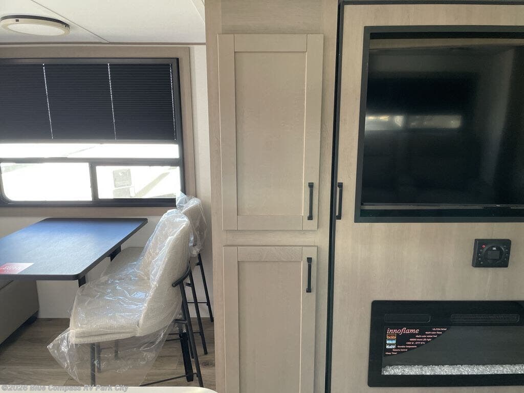 Whether you travel to explore or relax, this trailer will give you the choice depending where you park it! The kitchen amenities offer a gourmet kitchen including a 16 cu. ft. refrigerator, an island, and a hutch. You and your guests will find theater seating with cupholders, a booth dinette or optional swivel dinette, and a tri-fold sofa to sit on and visit while you watch the 40" LED HDTV with a fireplace below. The full bathroom includes a space saving sliding door and linen storage, and the bedroom gives you a front walk-around queen bed with storage for your clothes on each side. There is even washer and dryer prep here if you choose to go full-time. Outside, you'll find a 12' electric awning, an LP Quick Connect and Coax TV hookup, plus an exterior griddle, 4.1 cu. ft. refrigerator and outside spray port!