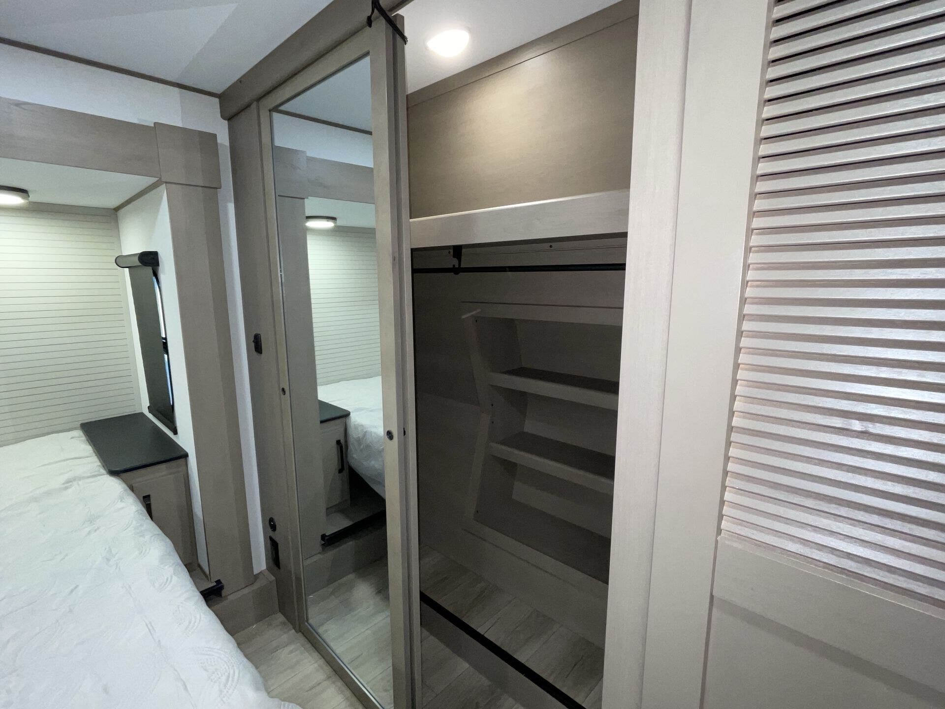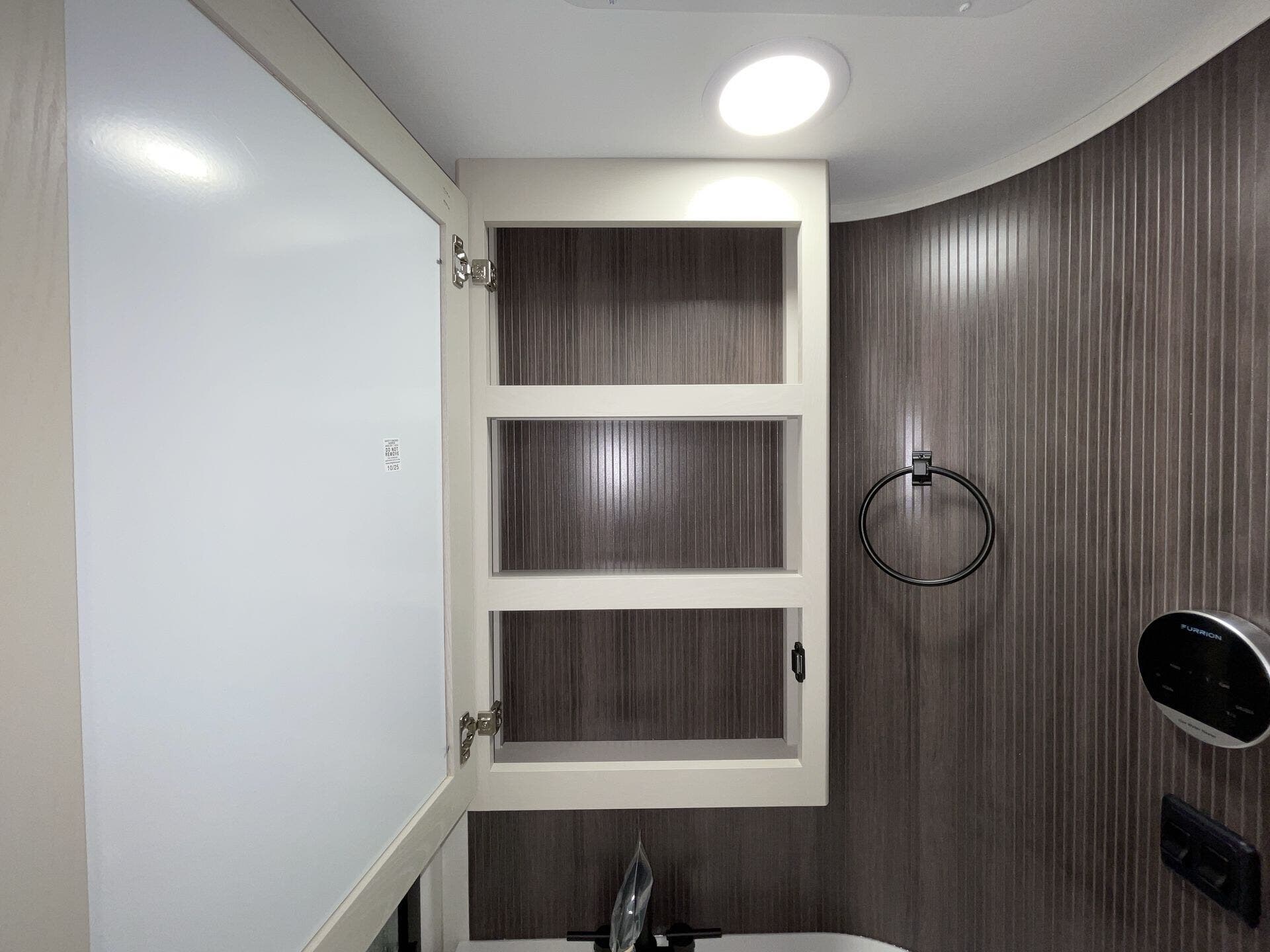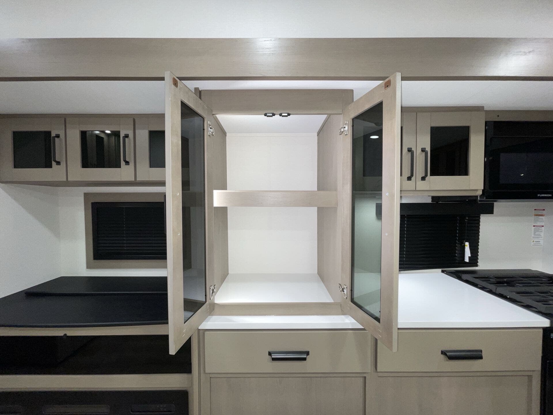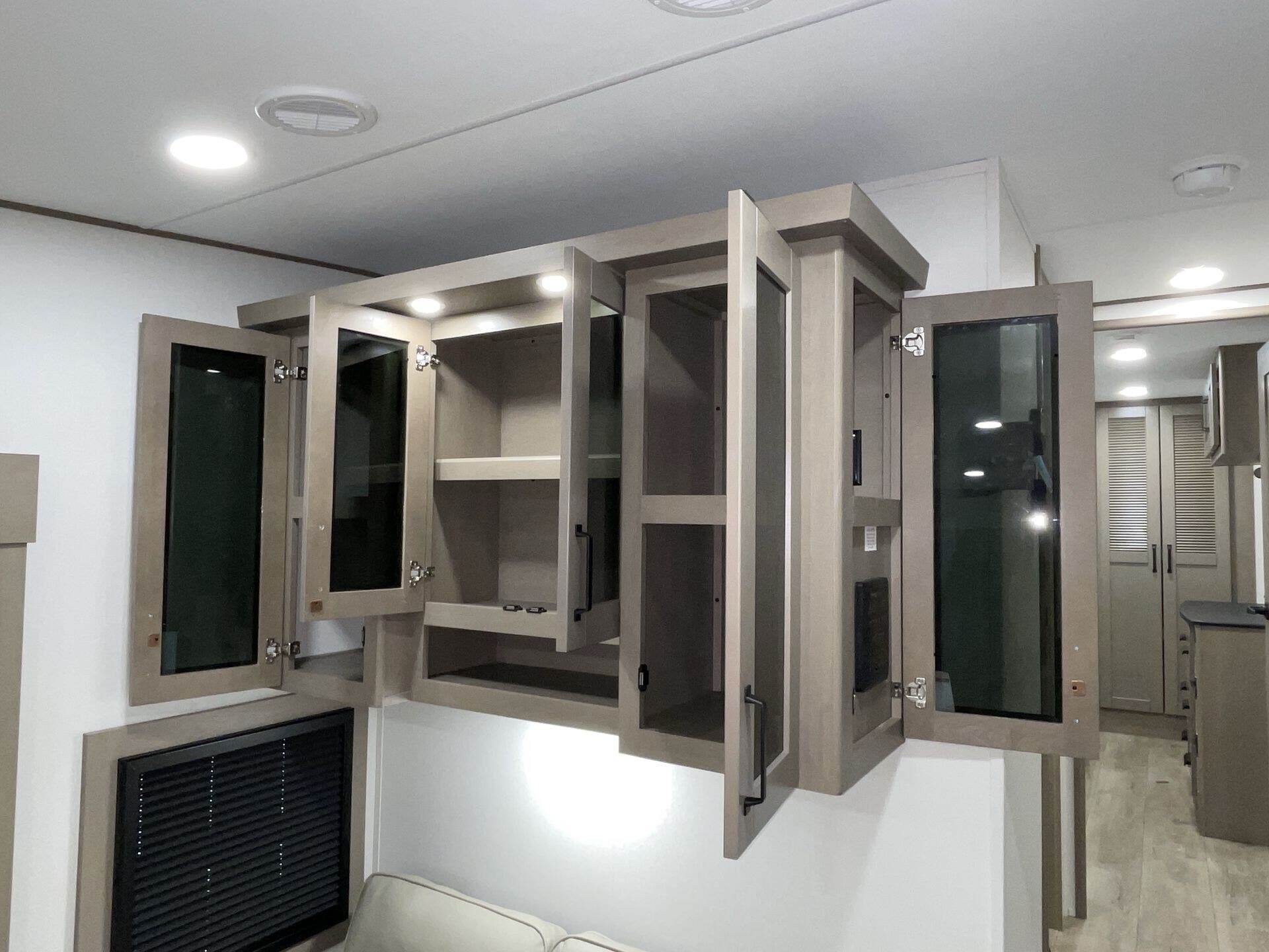 Booth Dinette, Computer Station, Day/Night Shades, Dinette, Island Kitchen, Kitchen Sink, Medicine Cabinet, Overhead Cabinetry, Pantry, Roof Vents, Shower, Solid Surface Countertops, Theater Seating, Toilet, Vanity, Wardrobe(s)