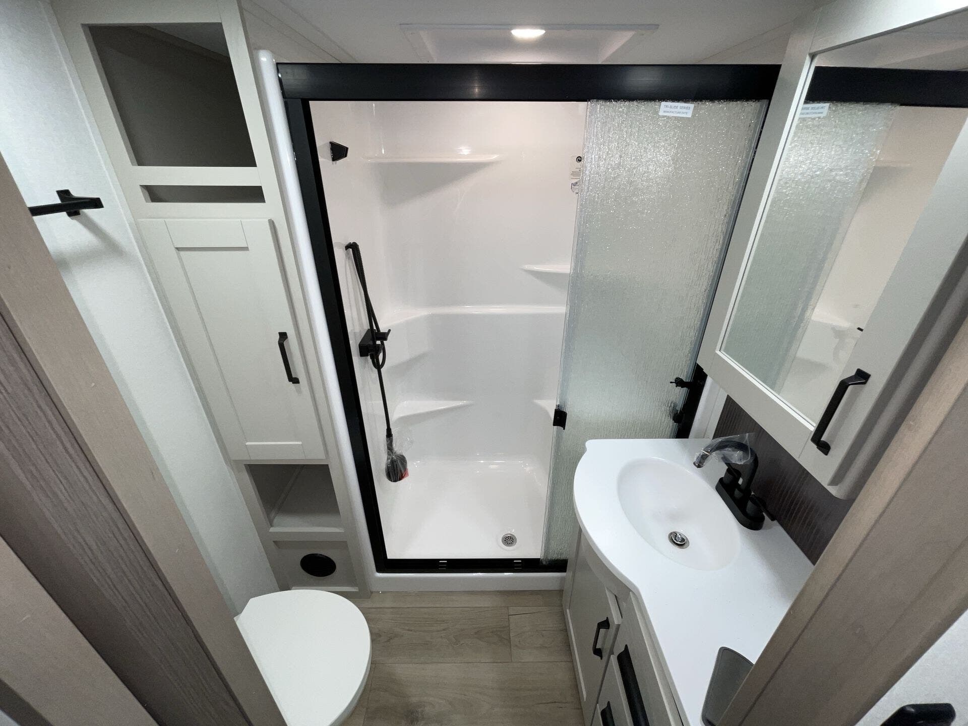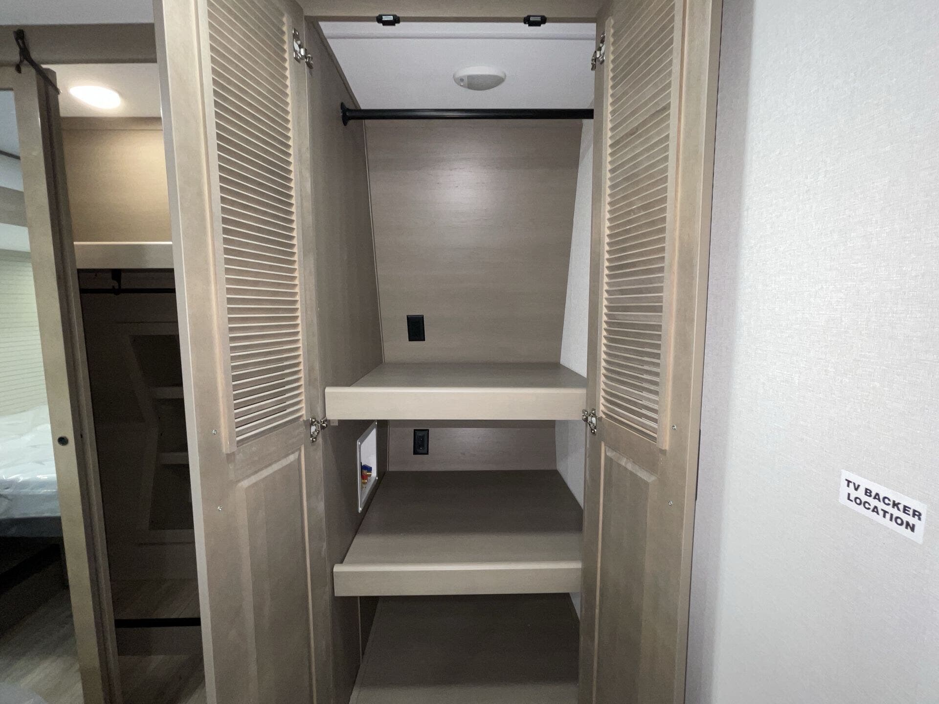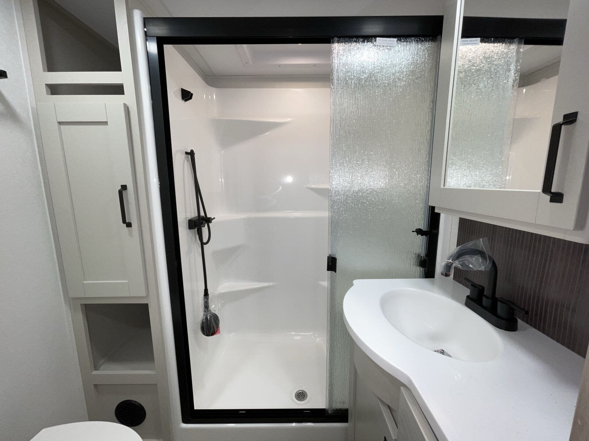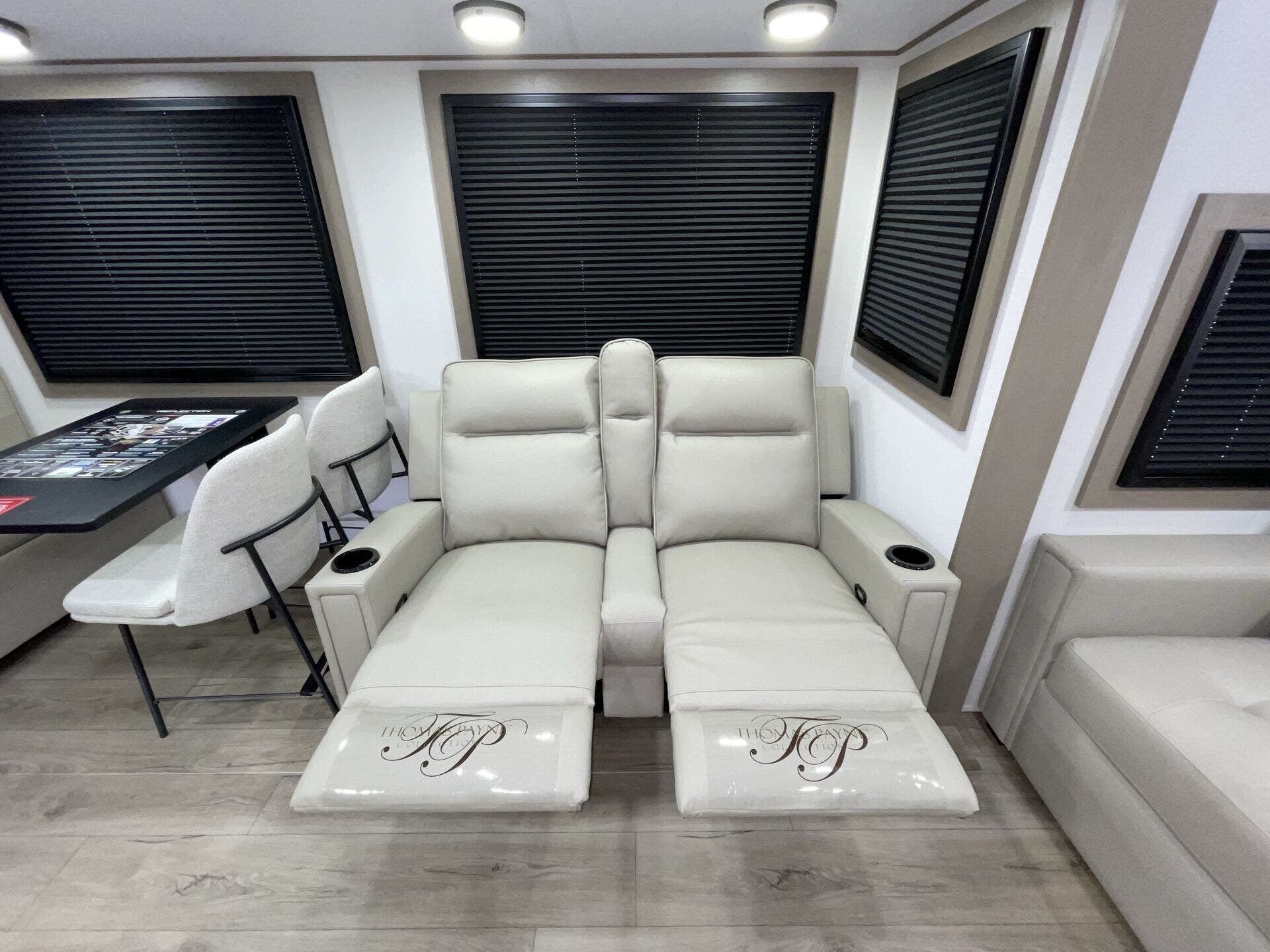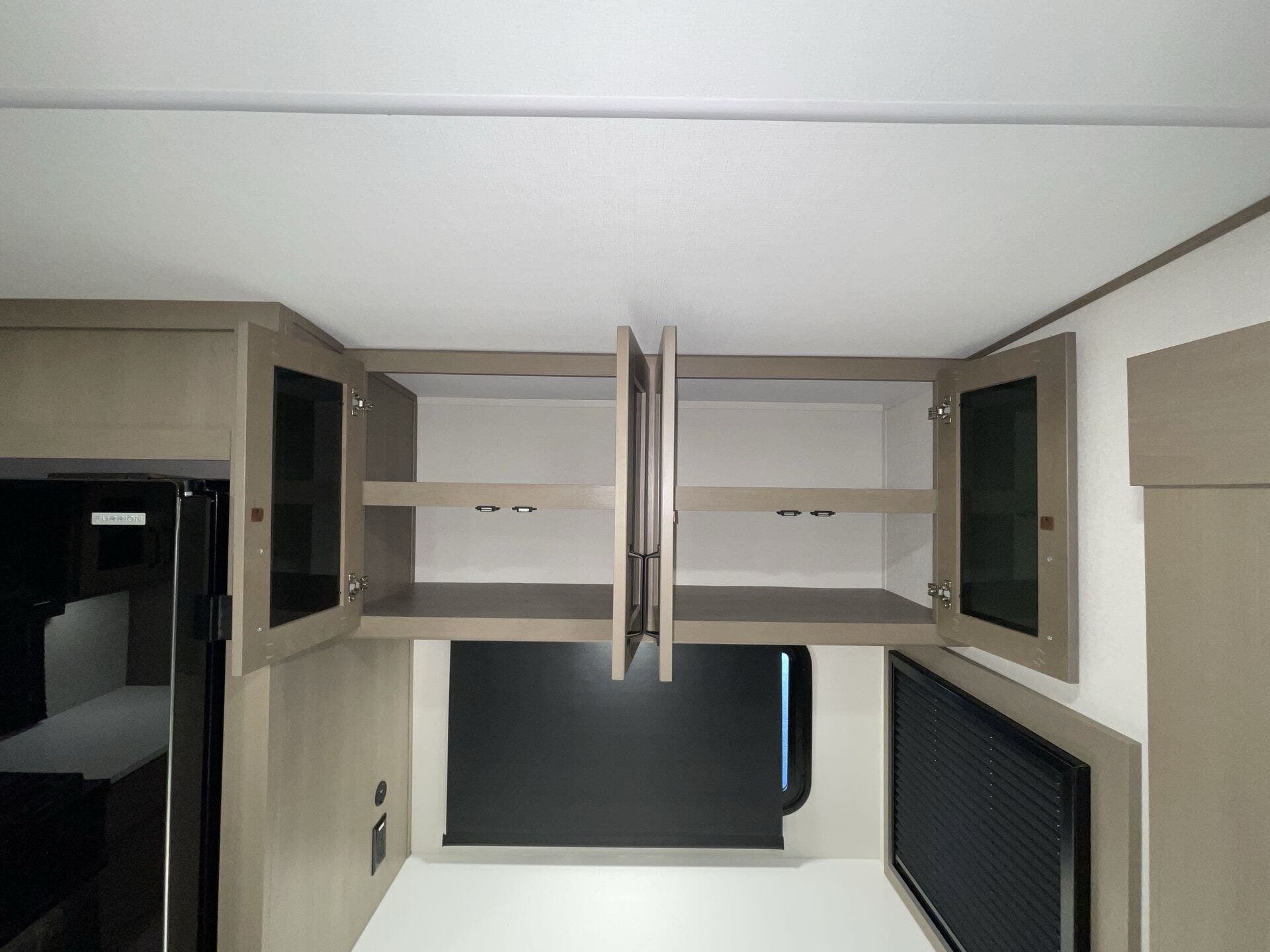 Booth Dinette, Computer Station, Day/Night Shades, Dinette, Island Kitchen, Kitchen Sink, Medicine Cabinet, Overhead Cabinetry, Pantry, Roof Vents, Shower, Solid Surface Countertops, Theater Seating, Toilet, Vanity, Wardrobe(s)