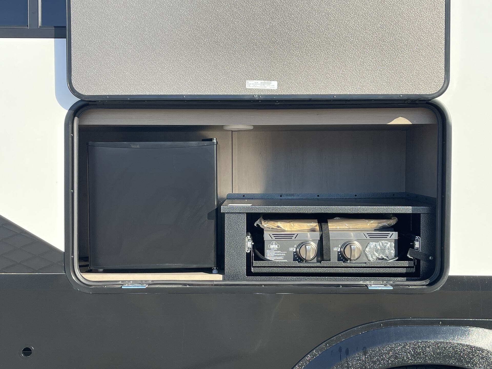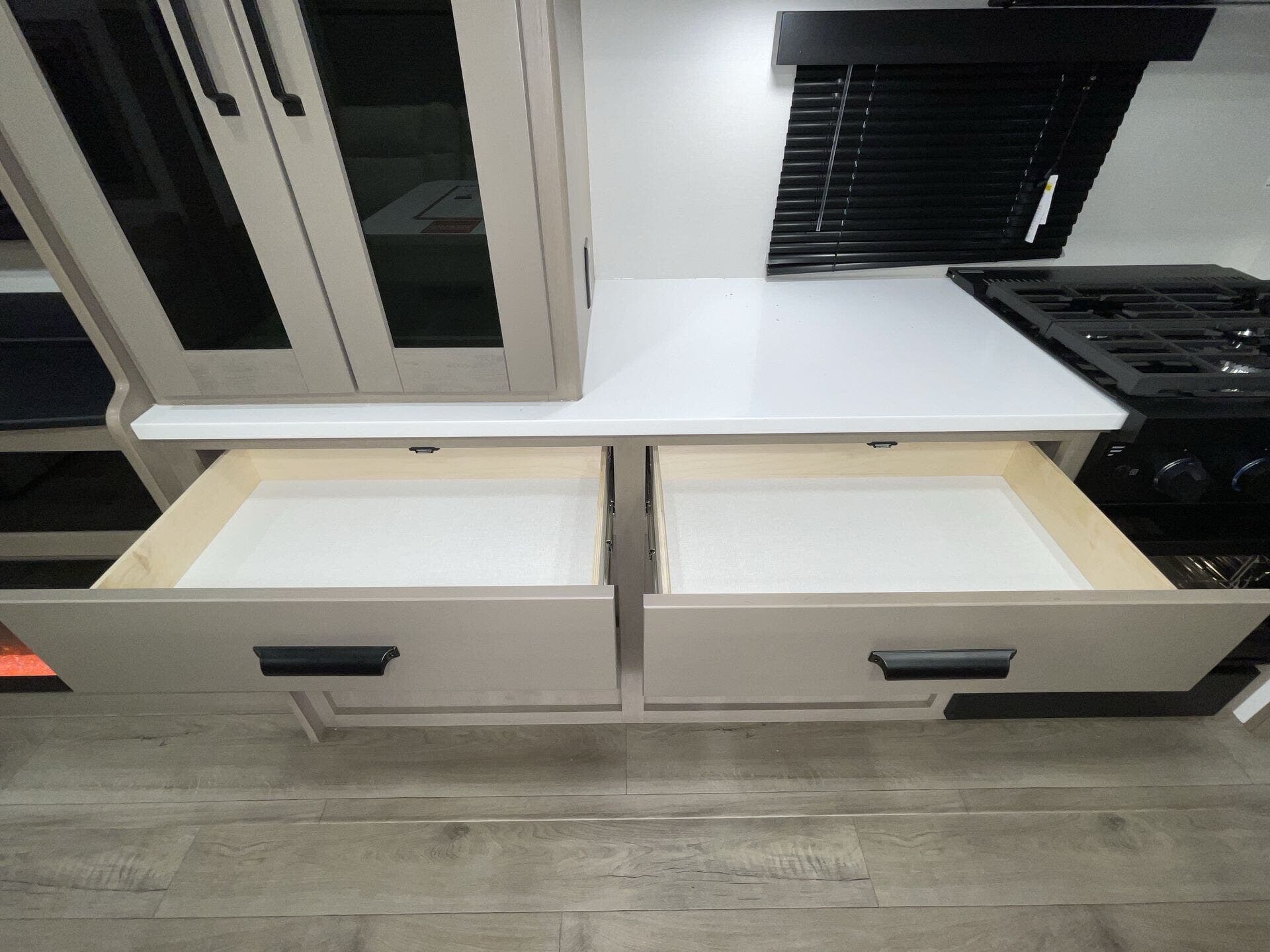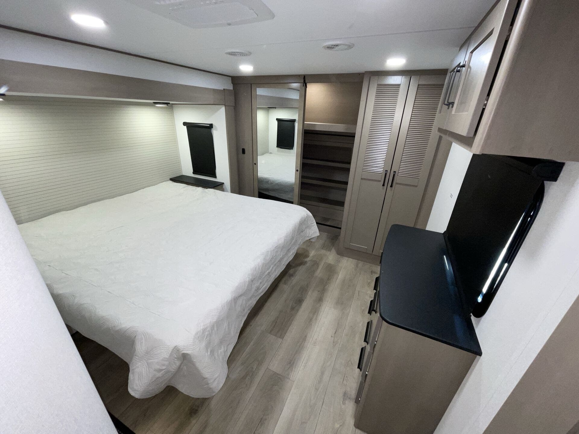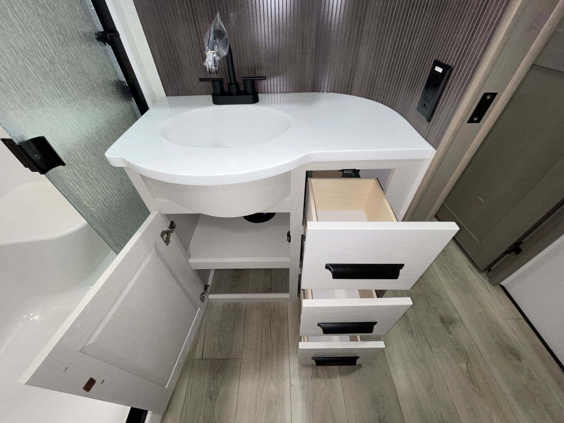 Premium features: 16 cu ft fridge, solid-surface counters, pass-through storage & power awning