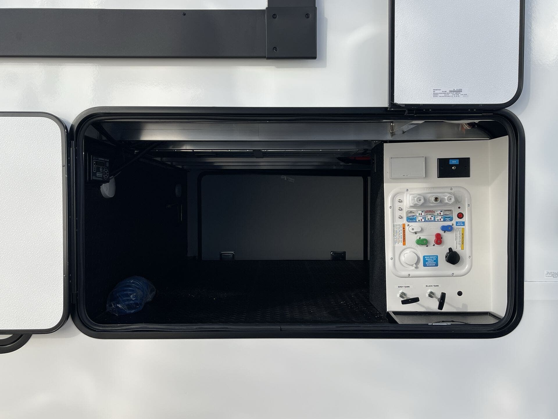 Big holding tanks (fresh ~74 gal, grey ~94 gal, black ~47 gal) — fewer pit stops