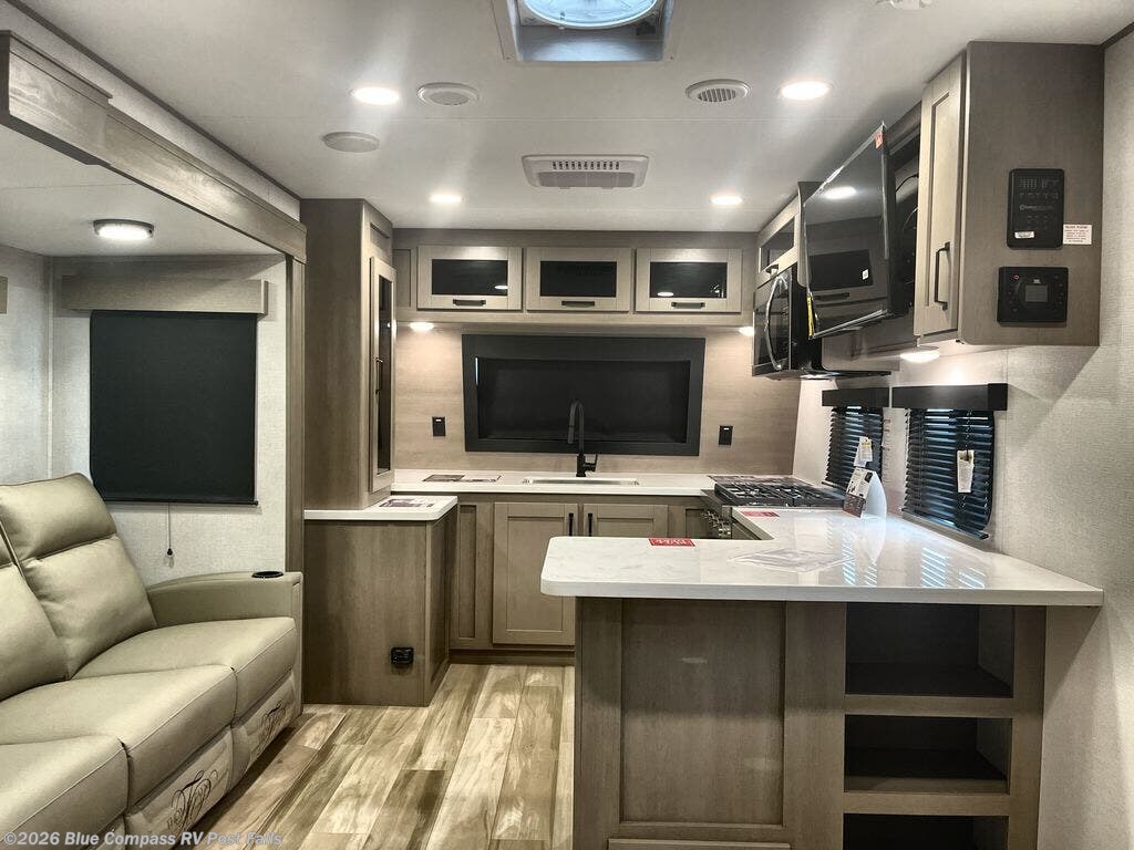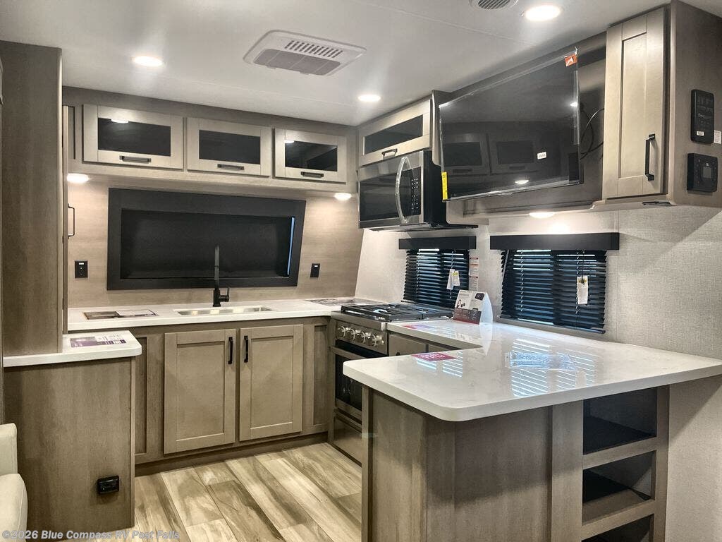 This front kitchen travel trailer will be perfect for camping trips to the lake or woods! There is ample counter space to prep your best meals, including an L-shaped kitchen counter with a bar stool to enjoy your coffee at. The theater seating is inviting, and you can choose the optional tri-fold sofa and end table or optional U-shaped dinette if you need more sleeping space for guests. This unit features a massive master bedroom with a queen bed slide and optional king bed, two closets, and a spacious rear bath. There are two bath sinks here, a 30" x 48" shower, plus washer and dryer prep if you choose to add these appliances!