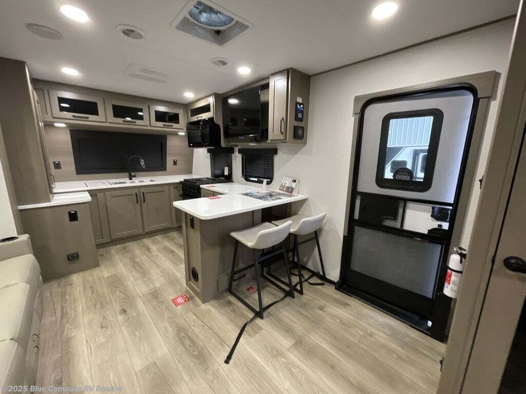 This front kitchen travel trailer will be perfect for camping trips to the lake or woods! There is ample counter space to prep your best meals, including an L-shaped kitchen counter with a bar stool to enjoy your coffee at. The theater seating is inviting, and you can choose the optional tri-fold sofa and end table or optional U-shaped dinette if you need more sleeping space for guests. This unit features a massive master bedroom with a queen bed slide and optional king bed, two closets, and a spacious rear bath. There are two bath sinks here, a 30" x 48" shower, plus washer and dryer prep if you choose to add these appliances!