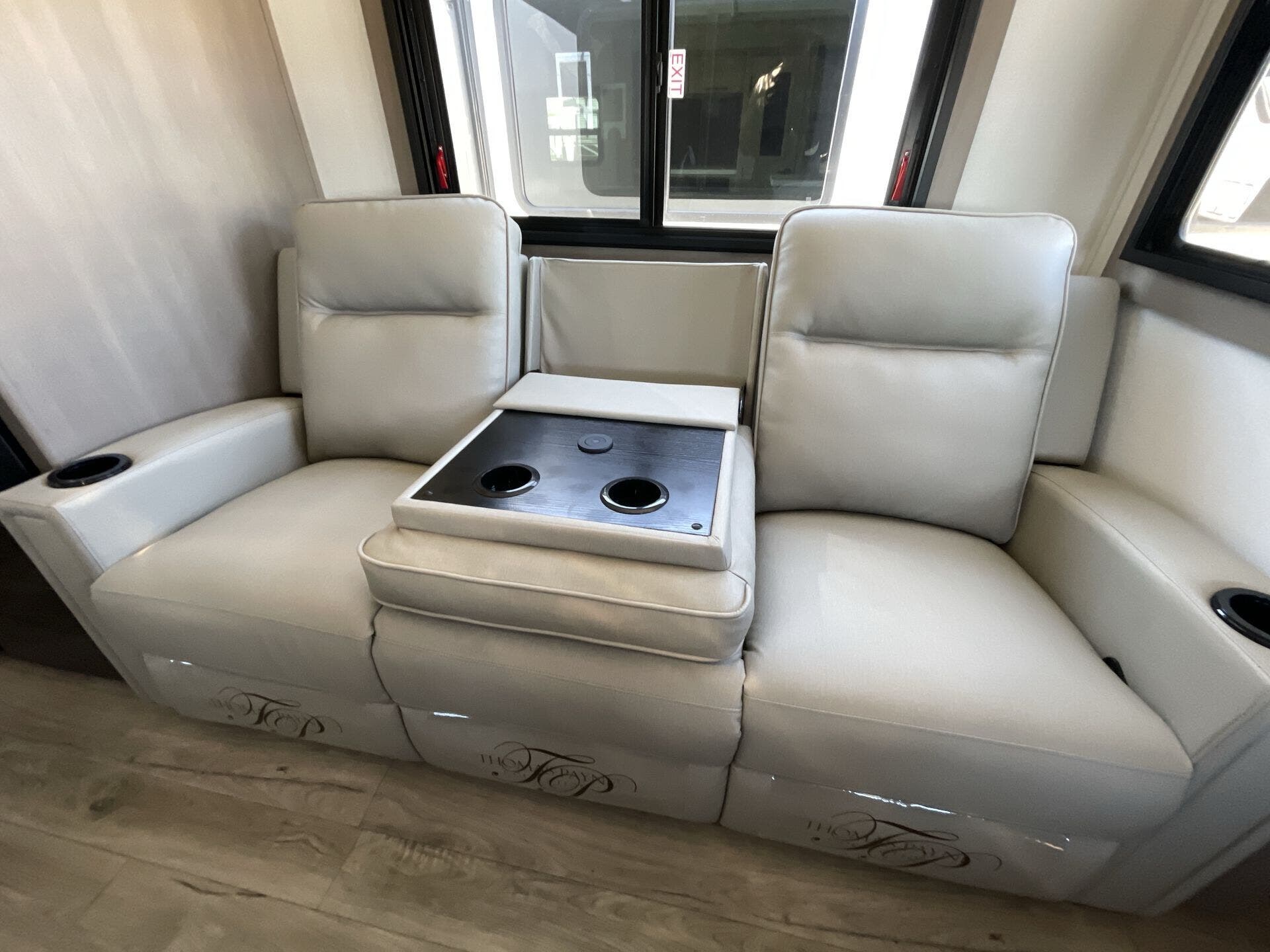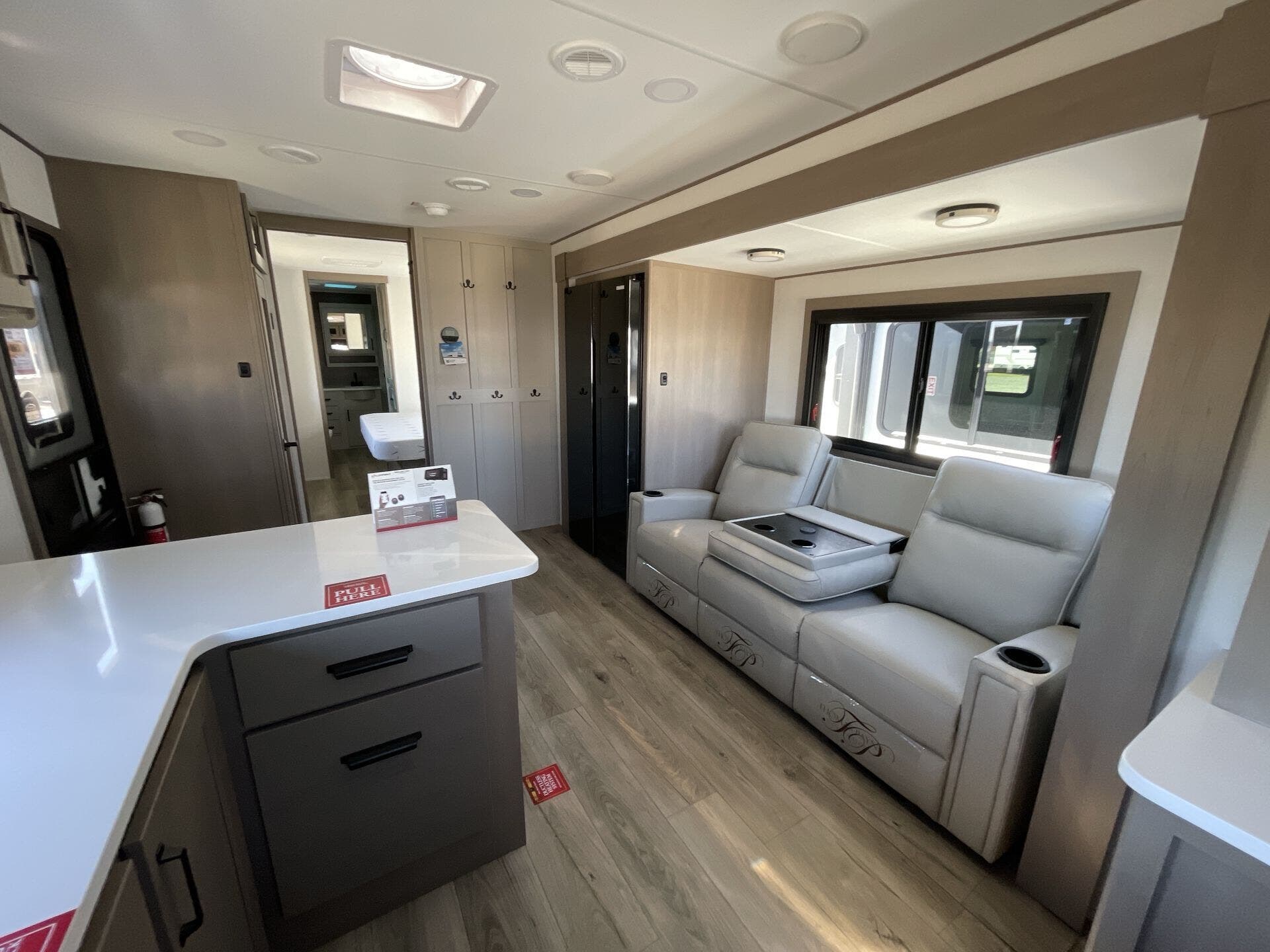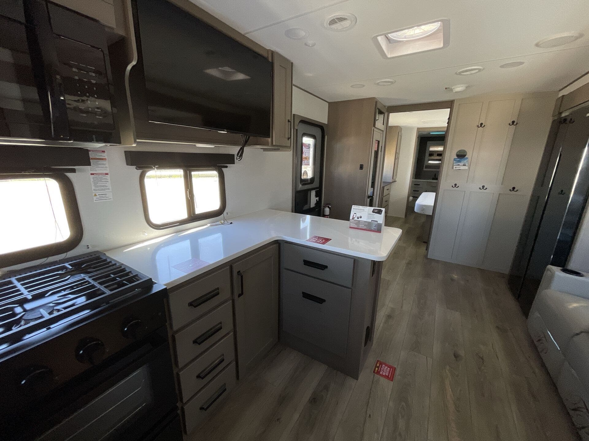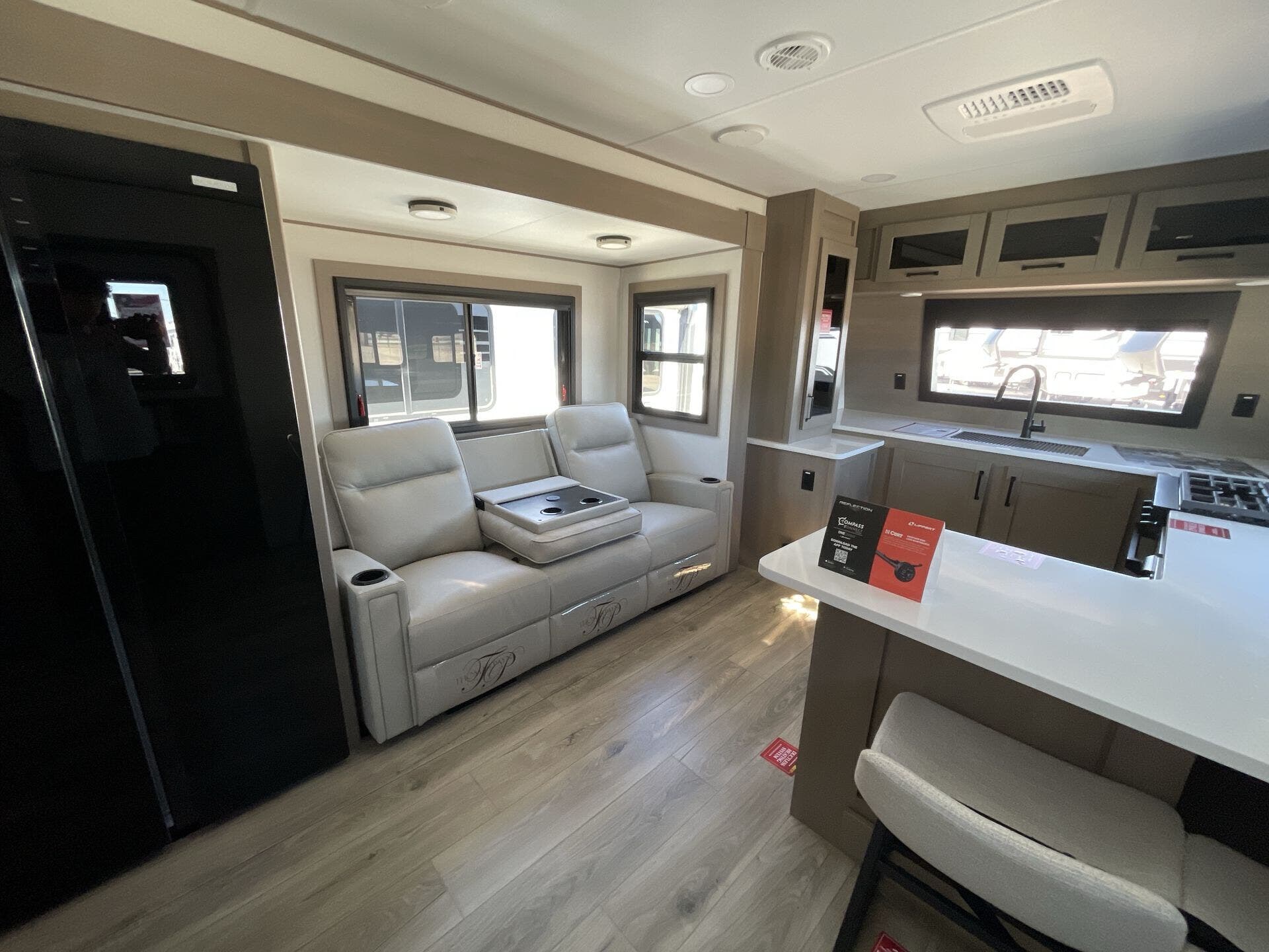 Inside, the 322FKTS features a gourmet kitchen with solid-surface countertops, a large island, stainless steel appliances, and abundant cabinetry, making meal preparation effortless and enjoyable. The living area is designed for relaxation and entertainment, offering theater seating, a tri-fold sofa, and a centrally located entertainment center. Large panoramic windows bring in natural light and provide scenic views, creating an open, airy, and inviting atmosphere throughout the main living space.
