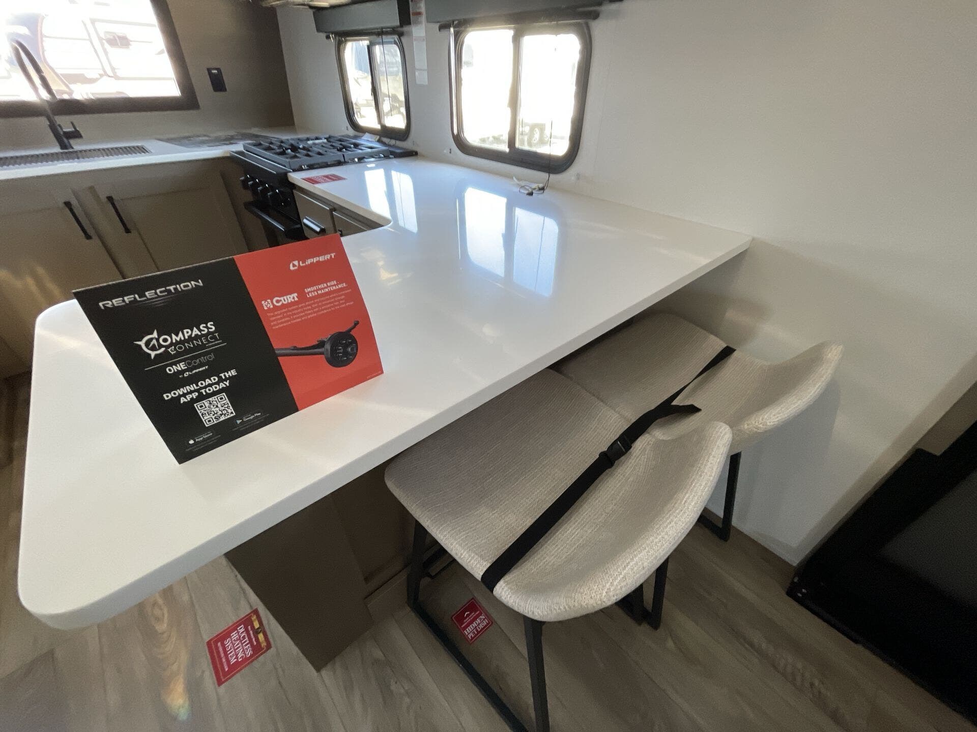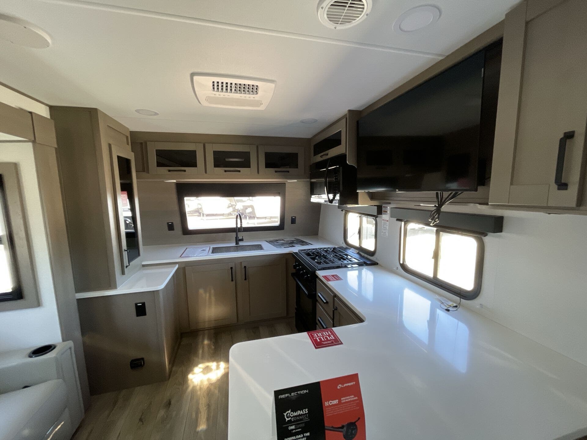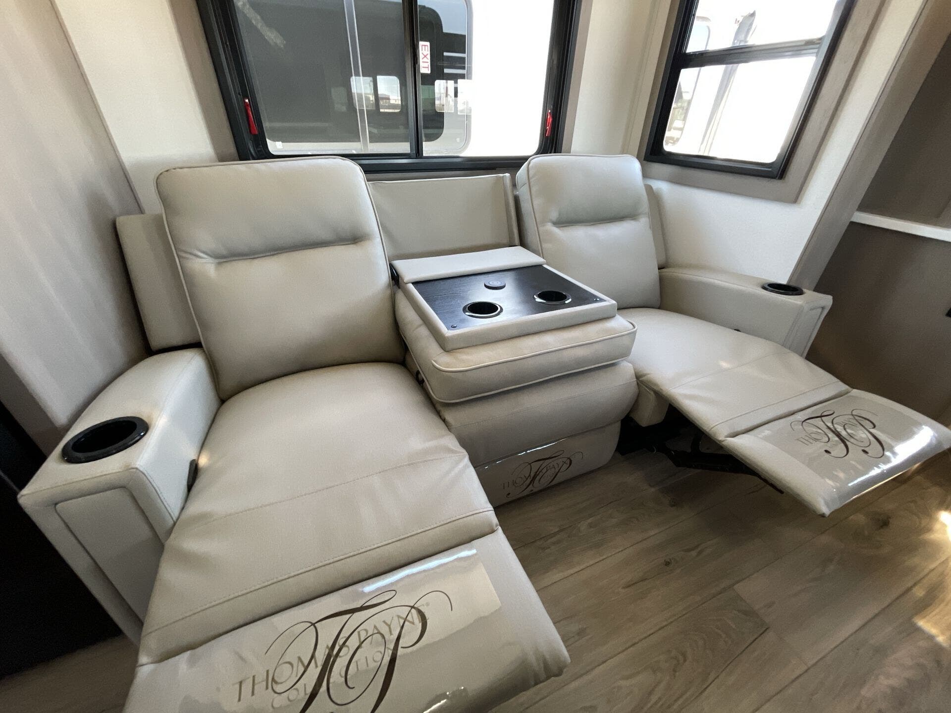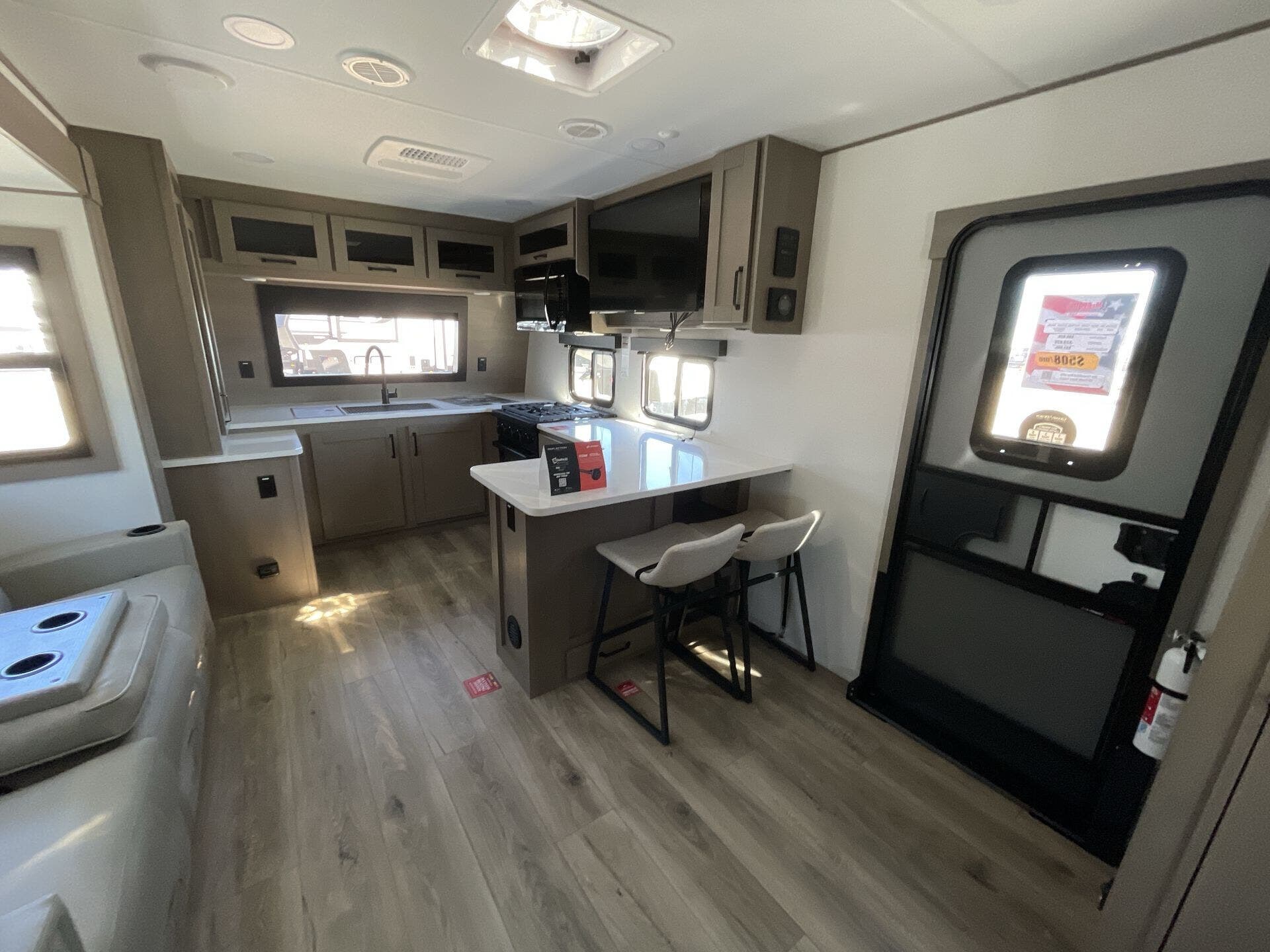 Inside, the 322FKTS features a gourmet kitchen with solid-surface countertops, a large island, stainless steel appliances, and abundant cabinetry, making meal preparation effortless and enjoyable. The living area is designed for relaxation and entertainment, offering theater seating, a tri-fold sofa, and a centrally located entertainment center. Large panoramic windows bring in natural light and provide scenic views, creating an open, airy, and inviting atmosphere throughout the main living space.