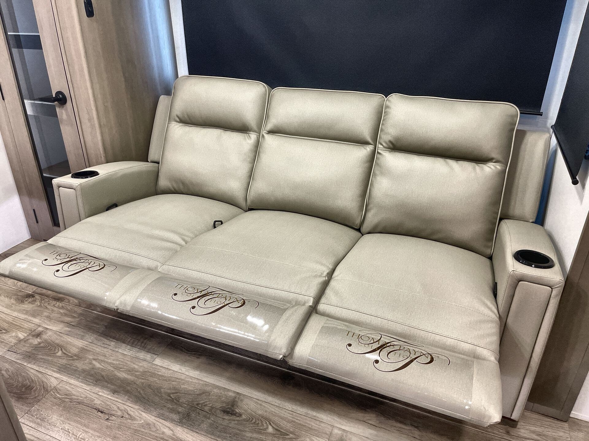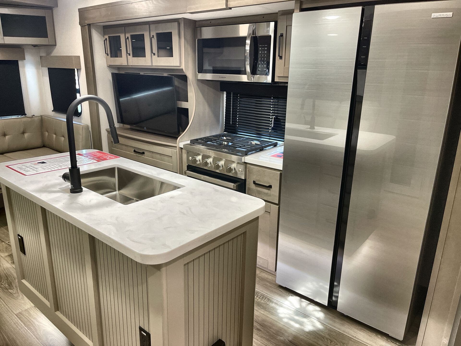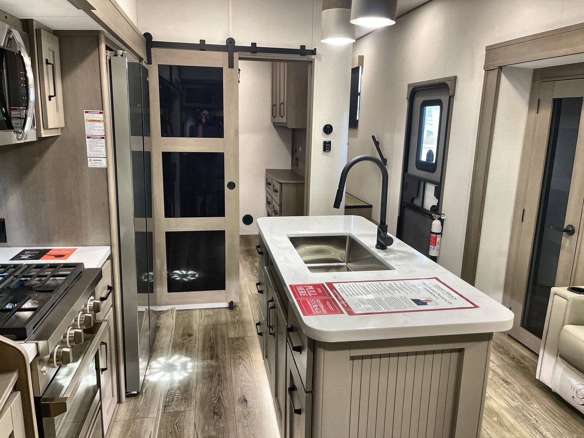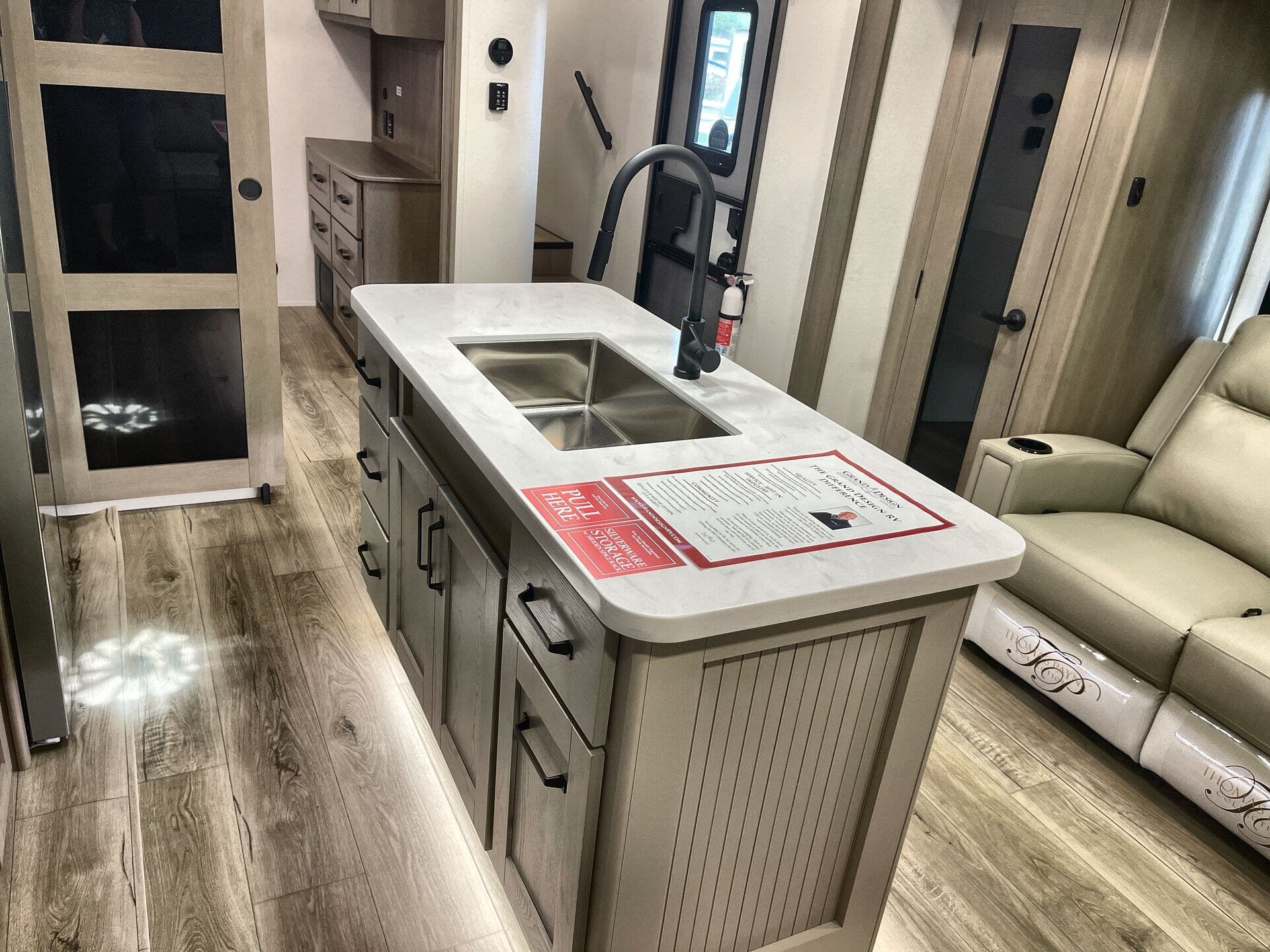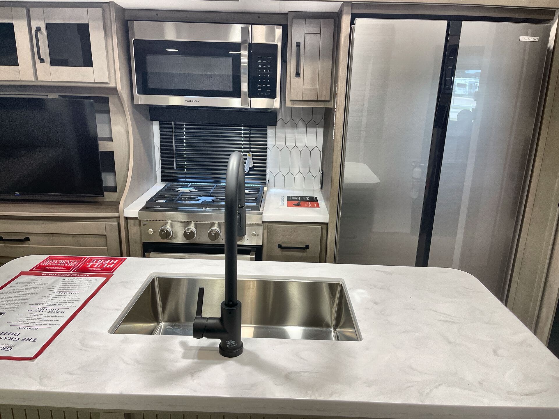 Inside, you’ll find a bright, open-concept living area with opposing slides that create a roomy, residential feel. The rear living room features theater seating, a tri-fold sleeper sofa, a 50" LED TV, and a cozy electric fireplace. The gourmet kitchen includes a center island with a deep stainless steel sink, solid surface countertops, a residential refrigerator, and a large pantry for all your storage needs. The mid-bunk room offers additional sleeping or working space with a tri-fold sofa and overhead bunk, plus dedicated storage.