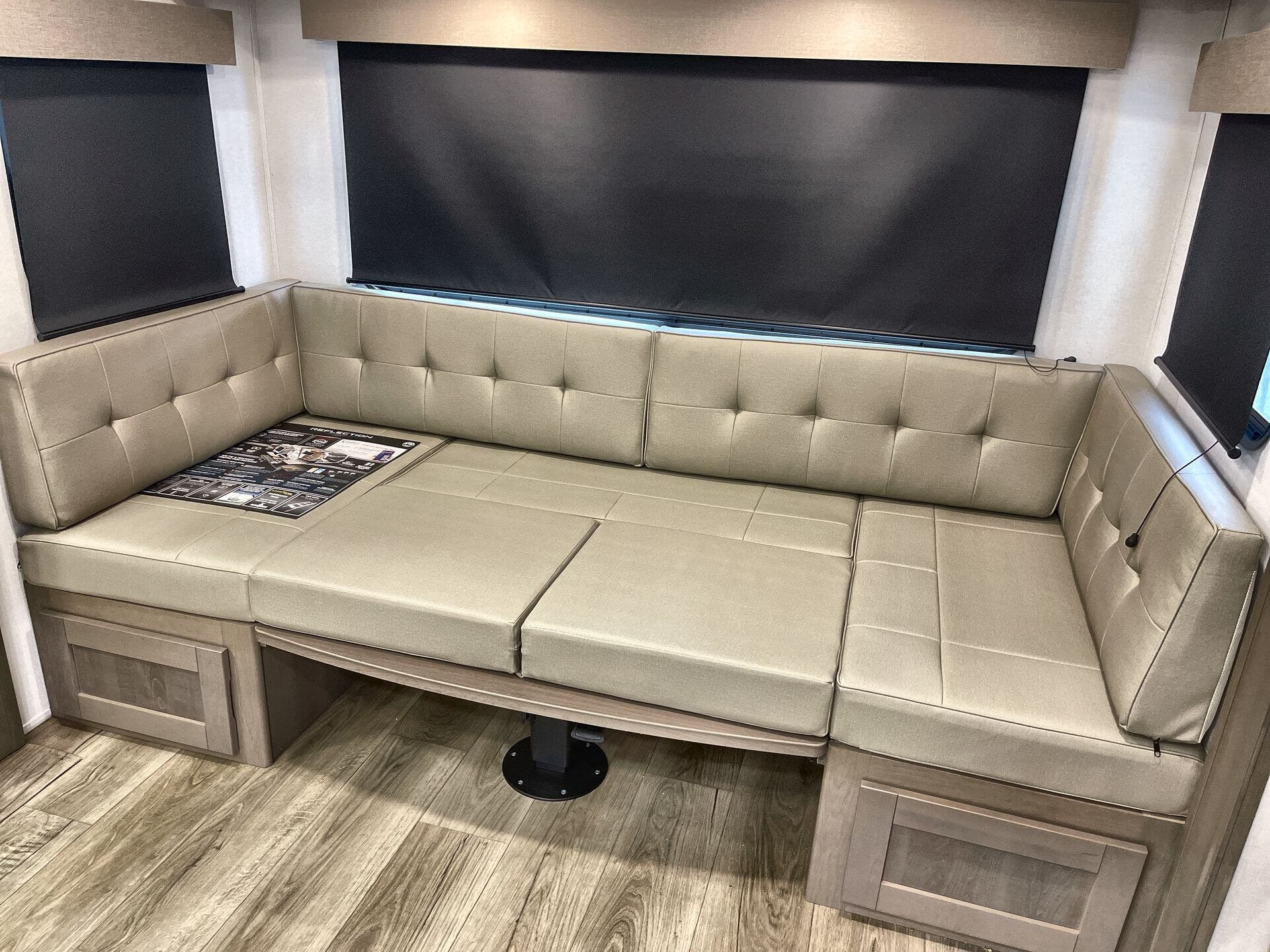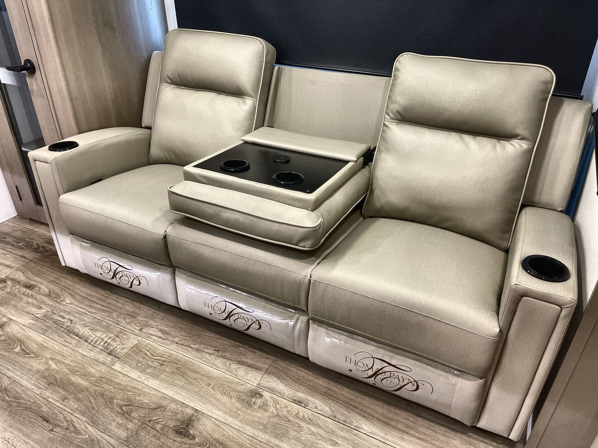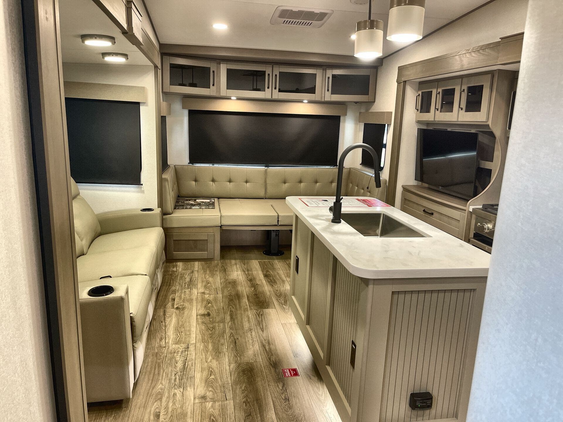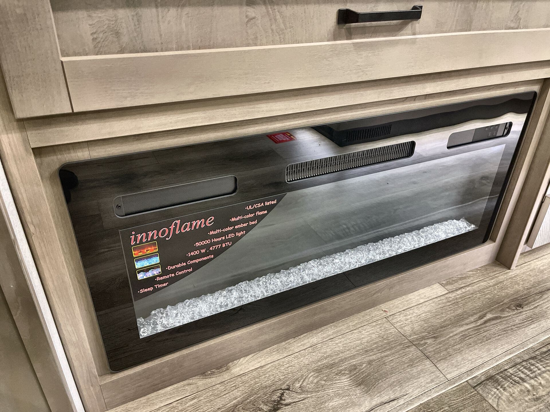 Inside, you’ll find a bright, open-concept living area with opposing slides that create a roomy, residential feel. The rear living room features theater seating, a tri-fold sleeper sofa, a 50" LED TV, and a cozy electric fireplace. The gourmet kitchen includes a center island with a deep stainless steel sink, solid surface countertops, a residential refrigerator, and a large pantry for all your storage needs. The mid-bunk room offers additional sleeping or working space with a tri-fold sofa and overhead bunk, plus dedicated storage.