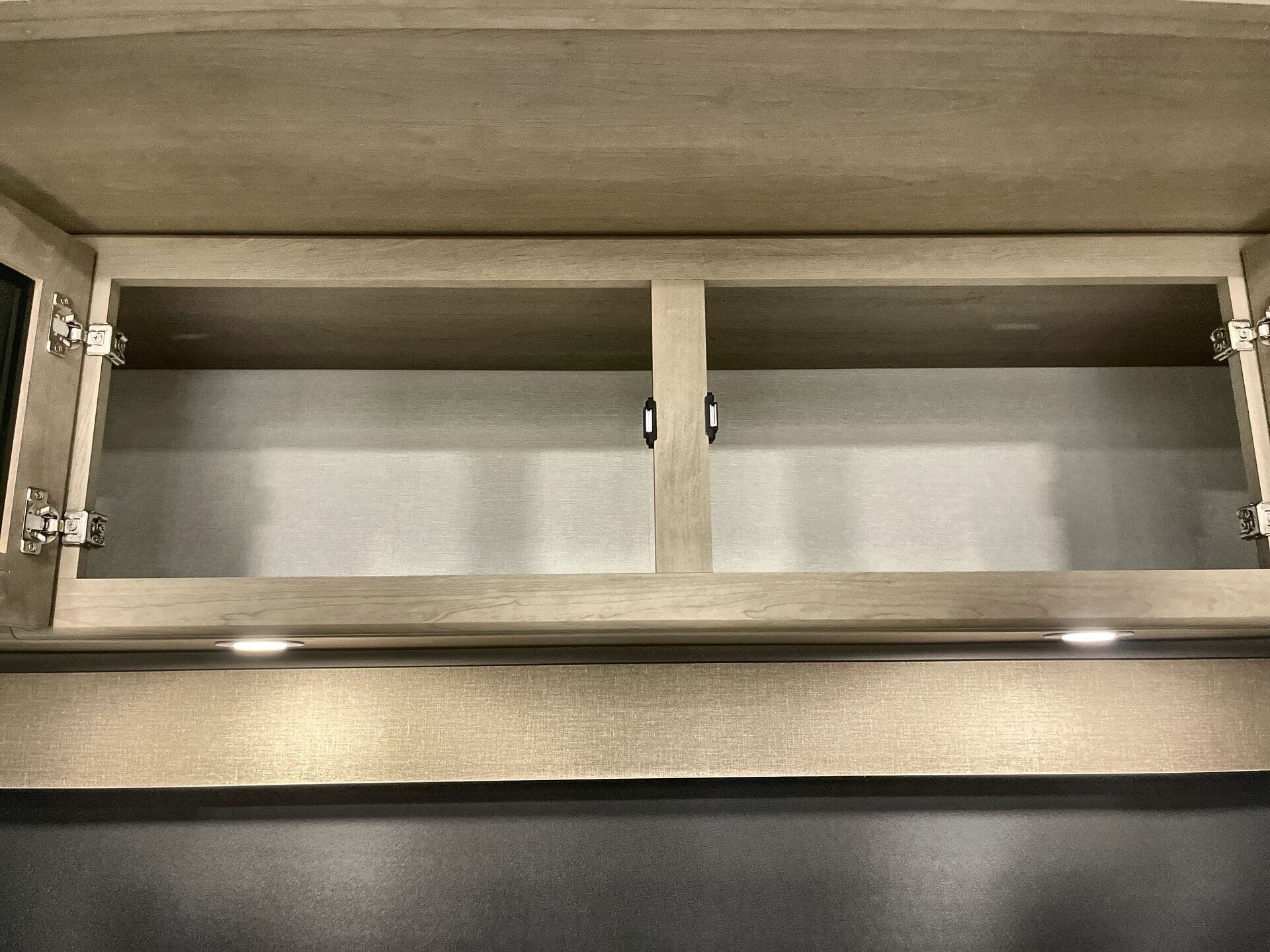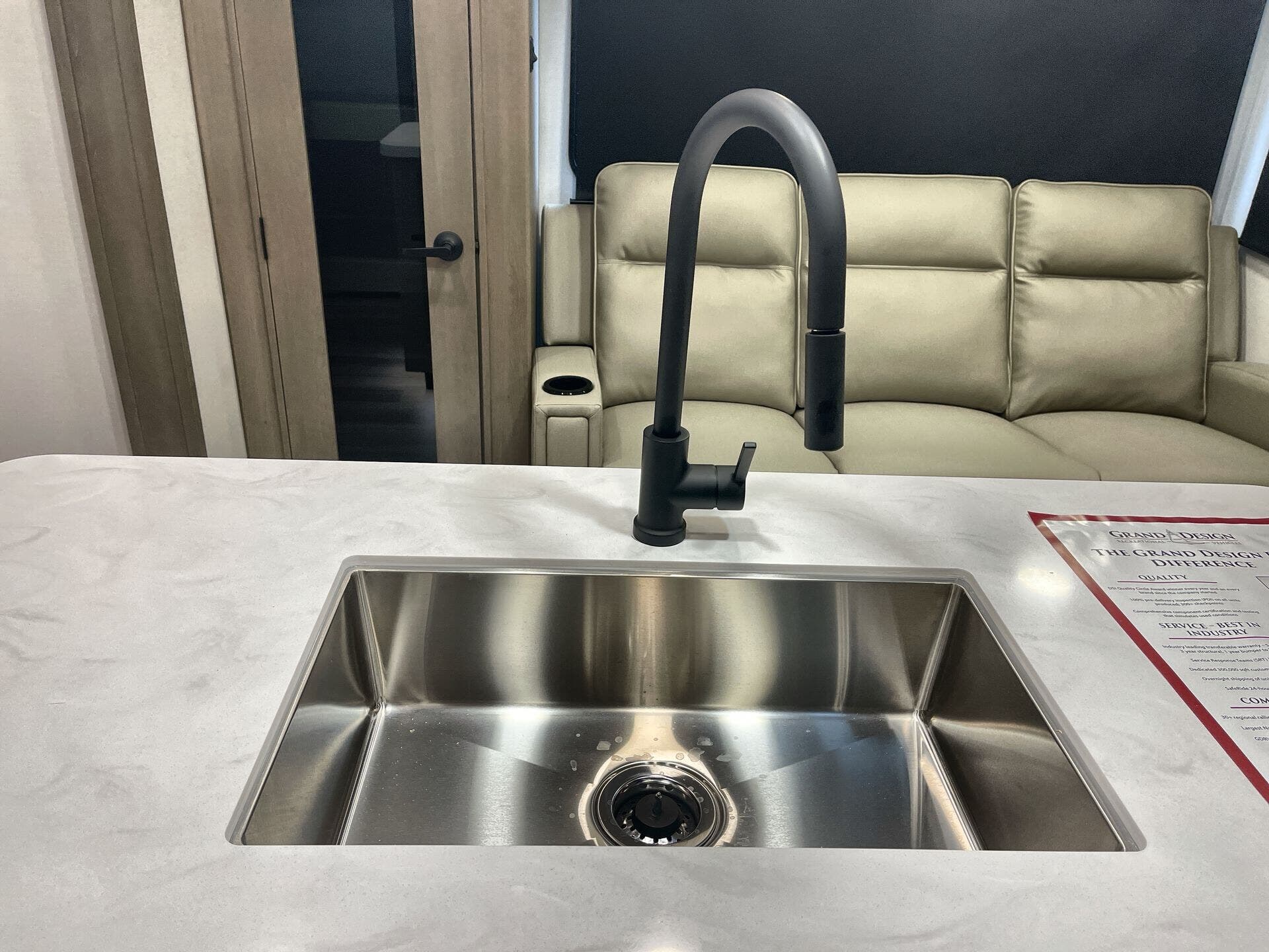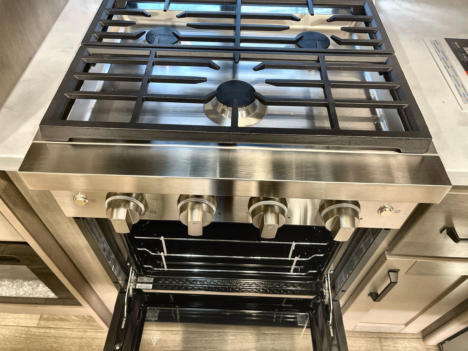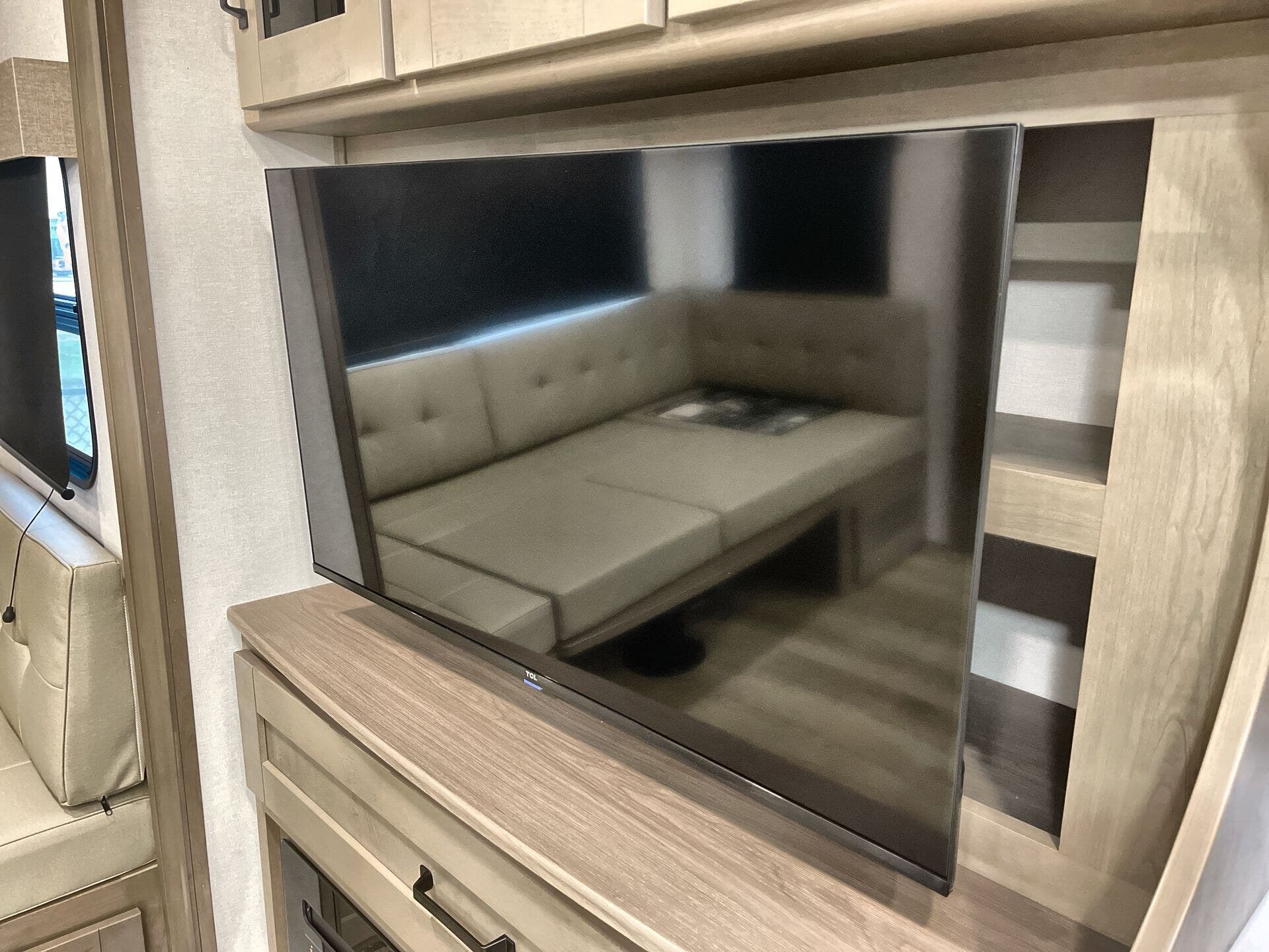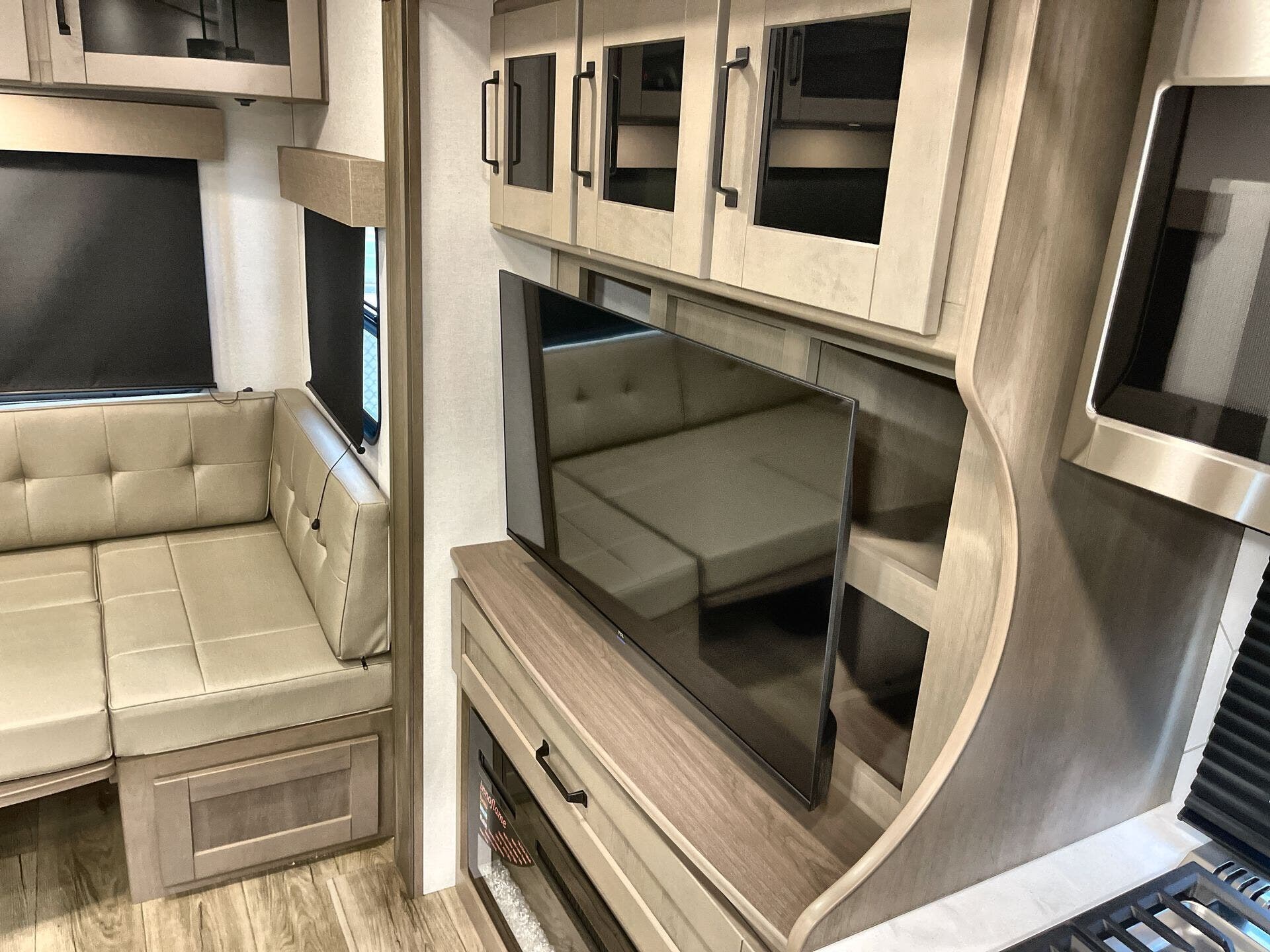 Inside, you’ll find a bright, open-concept living area with opposing slides that create a roomy, residential feel. The rear living room features theater seating, a tri-fold sleeper sofa, a 50" LED TV, and a cozy electric fireplace. The gourmet kitchen includes a center island with a deep stainless steel sink, solid surface countertops, a residential refrigerator, and a large pantry for all your storage needs. The mid-bunk room offers additional sleeping or working space with a tri-fold sofa and overhead bunk, plus dedicated storage.