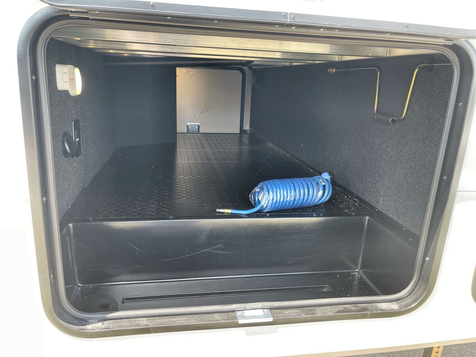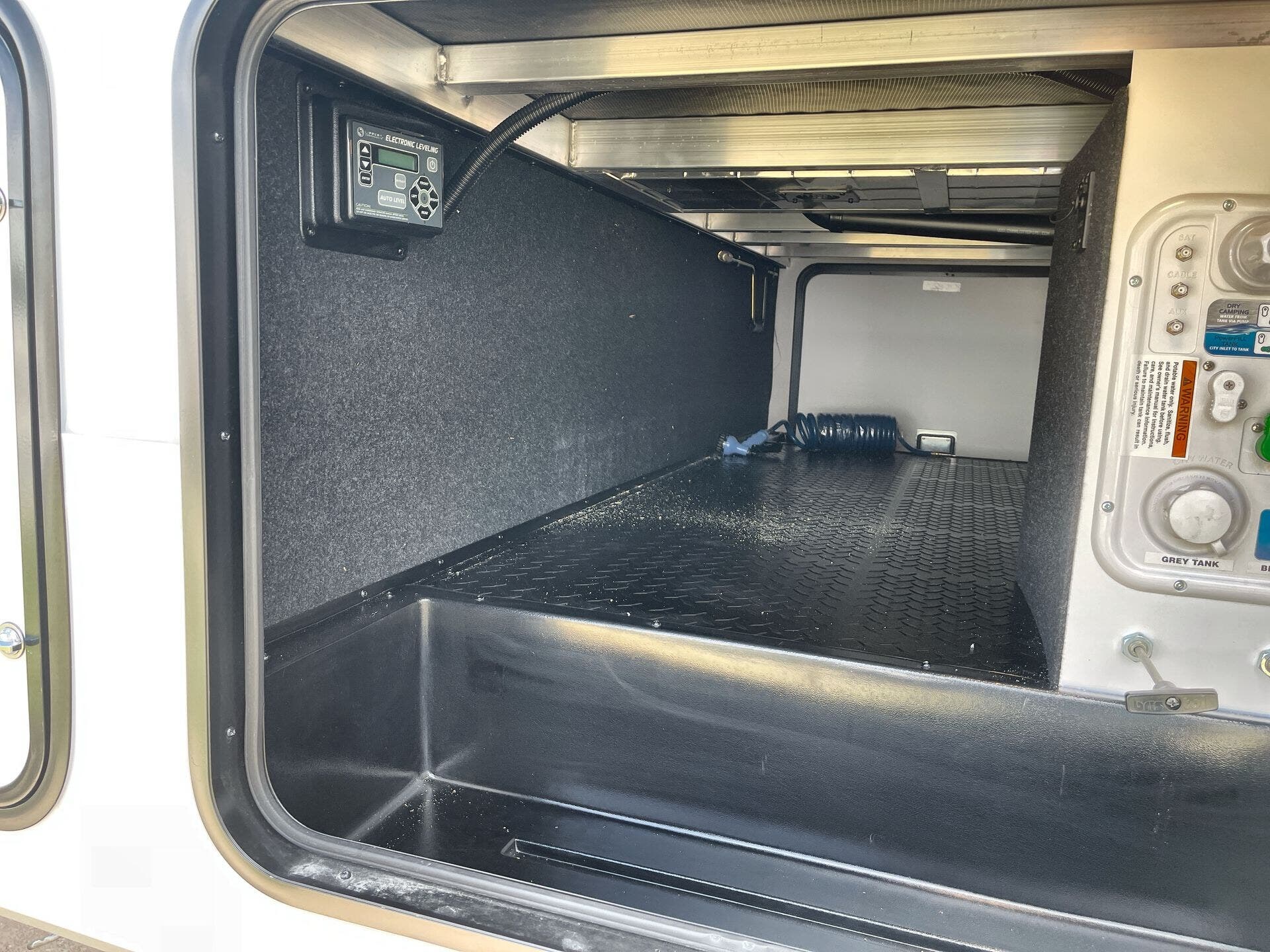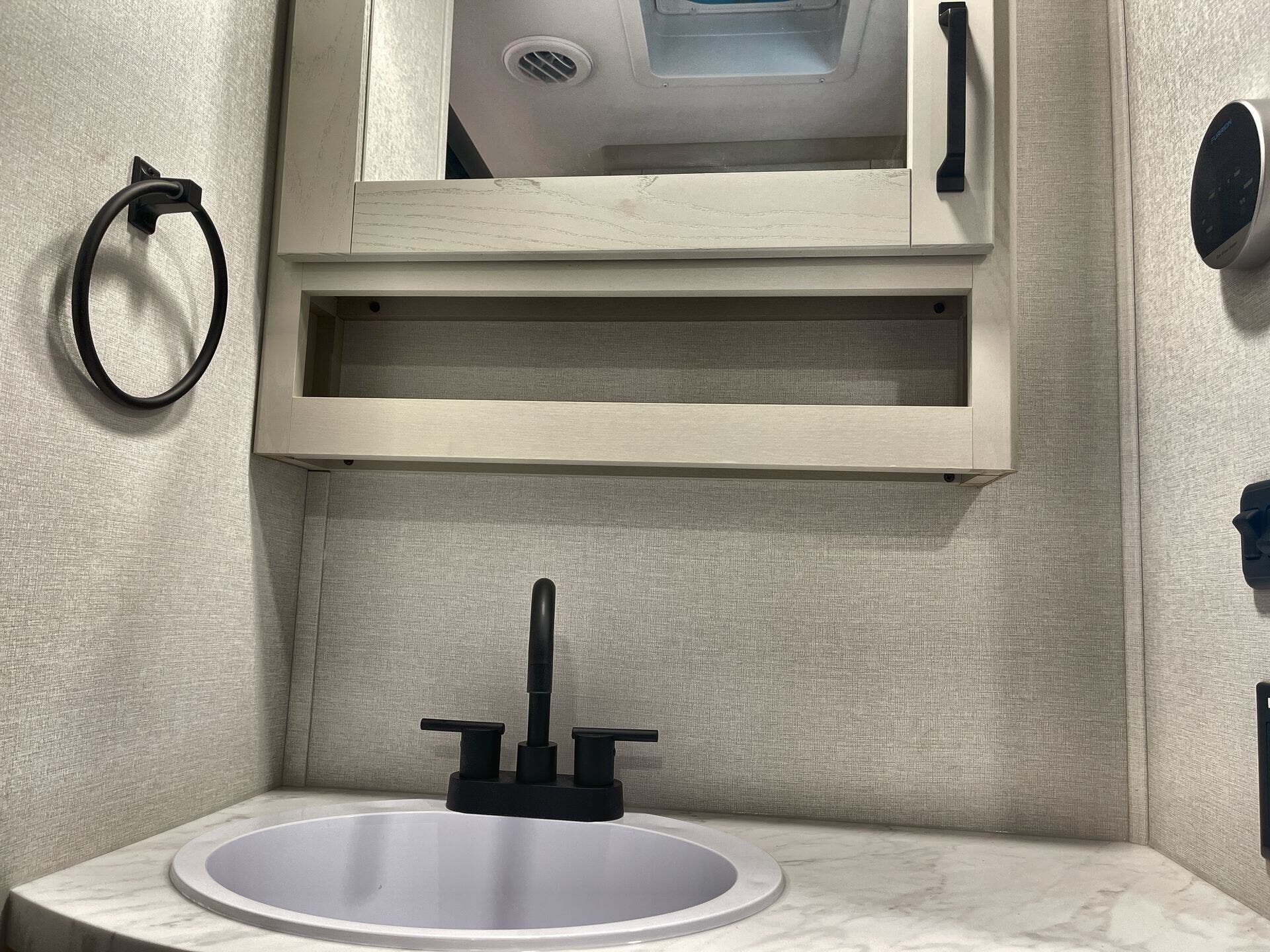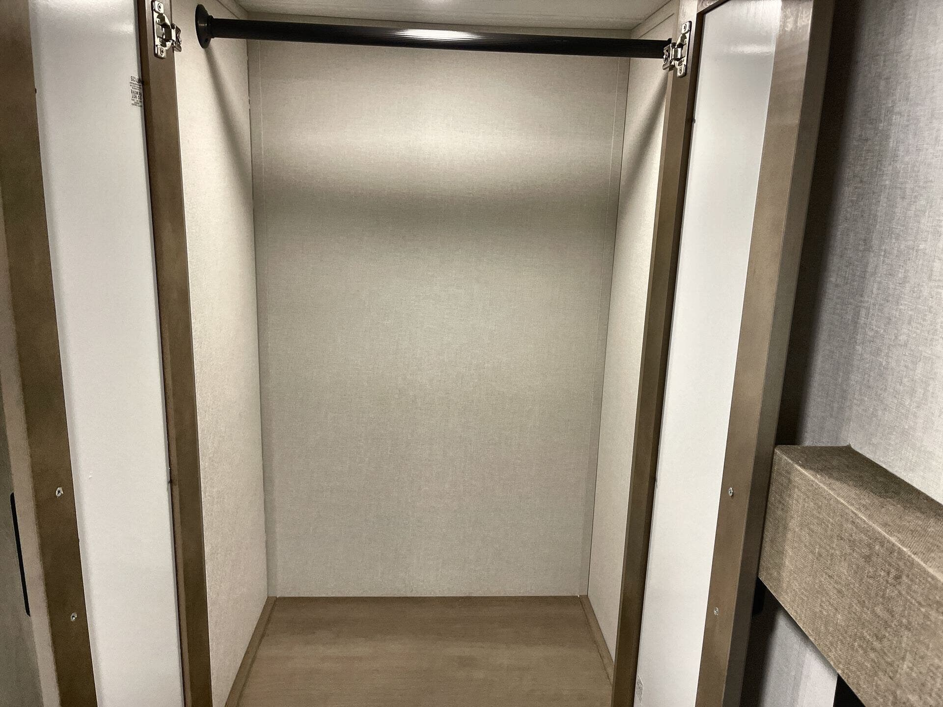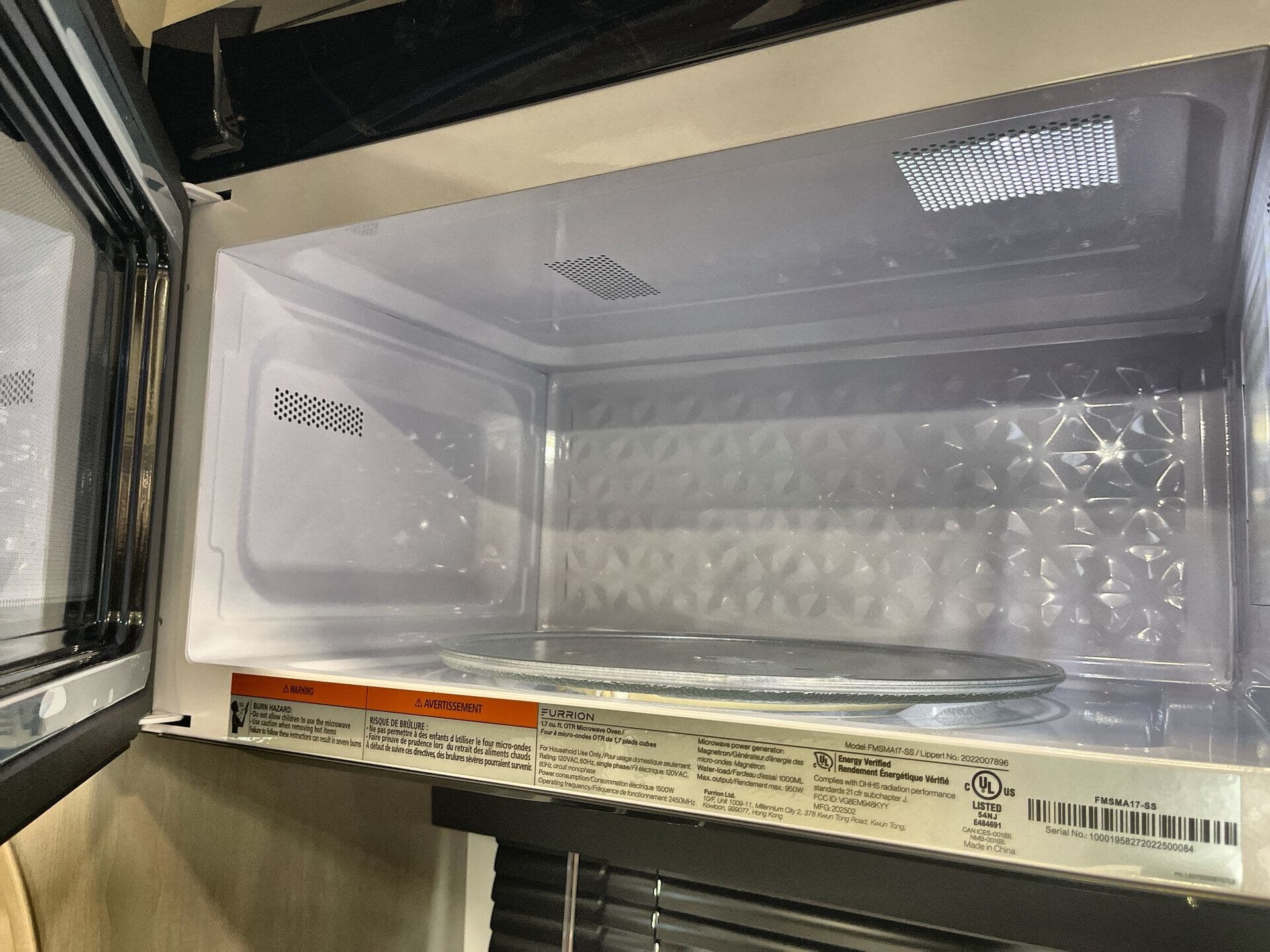 Inside, you’ll find a bright, open-concept living area with opposing slides that create a roomy, residential feel. The rear living room features theater seating, a tri-fold sleeper sofa, a 50" LED TV, and a cozy electric fireplace. The gourmet kitchen includes a center island with a deep stainless steel sink, solid surface countertops, a residential refrigerator, and a large pantry for all your storage needs. The mid-bunk room offers additional sleeping or working space with a tri-fold sofa and overhead bunk, plus dedicated storage.