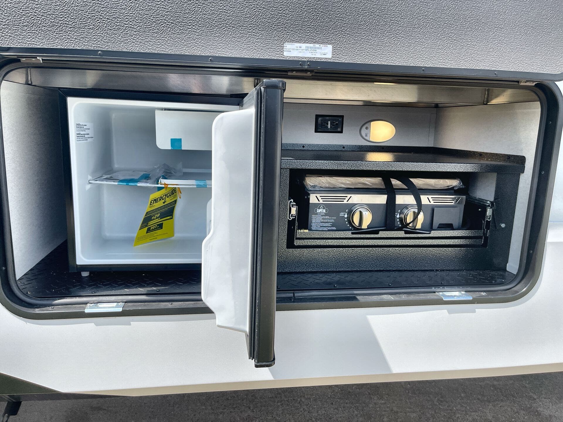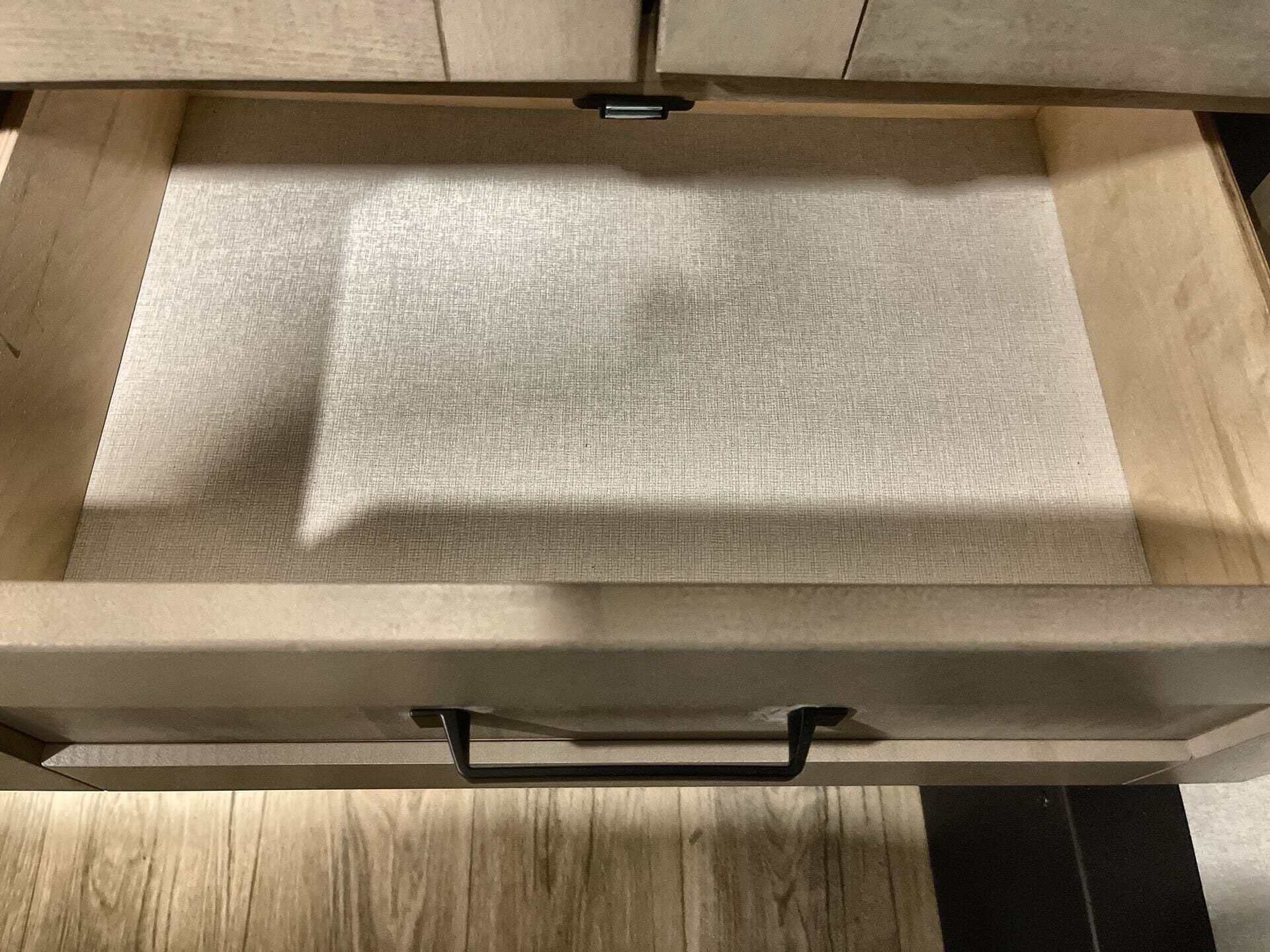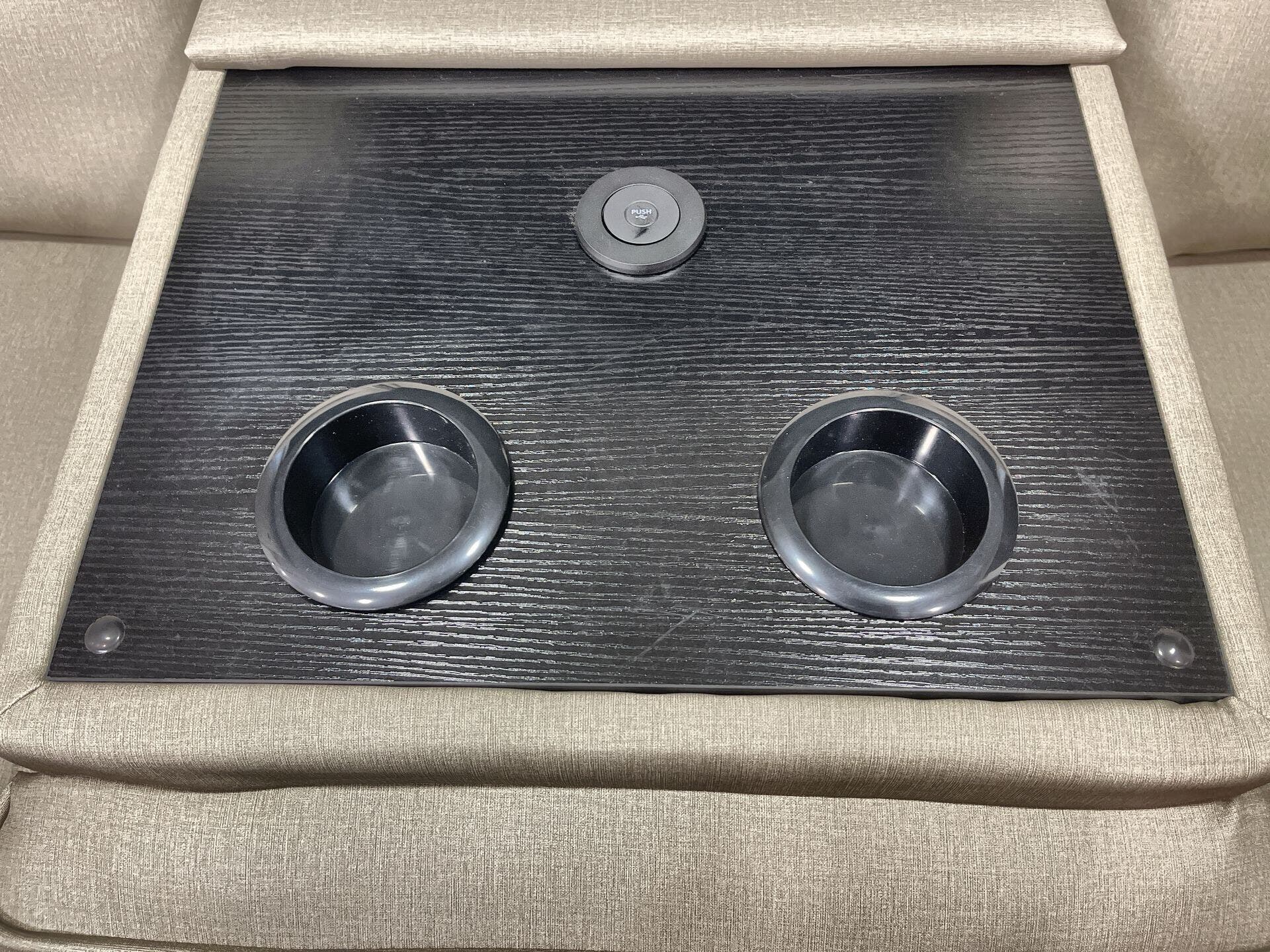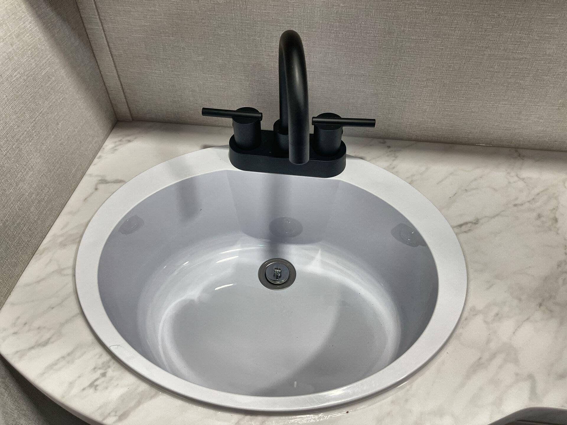 Inside, you’ll find a bright, open-concept living area with opposing slides that create a roomy, residential feel. The rear living room features theater seating, a tri-fold sleeper sofa, a 50" LED TV, and a cozy electric fireplace. The gourmet kitchen includes a center island with a deep stainless steel sink, solid surface countertops, a residential refrigerator, and a large pantry for all your storage needs. The mid-bunk room offers additional sleeping or working space with a tri-fold sofa and overhead bunk, plus dedicated storage.