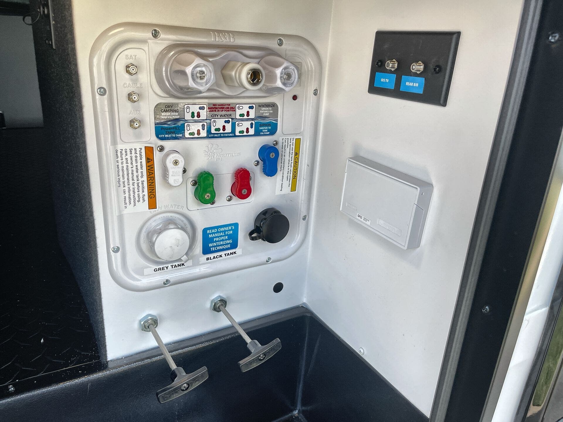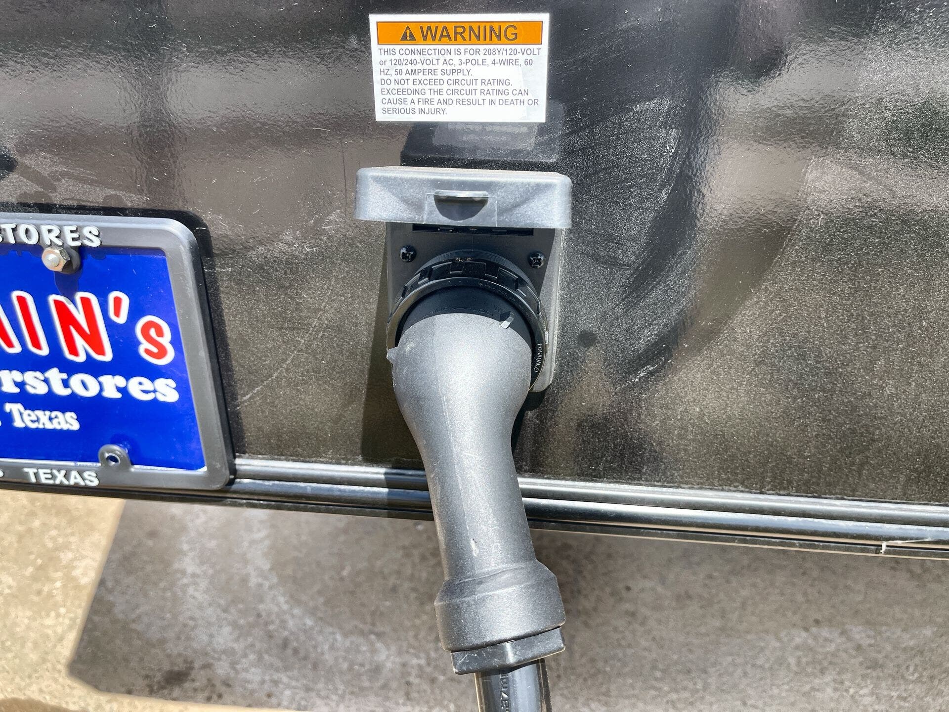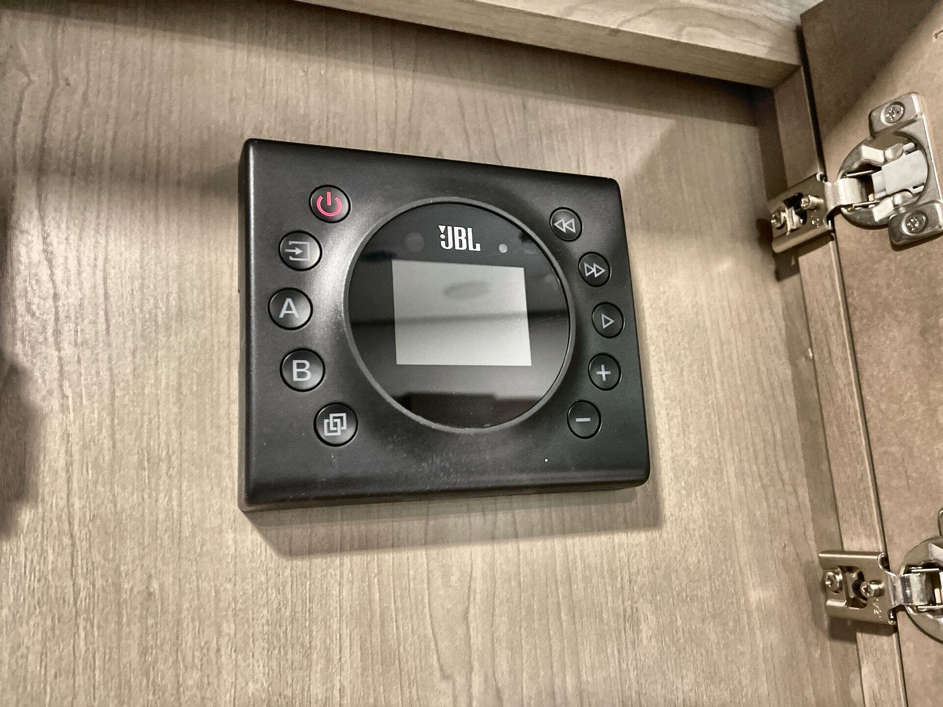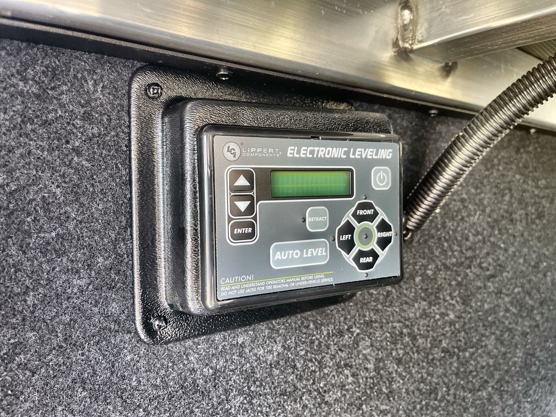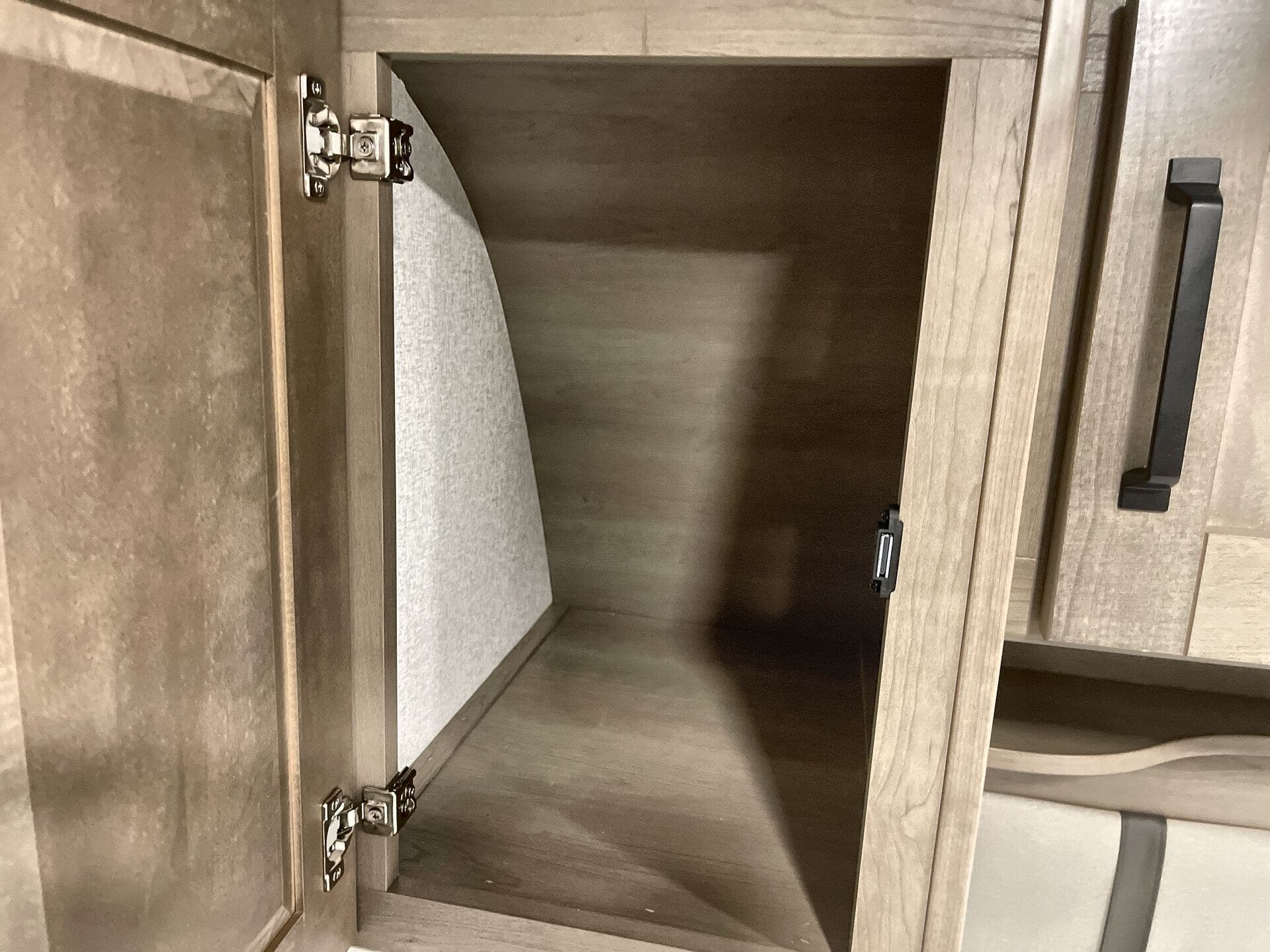 Inside, you’ll find a bright, open-concept living area with opposing slides that create a roomy, residential feel. The rear living room features theater seating, a tri-fold sleeper sofa, a 50" LED TV, and a cozy electric fireplace. The gourmet kitchen includes a center island with a deep stainless steel sink, solid surface countertops, a residential refrigerator, and a large pantry for all your storage needs. The mid-bunk room offers additional sleeping or working space with a tri-fold sofa and overhead bunk, plus dedicated storage.