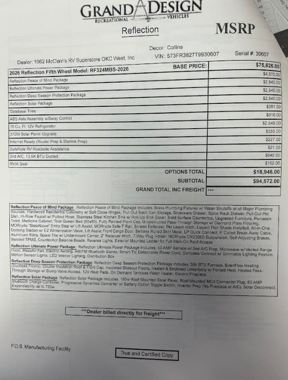 Request More Info on this 2026 Grand Design Reflection 324MBS Offered for sale by McClain's RV Oklahoma City