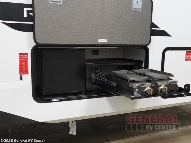 When you are looking for a versatile extra room for either a second bedroom or living area as well as an office, this middle bunkhouse might just work! There is a slide out with two bunks and drawers plus a dresser. You can sleep like a queen on the walk-around bed in the front private bedroom that offers more clothing storage and windows for views. The rear main living and kitchen area provides plenty of seating on the a 78" triple person theater seats, and on the 92" U-shaped lounge with table with windows within the slide for natural lighting and great views. The kitchen island gives the cook more space to make and serve meals, and the gourmet kitchen includes a 16 cu. ft. refrigerator, plus a pantry for dry goods. There is an exterior outside kitchen with a griddle and a 1.6 cu. ft. refrigerator for beverages and such, plus you will find an LP quick connect, Coax TV hookup, and a spray port to wash off your dirty shoes.