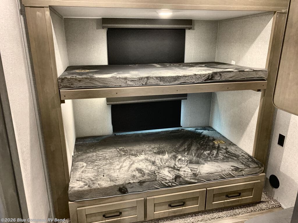 When you are looking for a versatile extra room for either a second bedroom or living area as well as an office, this middle bunkhouse might just work! There is a slide out with two bunks and drawers plus a dresser. You can sleep like royalty on the walk-around queen bed in the front private bedroom that offers more clothing storage and windows for views. The rear main living and kitchen area provides plenty of seating on the 78" theater seats, and on the 92" U-shaped lounge. The kitchen island gives the cook more space to make and serve meals, and the gourmet kitchen includes a 16-cu. ft. refrigerator, plus a pantry for dry goods. There is an exterior outside kitchen with a griddle and a 1.6 cu. ft. refrigerator for beverages and such, plus you will find an LP quick connect, Coax TV hookup, and a spray port to wash off your dirty shoes.