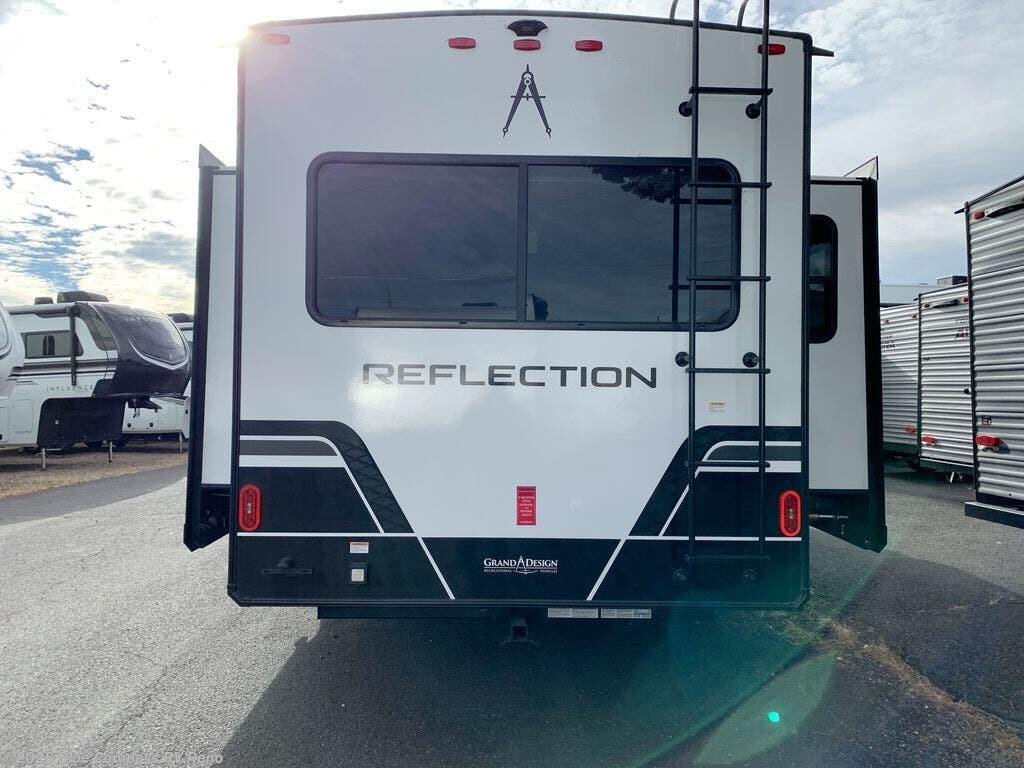 With any Reflection fifth wheel by Grand Design, you will have a solar panel for off-grid camping and a 60 amp charge controller and inverter prep, a Universal All-In-One docking station, unobstructed pass-through storage, and Goodyear Endurance tires. Each is constructed of gel coat exterior sidewalls, residential 5" truss rafters, walk-on roof decking, a fiberglass and radiant foil roof and front cap insulation plus laminated aluminum framed side walls, roof and end walls in slide rooms. Head inside to enjoy residential hardwood cabinet doors, premium Congoleum flooring, a spacious shower with a glass door, and many more comforts!