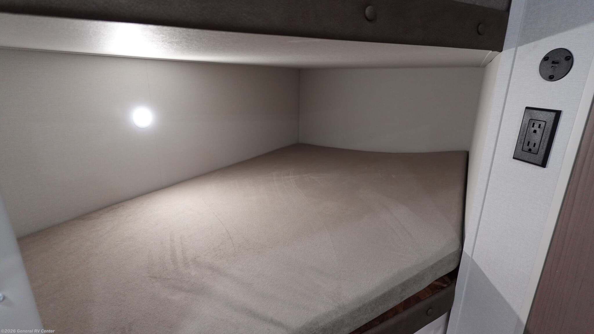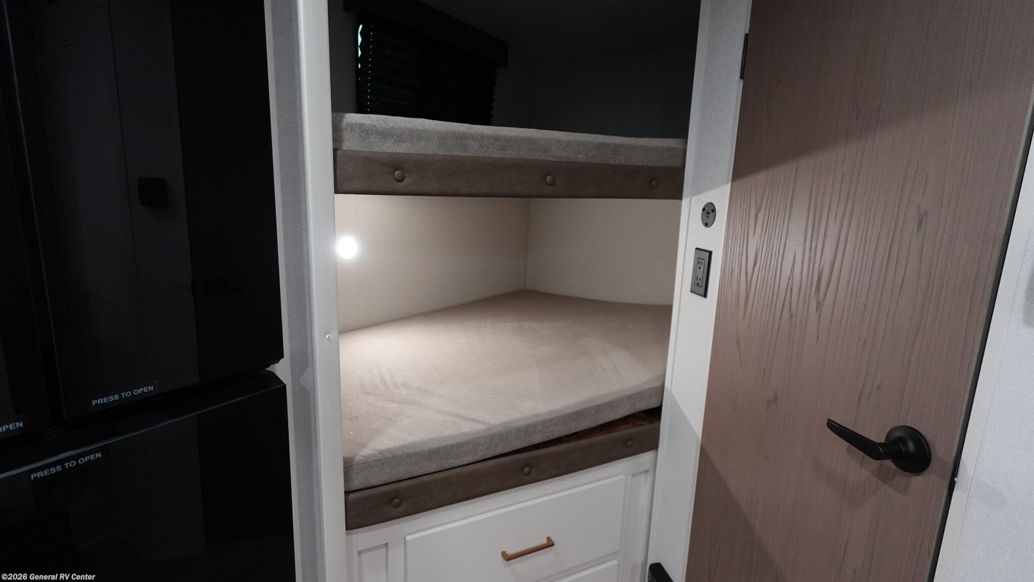 Grand Design Reflection 100 Series fifth wheel 32BH highlights: Bunkhouse Queen Bed 19' "One Touch" Electric Awning Full Bath Front Private Bedroom Outside Kitchen You will love this fifth wheel’s multiple sleeping spaces, such as the 36” flip top bunk offers flexible sleeping options for added capacity and comfort. A trundle bed provides an additional cozy sleeping space, ideal for guests or family members, and the 44” bunk bed with window features a comfortable sleeping area with natural light, ideal for kids or relaxation. Plus, the front bedroom boasts a queen bed, creating a peaceful retreat for rest and rejuvenation. In the living area, you will find a space that creates a warm and intimate spot for meals and conversation. The 40” TV delivers entertainment for relaxation and enjoyment, a theater seating provides immersive comfort for an exceptional viewing experience, and the well-appointed kitchen features a 10 cu ft refrigerator that ensures ample storage for fresh ingredients and beverages, a pantry, microwave, and a three-burner cooktop allows for versatile meal preparation. Finally, the full bathroom will complete the at-home experience, adding convenience to this model. Each Reflection 100 Series fifth wheel by Grand Design is affordable and packed with luxury for unforgettable camping memories! The MorRyde CRE3000 suspension system and Goodyear Endurance tires will provide smooth towing from home to campground. And the solar package with a 180W solar panel, 60 Amp charge controller and 12V refrigerator will allow you to camp for longer periods of time and in more locations! A heated and enclosed underbelly with circulating heat is included in the Arctic 4-Seasons Protection Package, along with a double insulated roof and front cap, and thermofoil insulation under the holding tanks so you can camp all year long if you choose. You will appreciate having an on-demand water heater for hot showers after exploring, and the universal all-in-one docking station will let you monitor your RVs tanks levels and functions with ease. These models also include many luxurious interior features, such as premium Congoleum flooring, pleated shades, residential cabinetry, and matte black fixtures and hardware. Don't let the Reflection 100 Series fifth wheels pass you by!