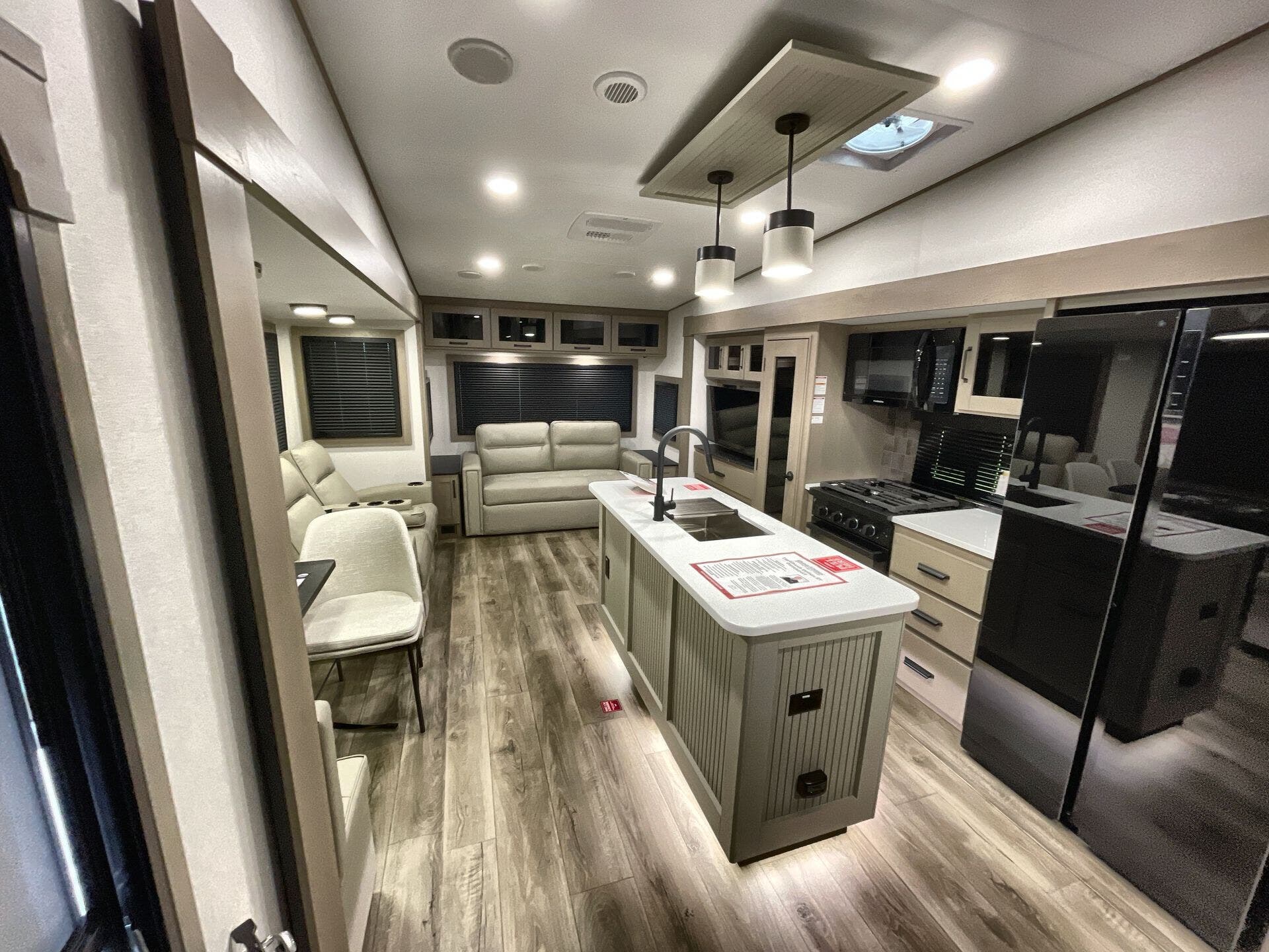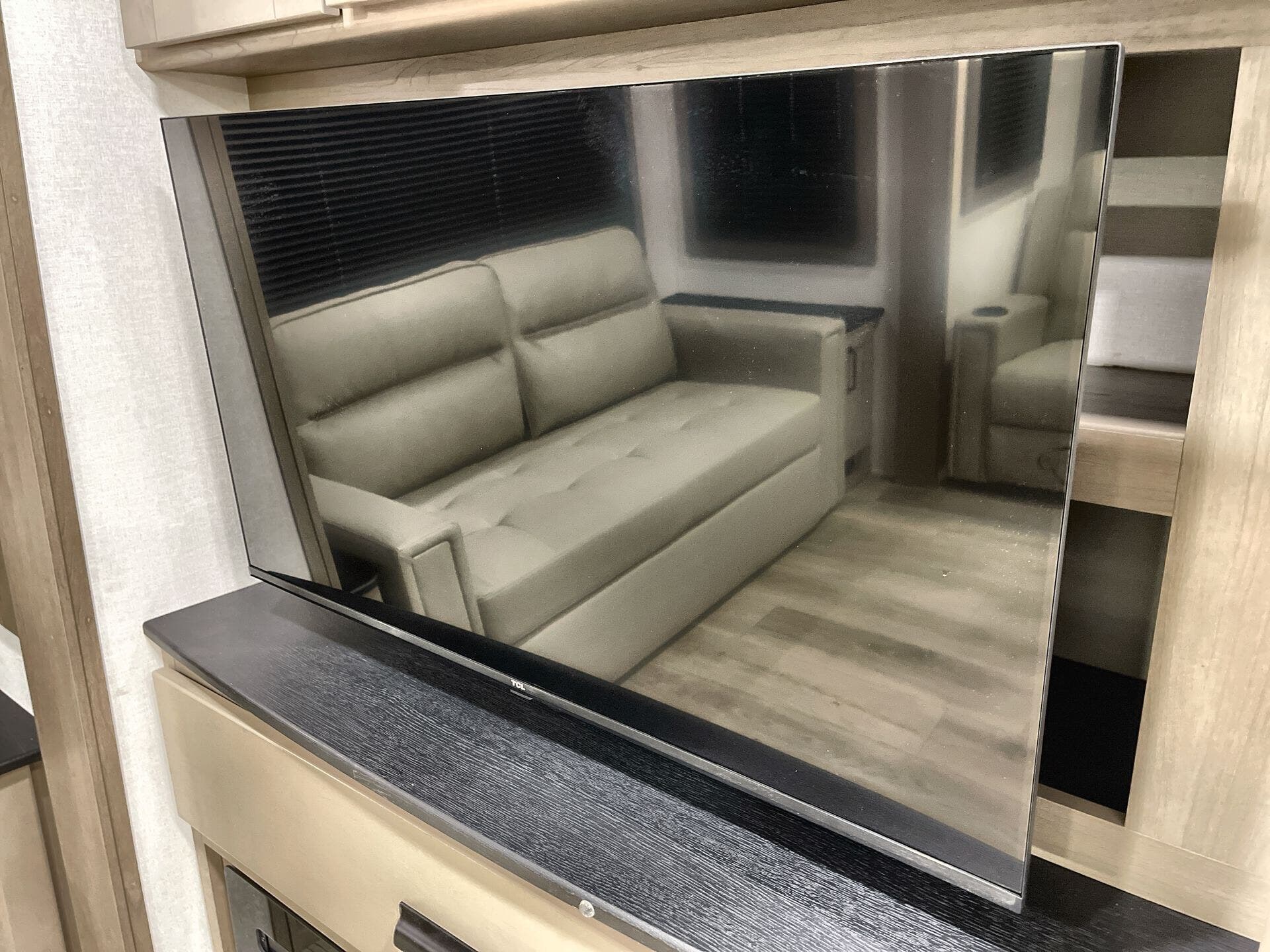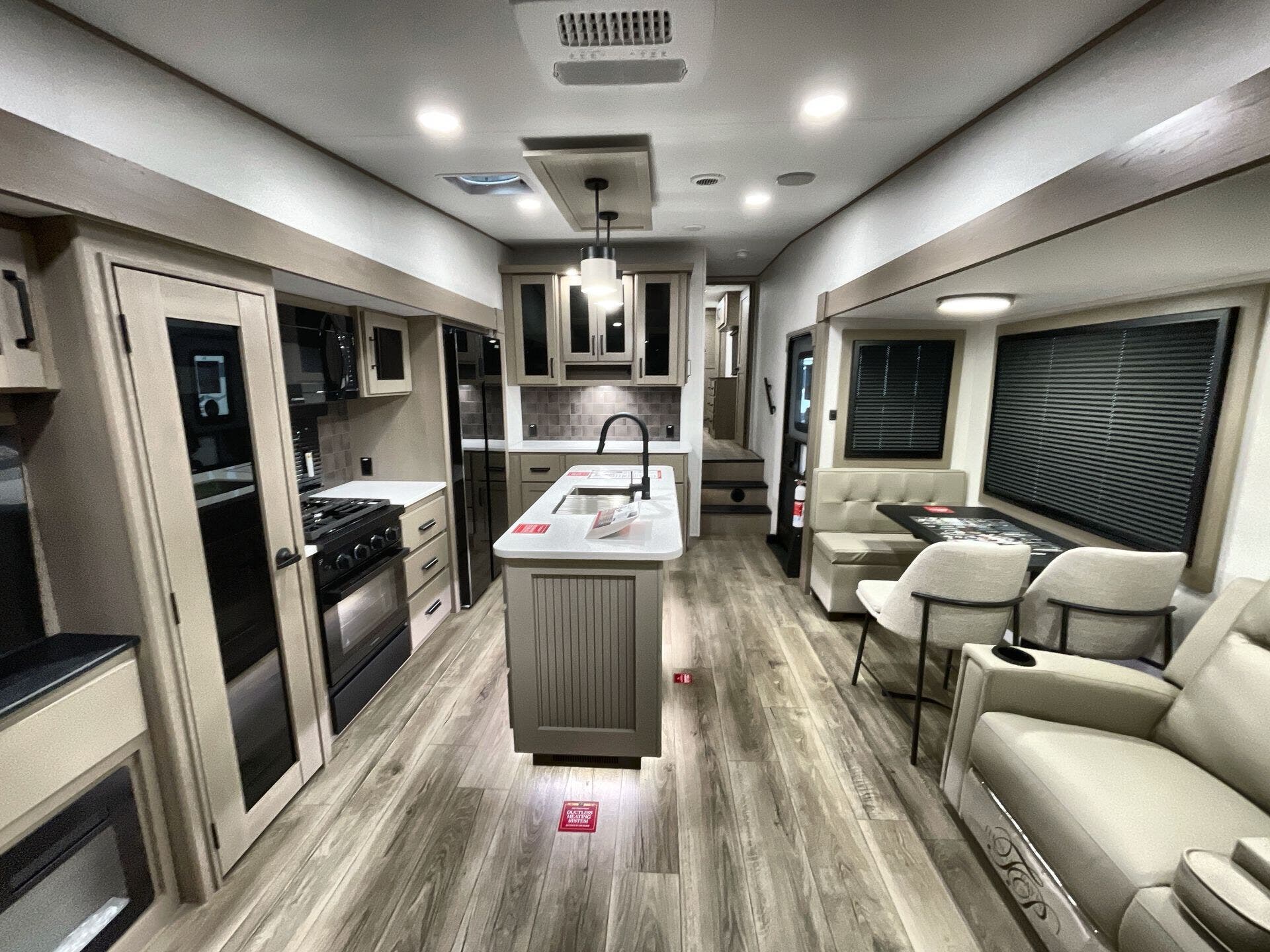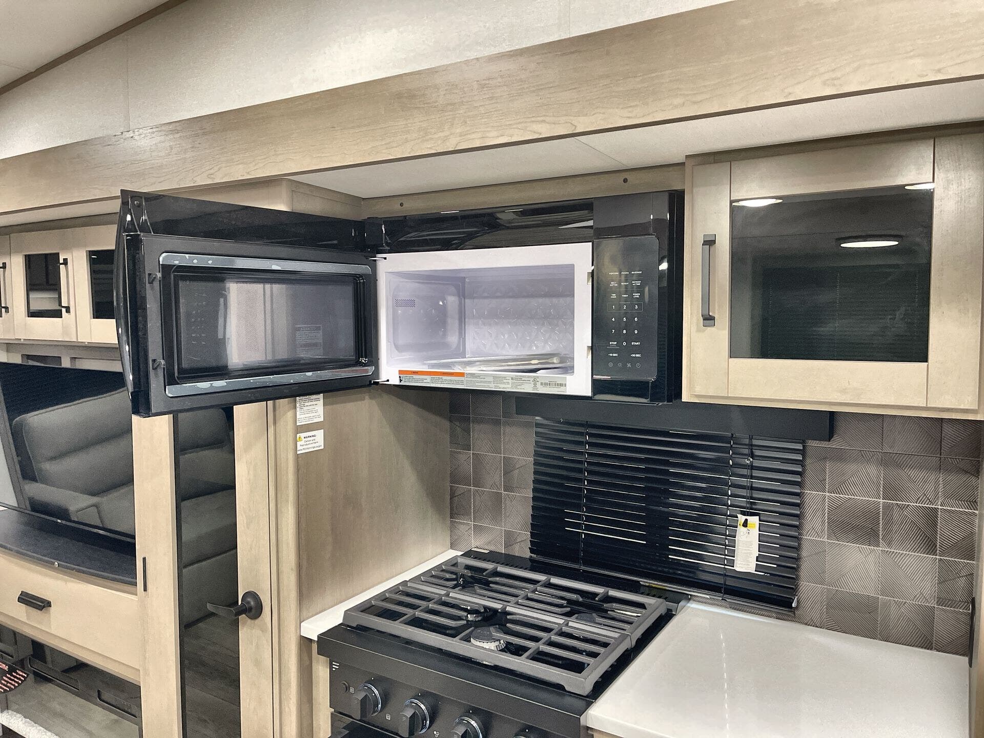 The Reflection 337RLS emphasizes a refined interior designed for real-world living. Inside, you’ll find solid surface countertops, a full kitchen with a microwave and refrigerator, and a versatile booth dinette that can transition to additional sleeping with a hide-A-bed sofa. A dedicated medicine cabinet and vanity add convenience to the bathroom, while a shower and toilet deliver home-like comfort. The unit includes an inverter and a solar panel system to extend off-grid usability, making it ideal for extended stays at scenic campgrounds or remote getaways.