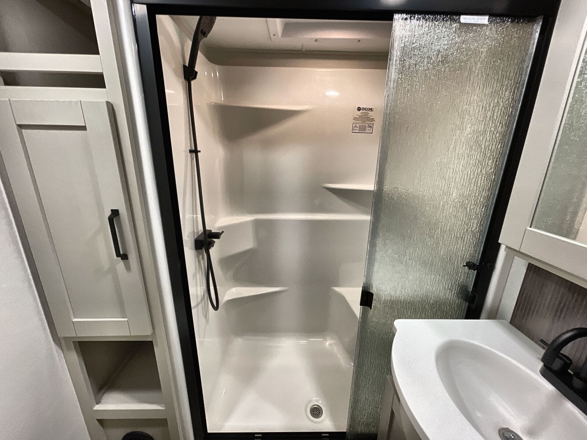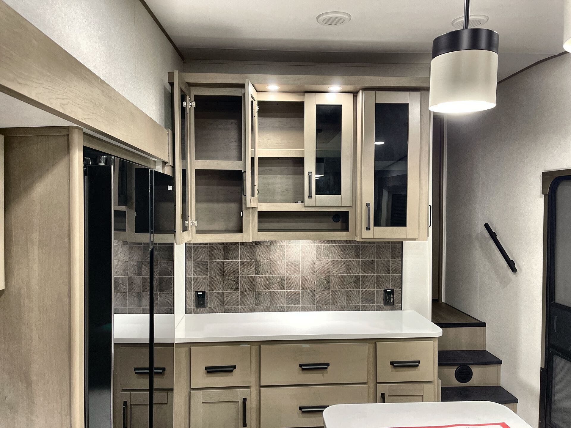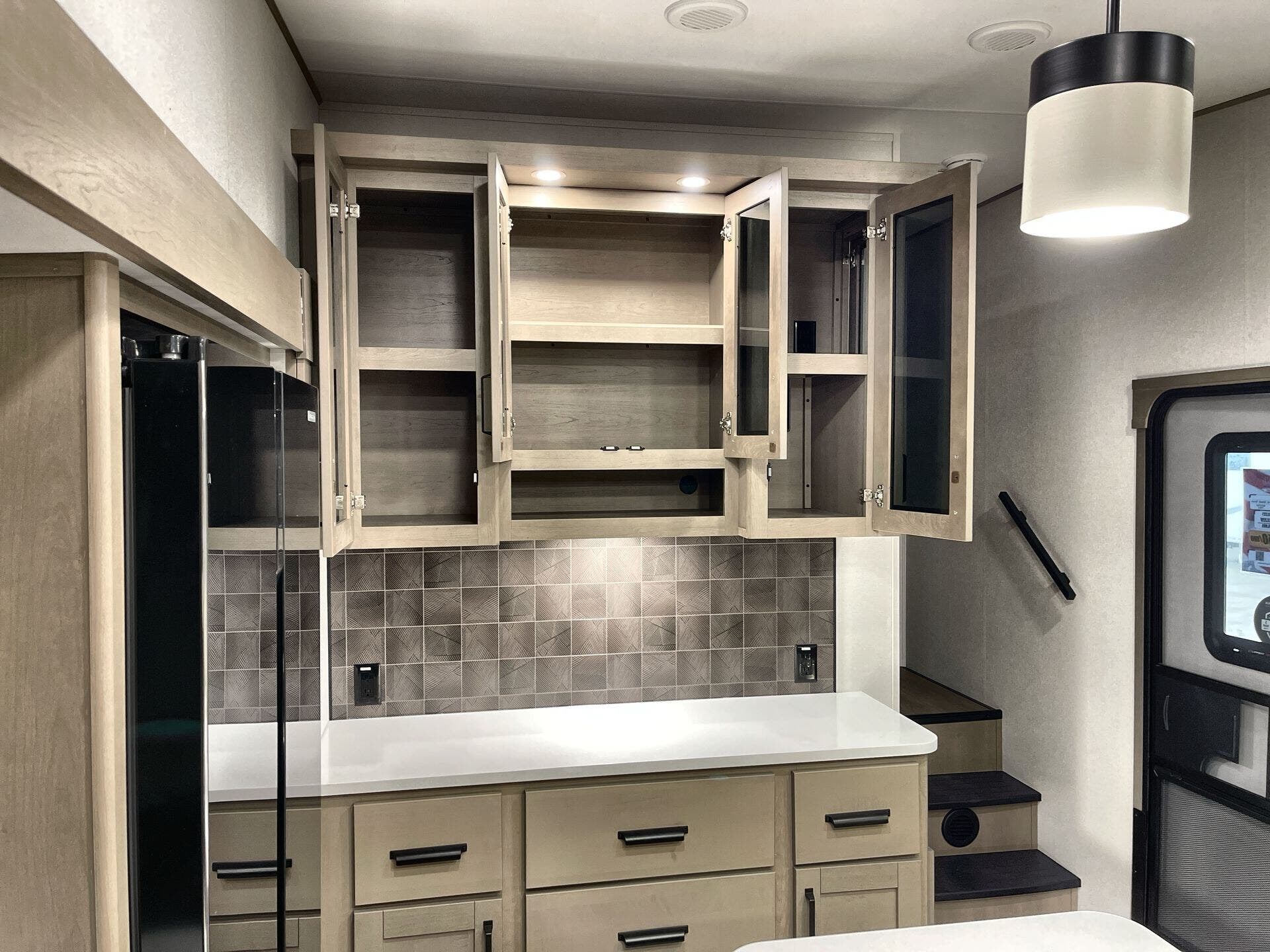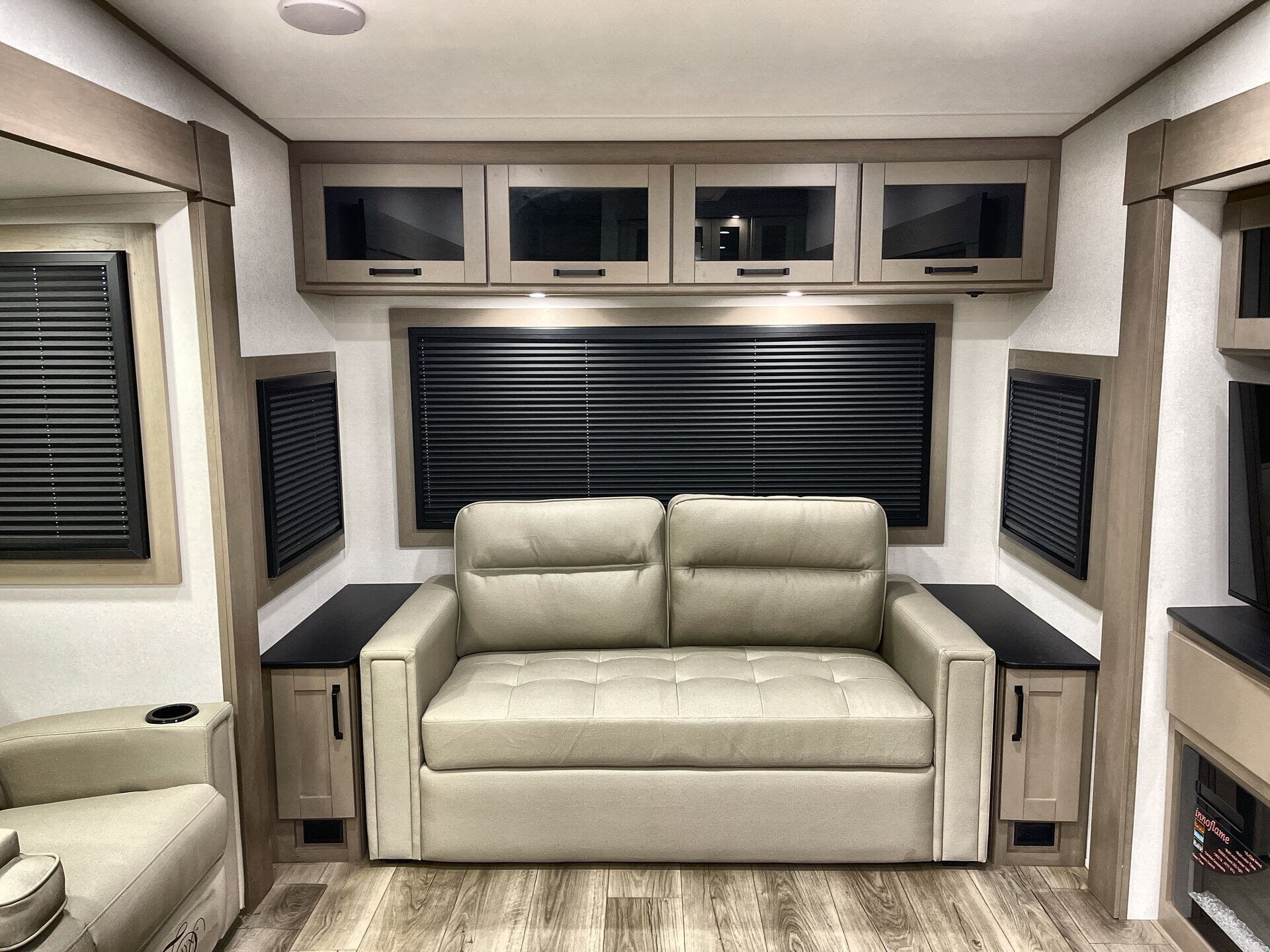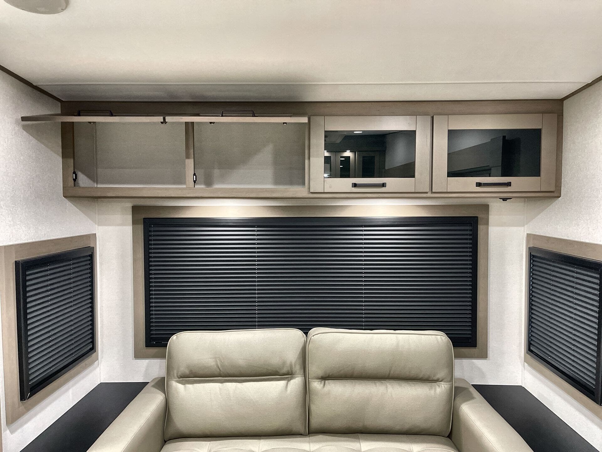 The Reflection 337RLS emphasizes a refined interior designed for real-world living. Inside, you’ll find solid surface countertops, a full kitchen with a microwave and refrigerator, and a versatile booth dinette that can transition to additional sleeping with a hide-A-bed sofa. A dedicated medicine cabinet and vanity add convenience to the bathroom, while a shower and toilet deliver home-like comfort. The unit includes an inverter and a solar panel system to extend off-grid usability, making it ideal for extended stays at scenic campgrounds or remote getaways.