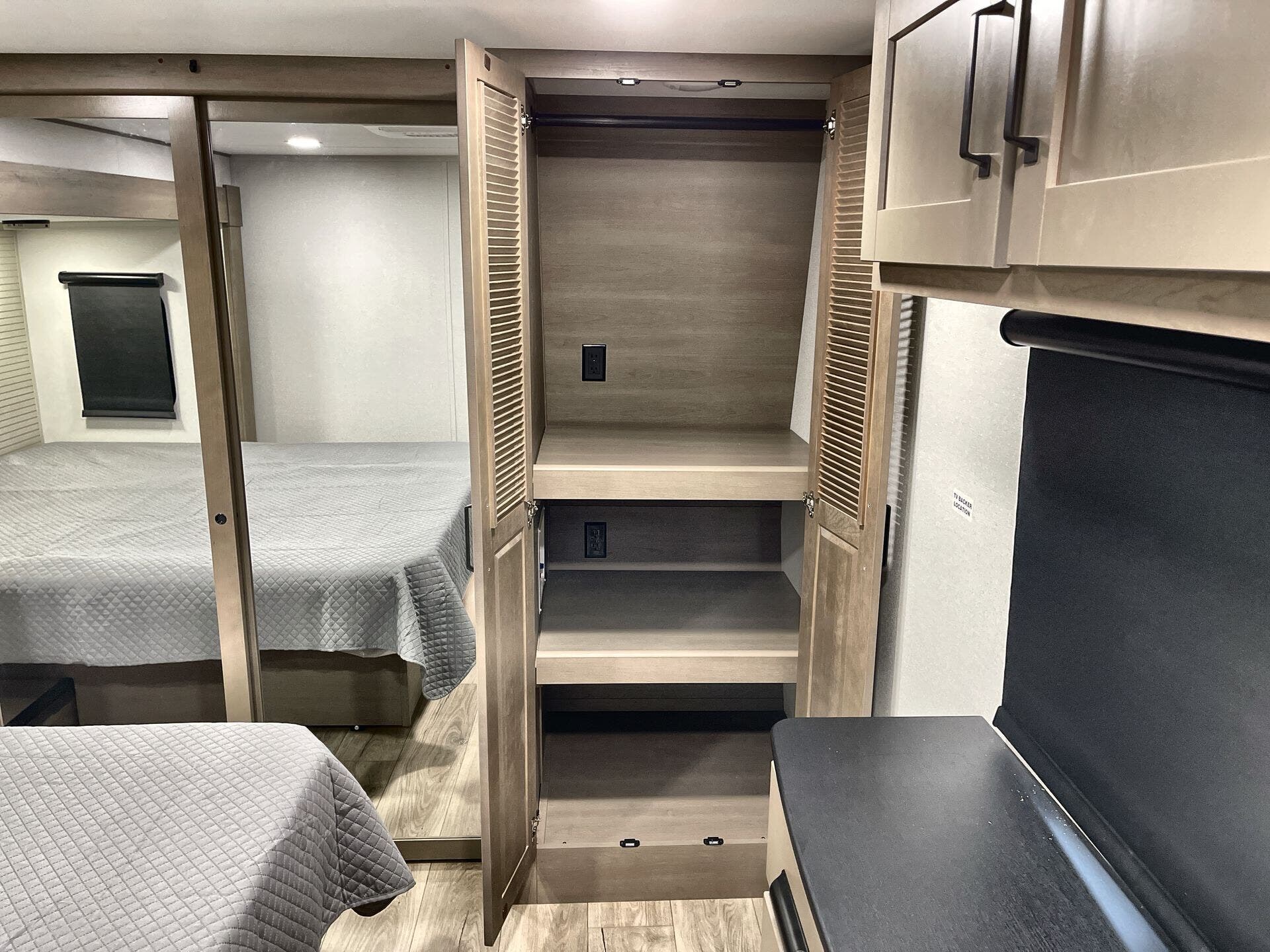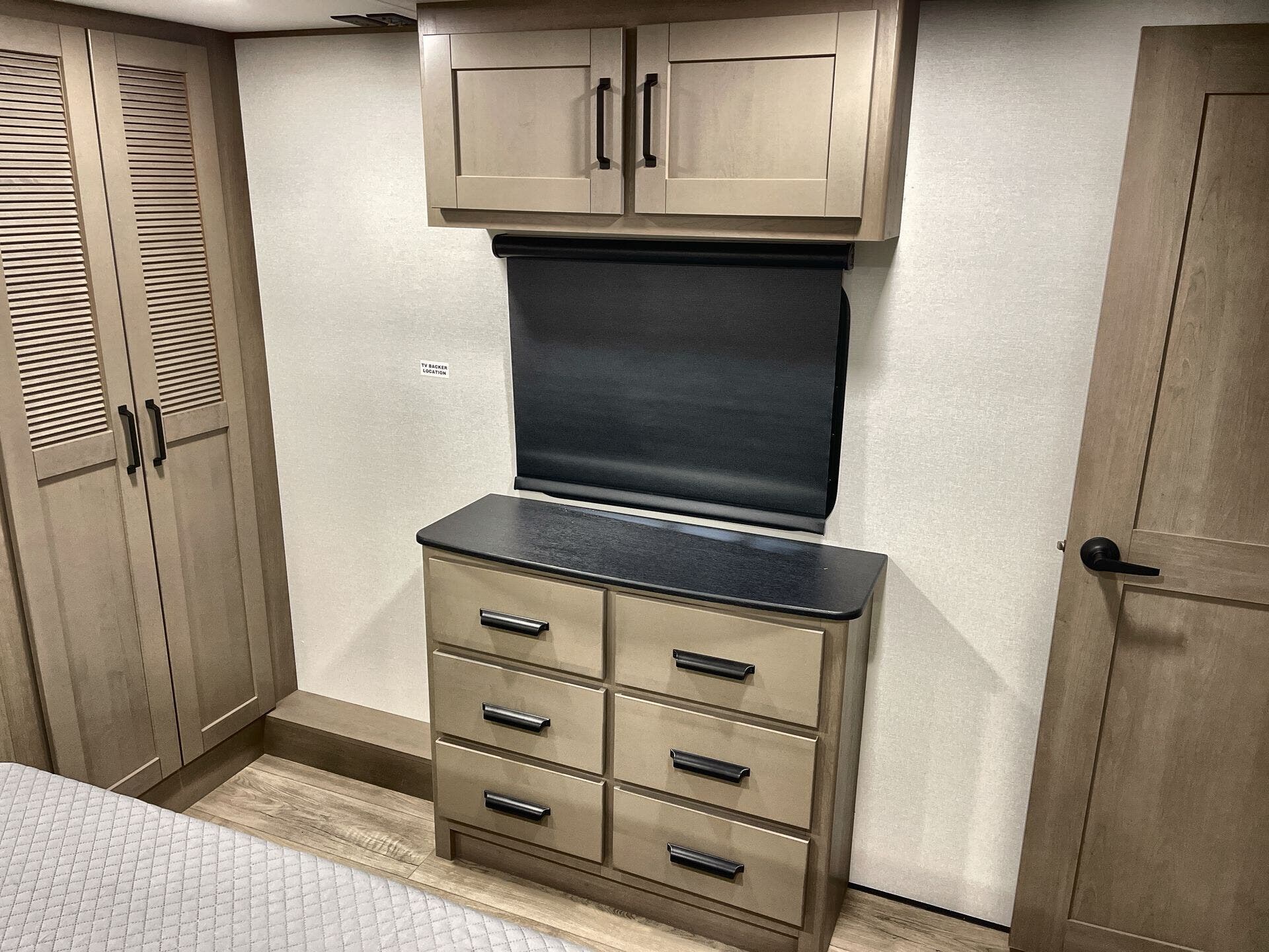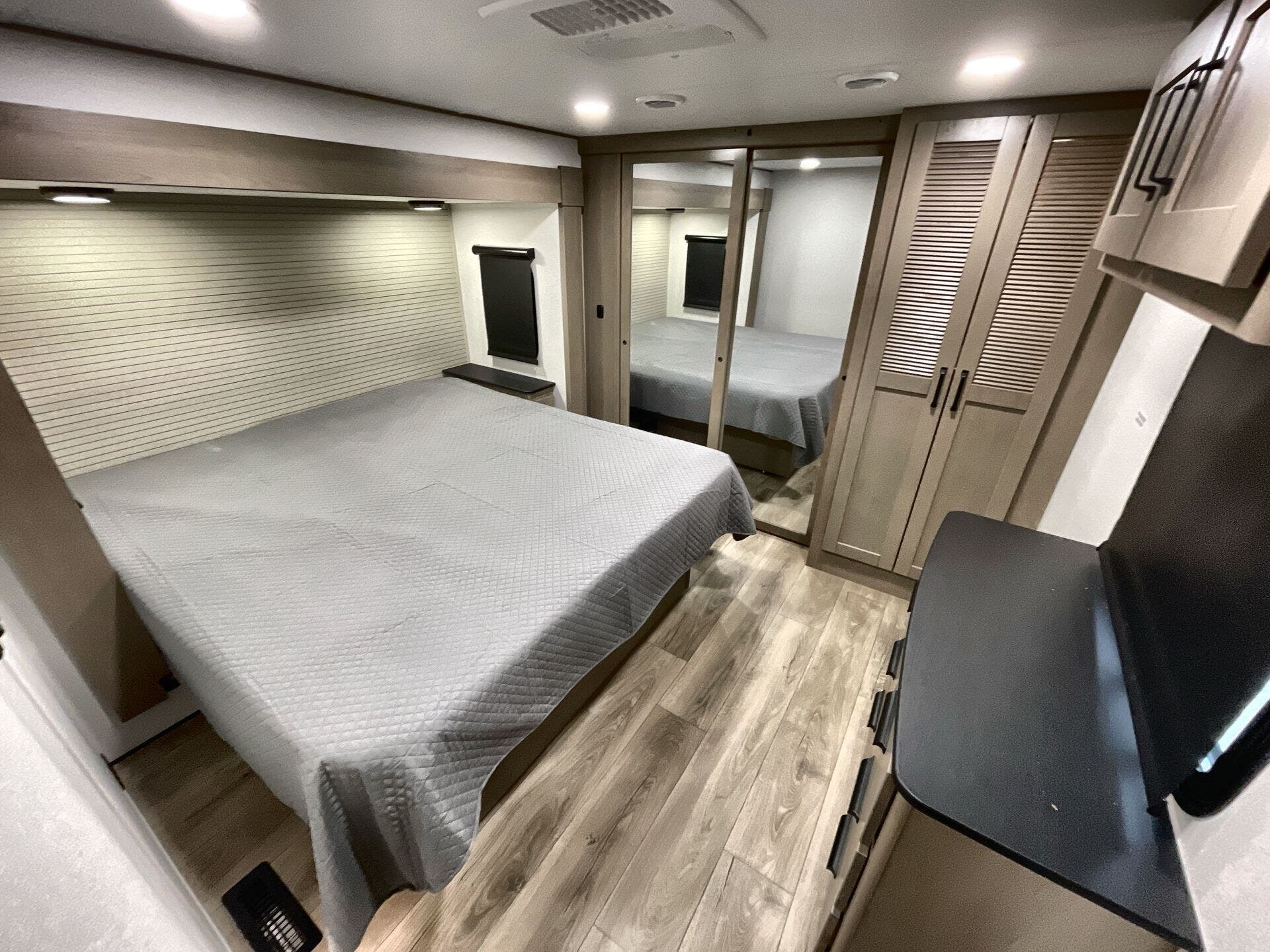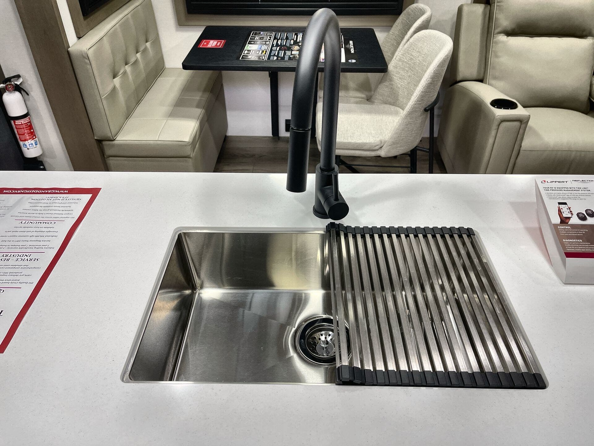 The Reflection 337RLS emphasizes a refined interior designed for real-world living. Inside, you’ll find solid surface countertops, a full kitchen with a microwave and refrigerator, and a versatile booth dinette that can transition to additional sleeping with a hide-A-bed sofa. A dedicated medicine cabinet and vanity add convenience to the bathroom, while a shower and toilet deliver home-like comfort. The unit includes an inverter and a solar panel system to extend off-grid usability, making it ideal for extended stays at scenic campgrounds or remote getaways.