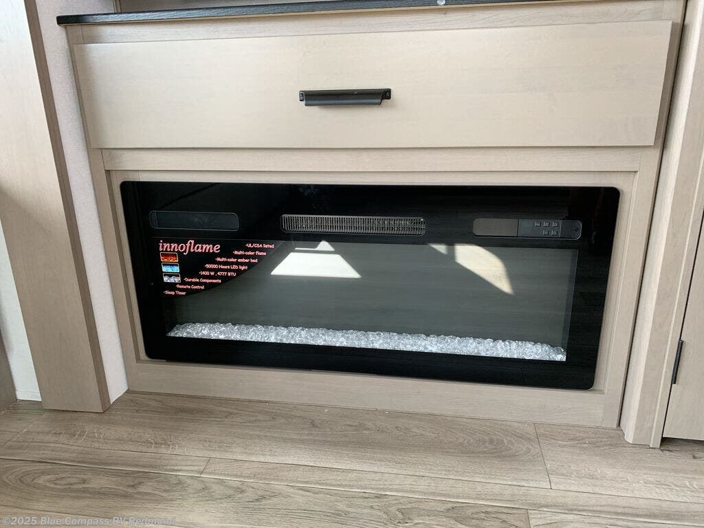 You can enjoy a spacious rear living area in this RV with dual opposing slides offering you entertainment, kitchen amenities, seating and windows for great views! The rear tri-fold sofa also converts into extra sleeping space for an extra guest or two, just like the booth dinette does. Yet you might like to add the swivel dinette option. There are theater seats to enjoy while you place your drinks in the cupholders and watch the entertainment center with a 40" LED HDTV and fireplace. The pantry is big enough to store your favorite snacks, and the kitchen island will make meal prepping easier, plus there is a 16 cu. ft. refrigerator to store any leftovers. The full bathroom has a 30" x 48" fiberglass shower and a linen closet to store your towels. The front private bedroom has a comfortable queen bed slide that can be switched out for the optional king bed, a dresser with overhead cabinets, and a full wall wardrobe that is prepped to add the optional washer and dryer so that you can extend your camping trip with clean clothes!