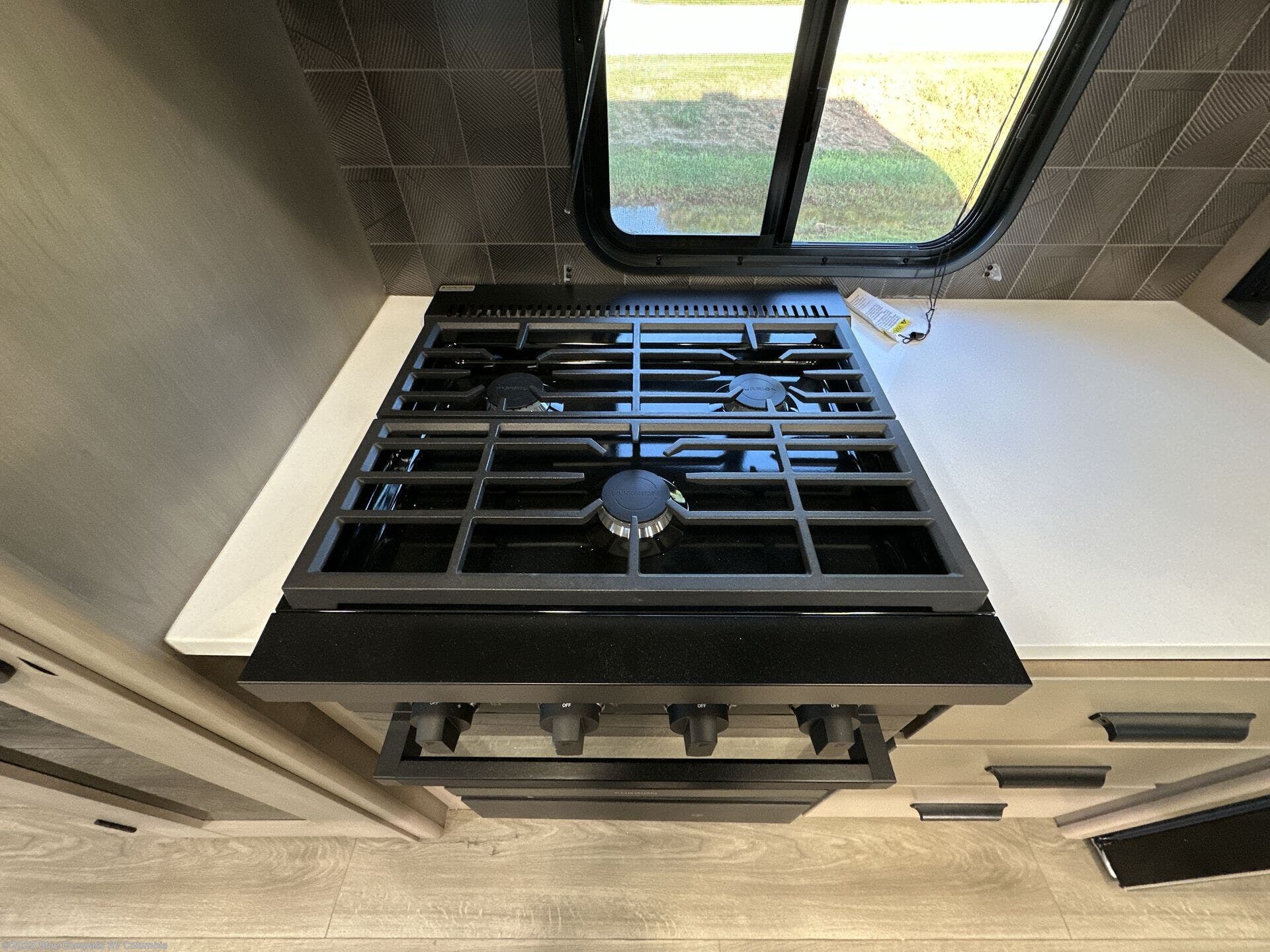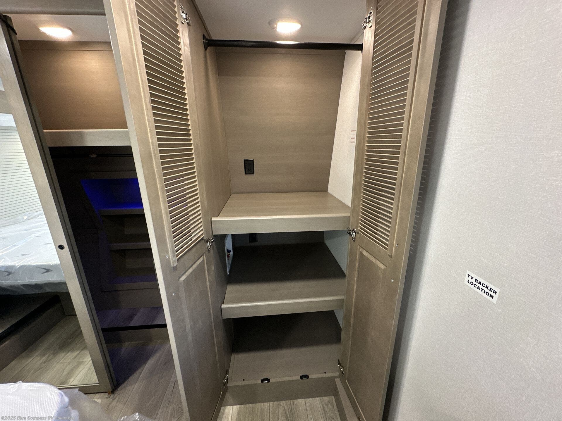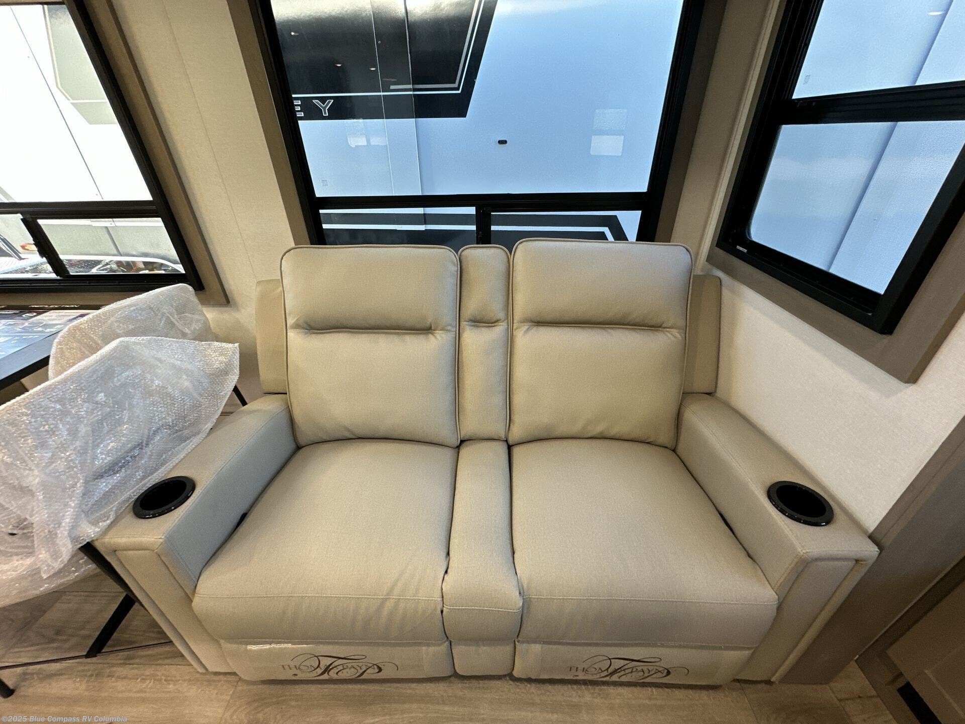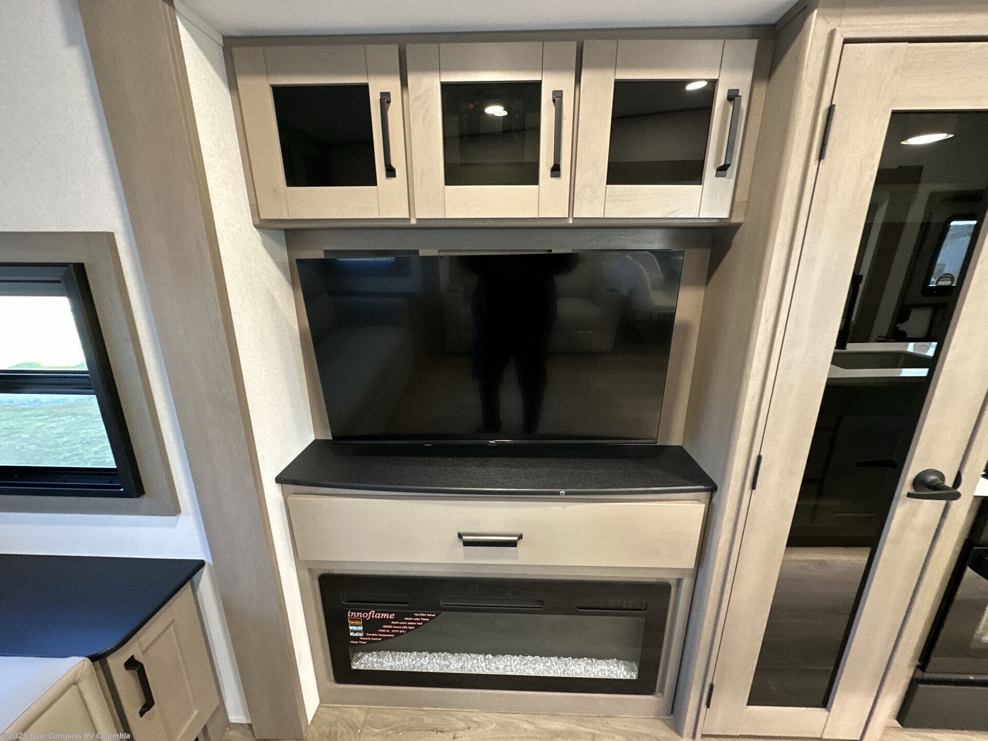 You can enjoy a spacious rear living area in this RV with dual opposing slides offering you entertainment, kitchen amenities, seating and windows for great views! The rear tri-fold sofa also converts into extra sleeping space for an extra guest or two, just like the booth dinette does. Yet you might like to add the swivel dinette option. There are theater seats to enjoy while you place your drinks in the cupholders and watch the entertainment center with a 40" LED HDTV and fireplace. The pantry is big enough to store your favorite snacks, and the kitchen island will make meal prepping easier, plus there is a 16 cu. ft. refrigerator to store any leftovers. The full bathroom has a 30" x 48" fiberglass shower and a linen closet to store your towels. The front private bedroom has a comfortable queen bed slide that can be switched out for the optional king bed, a dresser with overhead cabinets, and a full wall wardrobe that is prepped to add the optional washer and dryer so that you can extend your camping trip with clean clothes!