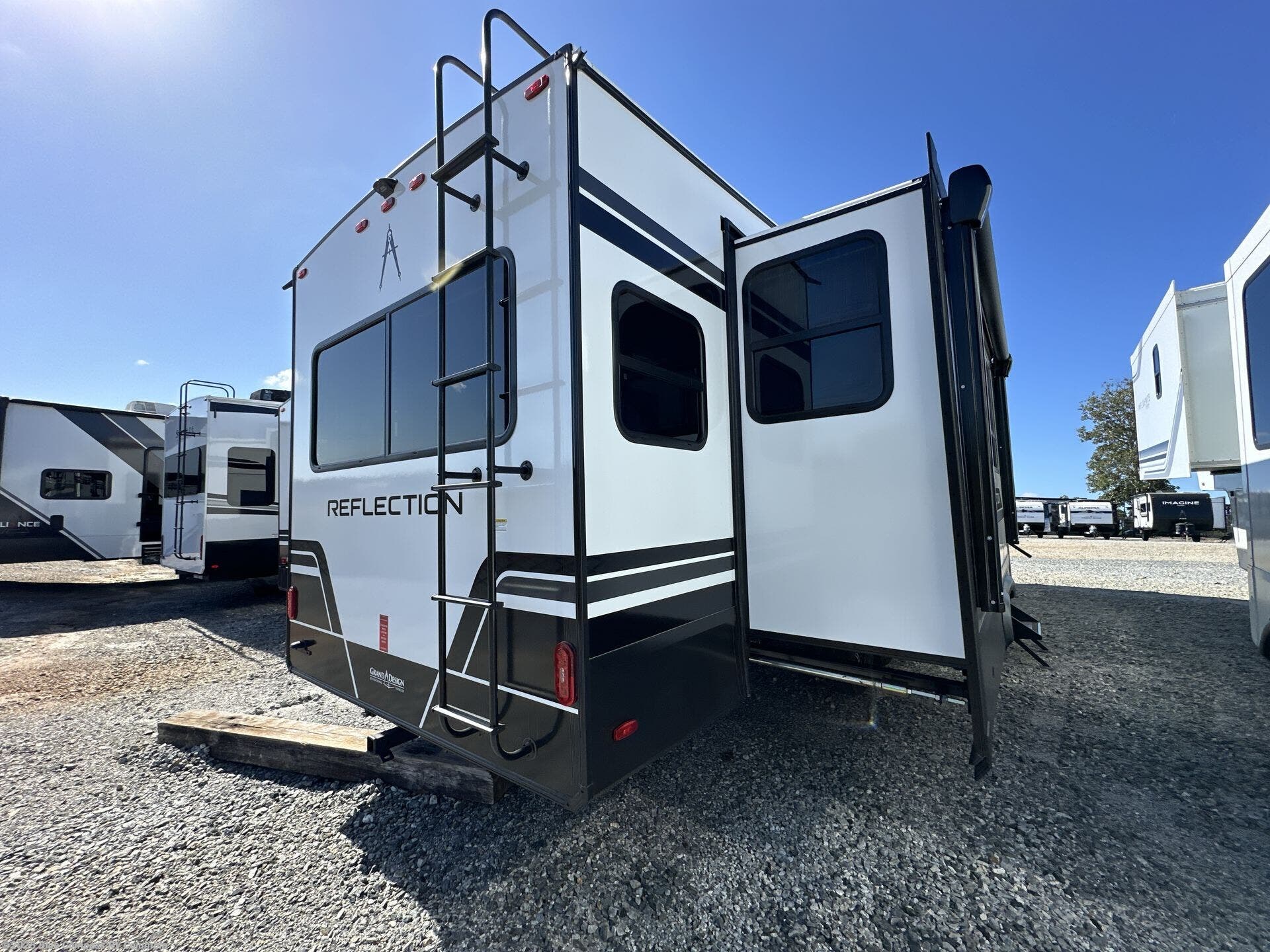 With any Reflection fifth wheel by Grand Design, you will have a solar panel for off-grid camping and a 60 amp charge controller and inverter prep, a Universal All-In-One docking station, unobstructed pass-through storage, and Goodyear Endurance tires. Each is constructed of gel coat exterior sidewalls, residential 5" truss rafters, walk-on roof decking, a fiberglass and radiant foil roof and front cap insulation plus laminated aluminum framed side walls, roof and end walls in slide rooms. Head inside to enjoy residential hardwood cabinet doors, premium Congoleum flooring, a spacious shower with a glass door, and many more comforts!