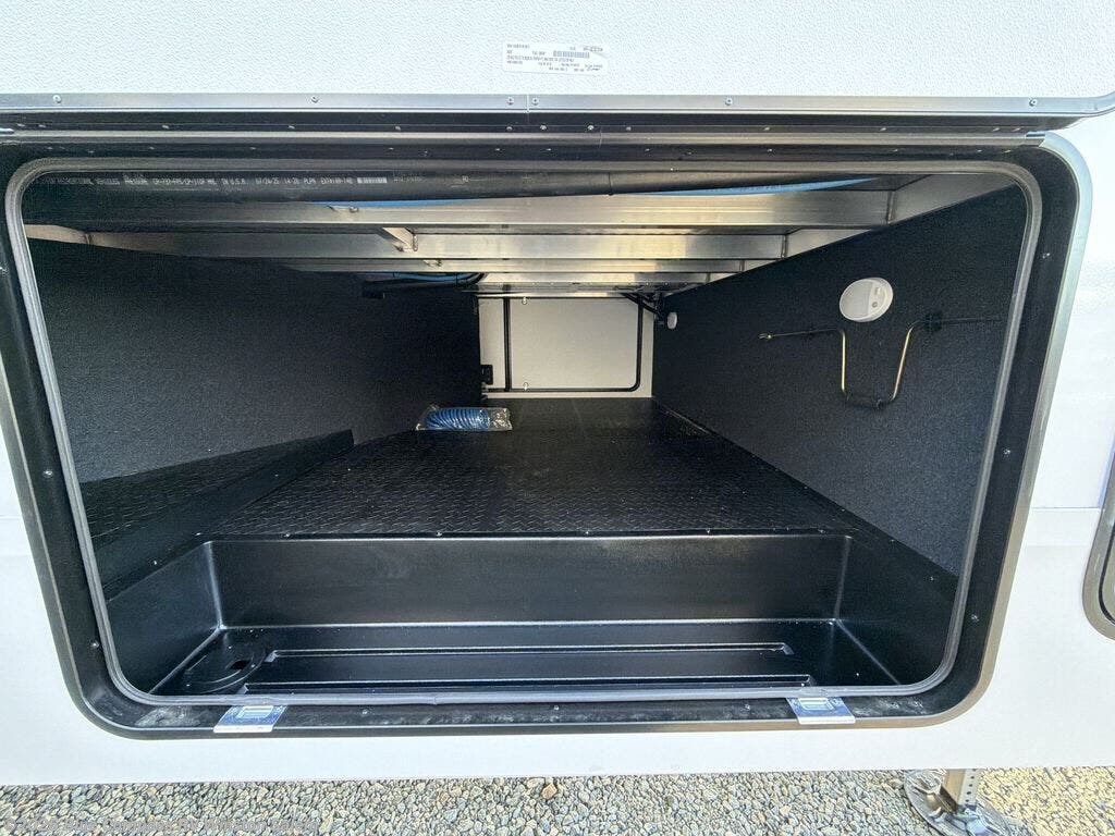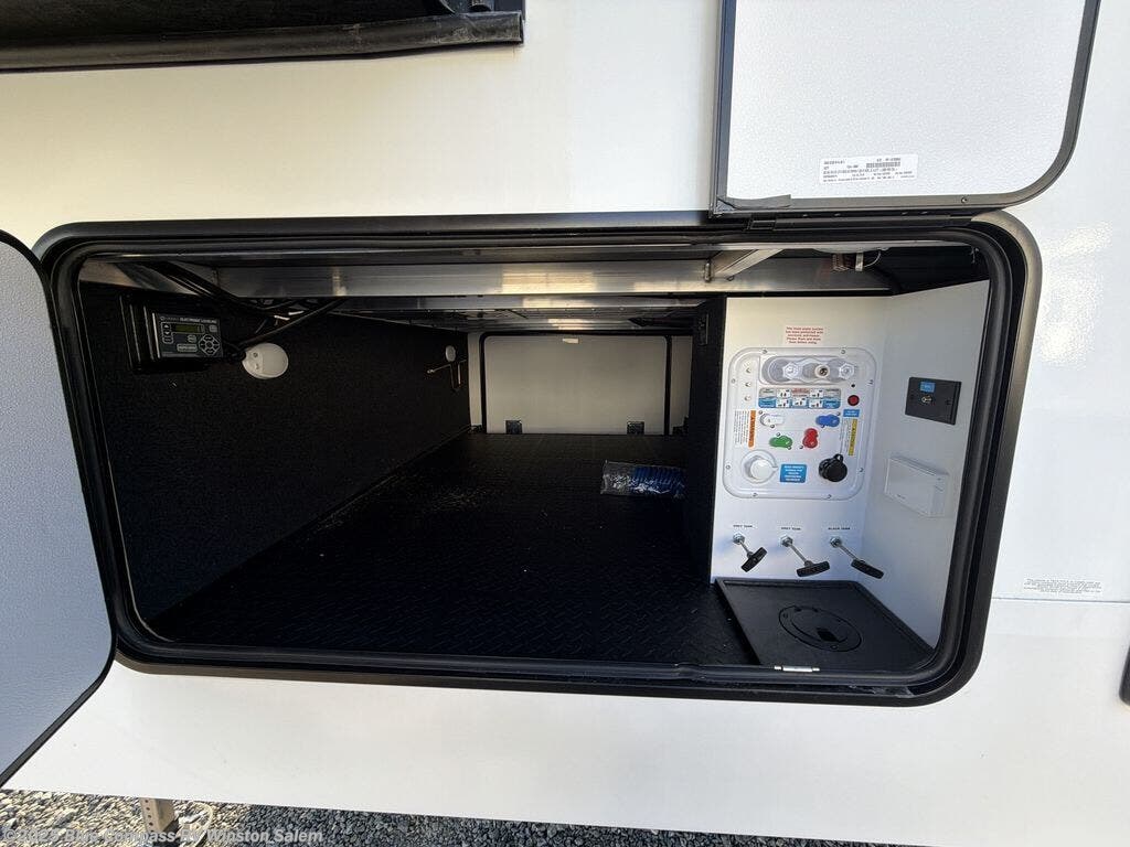 You can enjoy a spacious rear living area in this RV with dual opposing slides offering you entertainment, kitchen amenities, seating and windows for great views! The rear tri-fold sofa also converts into extra sleeping space for an extra guest or two, just like the booth dinette does. Yet you might like to add the swivel dinette option. There are theater seats to enjoy while you place your drinks in the cupholders and watch the entertainment center with a 40" LED HDTV and fireplace. The pantry is big enough to store your favorite snacks, and the kitchen island will make meal prepping easier, plus there is a 16 cu. ft. refrigerator to store any leftovers. The full bathroom has a 30" x 48" fiberglass shower and a linen closet to store your towels. The front private bedroom has a comfortable queen bed slide that can be switched out for the optional king bed, a dresser with overhead cabinets, and a full wall wardrobe that is prepped to add the optional washer and dryer so that you can extend your camping trip with clean clothes!
