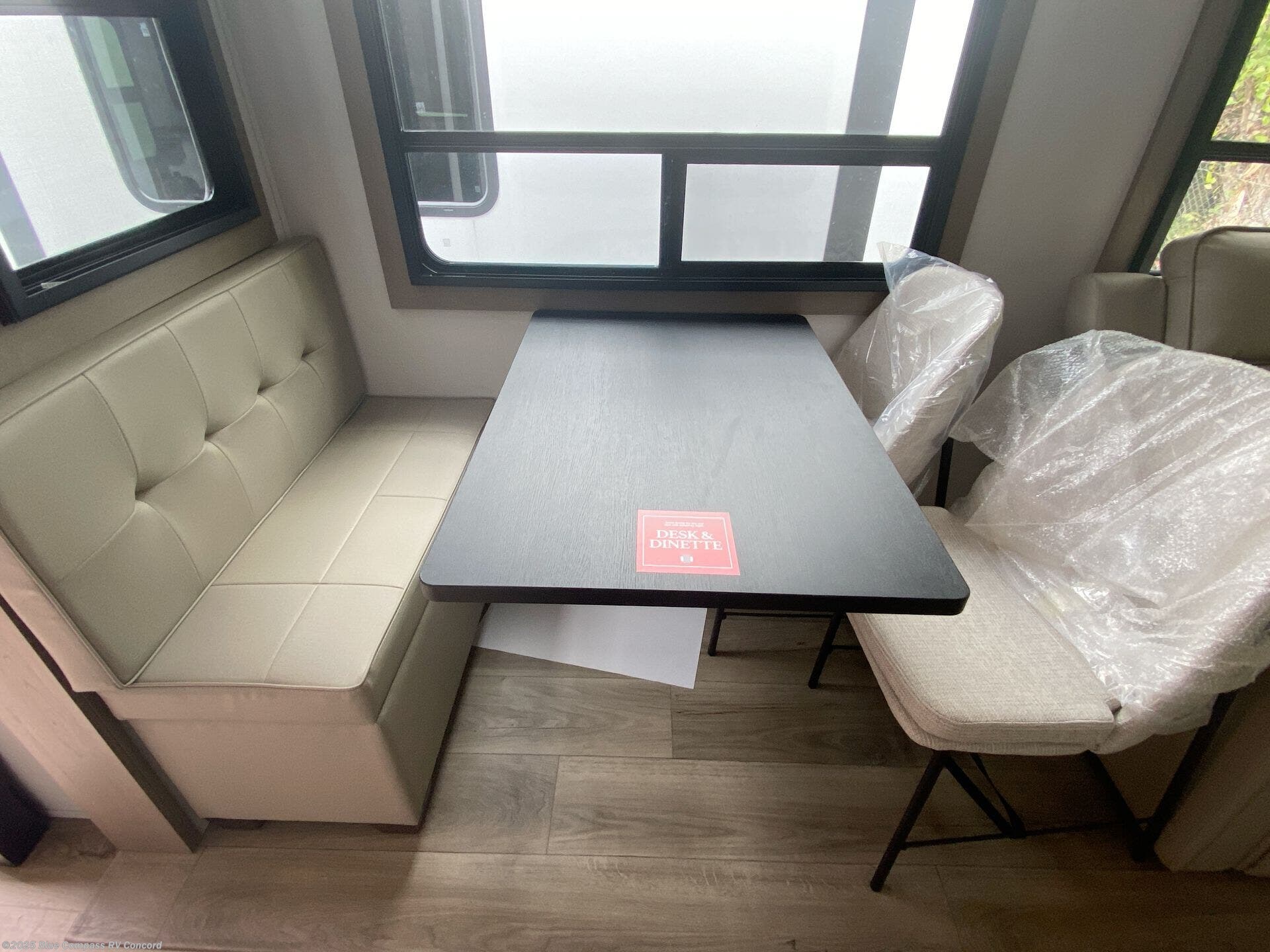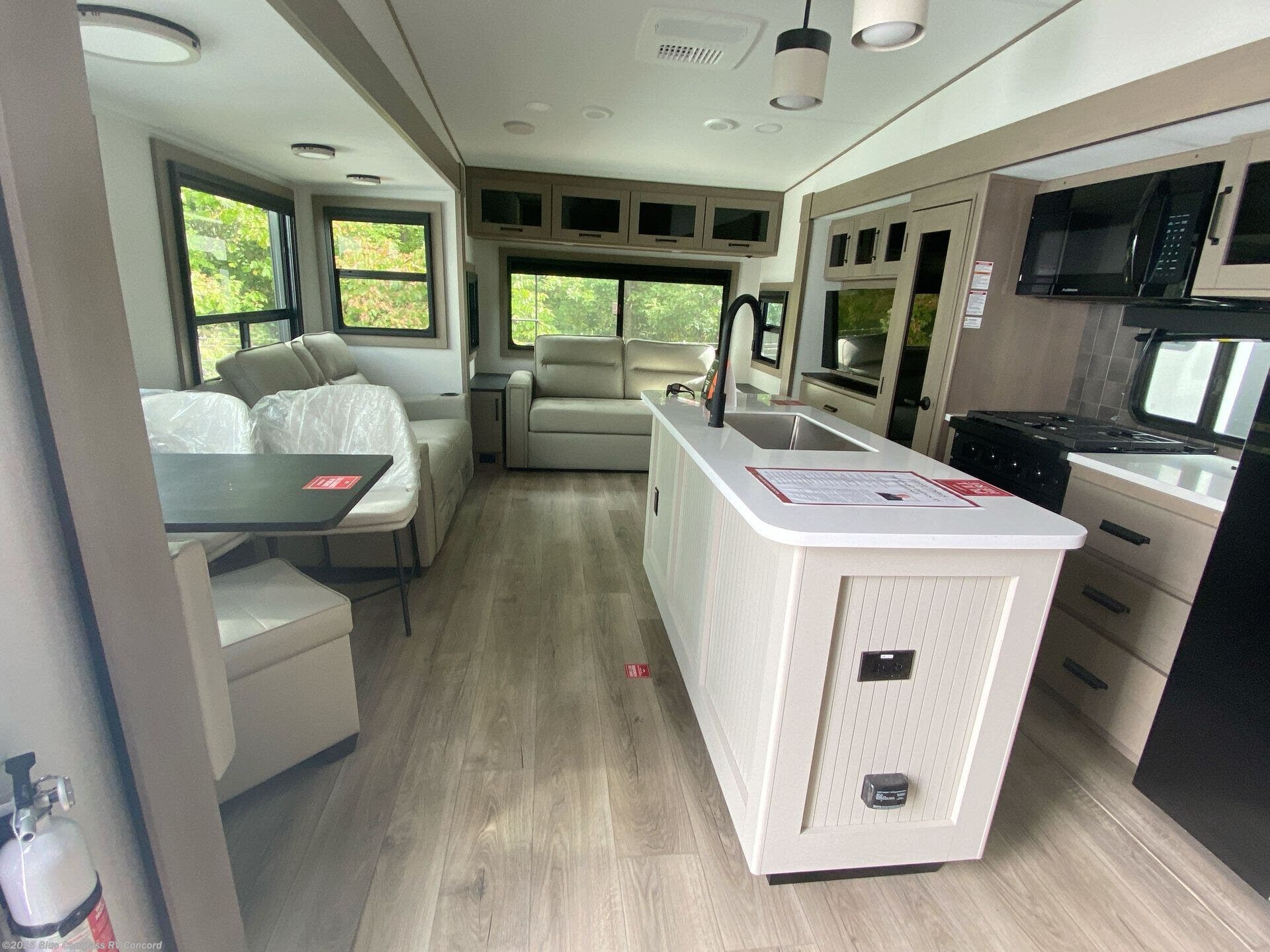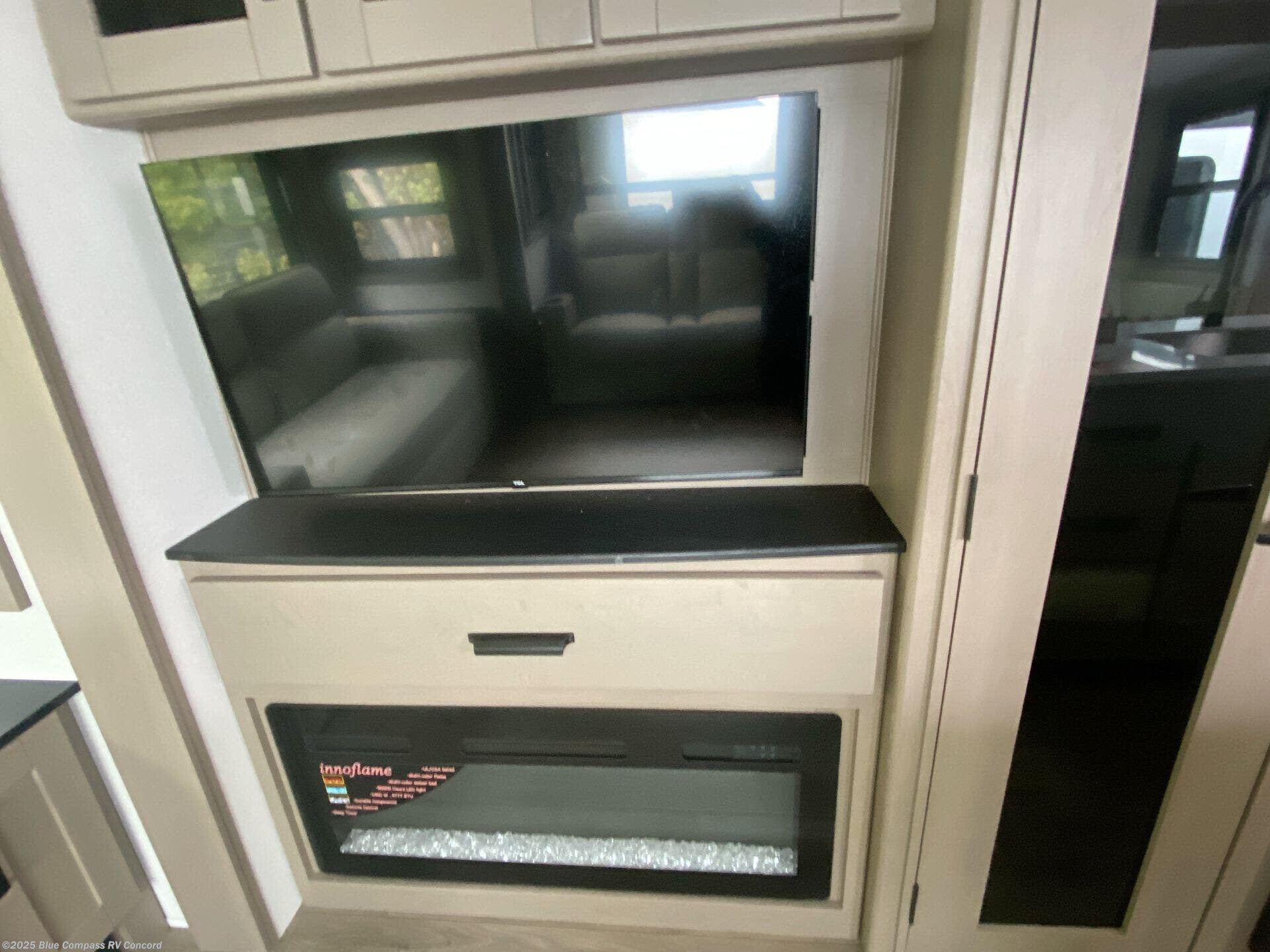 You can enjoy a spacious rear living area in this RV with dual opposing slides offering you entertainment, kitchen amenities, seating and windows for great views! The rear tri-fold sofa also converts into extra sleeping space for an extra guest or two, just like the booth dinette does. Yet you might like to add the swivel dinette option. There are theater seats to enjoy while you place your drinks in the cupholders and watch the entertainment center with a 40" LED HDTV and fireplace. The pantry is big enough to store your favorite snacks, and the kitchen island will make meal prepping easier, plus there is a 16 cu. ft. refrigerator to store any leftovers. The full bathroom has a 30" x 48" fiberglass shower and a linen closet to store your towels. The front private bedroom has a comfortable queen bed slide that can be switched out for the optional king bed, a dresser with overhead cabinets, and a full wall wardrobe that is prepped to add the optional washer and dryer so that you can extend your camping trip with clean clothes!