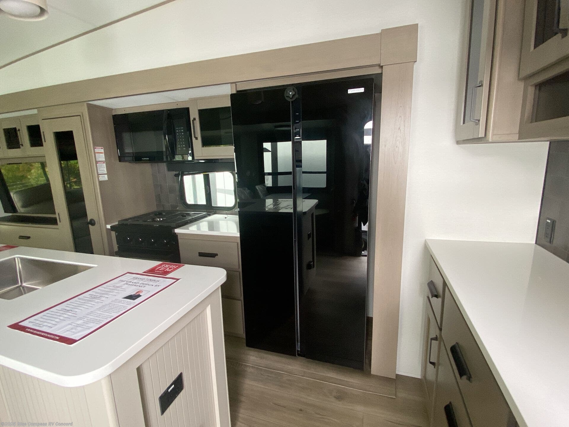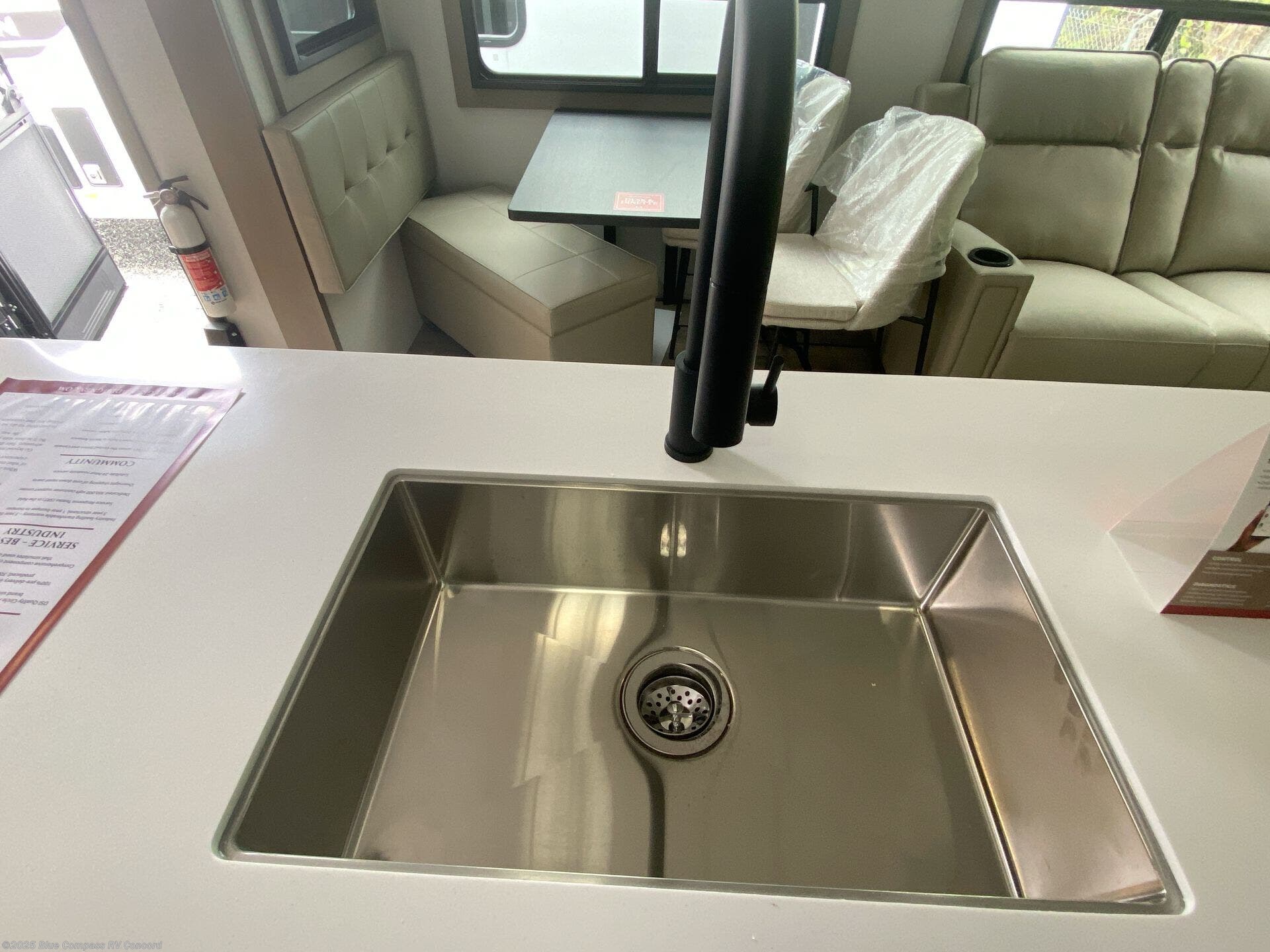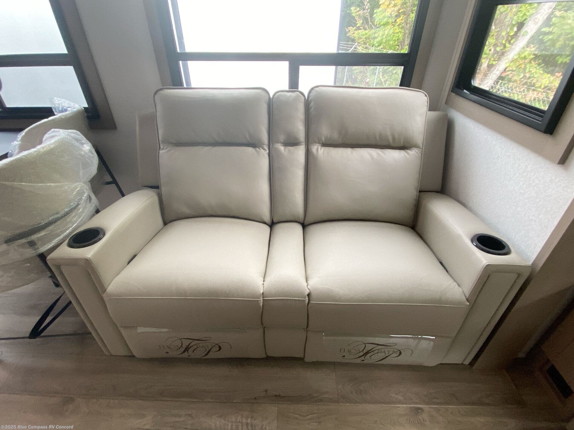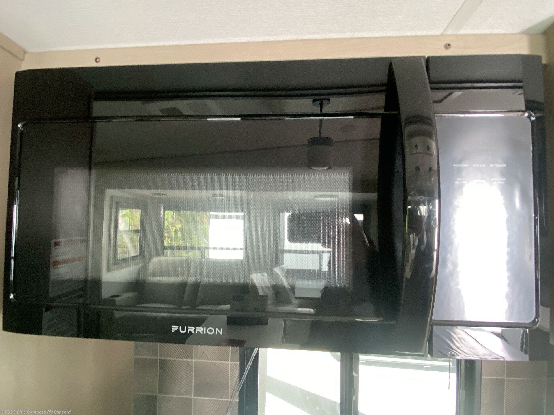 You can enjoy a spacious rear living area in this RV with dual opposing slides offering you entertainment, kitchen amenities, seating and windows for great views! The rear tri-fold sofa also converts into extra sleeping space for an extra guest or two, just like the booth dinette does. Yet you might like to add the swivel dinette option. There are theater seats to enjoy while you place your drinks in the cupholders and watch the entertainment center with a 40" LED HDTV and fireplace. The pantry is big enough to store your favorite snacks, and the kitchen island will make meal prepping easier, plus there is a 16 cu. ft. refrigerator to store any leftovers. The full bathroom has a 30" x 48" fiberglass shower and a linen closet to store your towels. The front private bedroom has a comfortable queen bed slide that can be switched out for the optional king bed, a dresser with overhead cabinets, and a full wall wardrobe that is prepped to add the optional washer and dryer so that you can extend your camping trip with clean clothes!