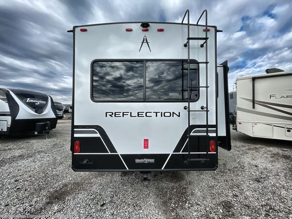 With any Reflection fifth wheel by Grand Design, you will have a solar panel for off-grid camping and a 60 amp charge controller and inverter prep, a Universal All-In-One docking station, unobstructed pass-through storage, and Goodyear Endurance tires. Each is constructed of gel coat exterior sidewalls, residential 5" truss rafters, walk-on roof decking, a fiberglass and radiant foil roof and front cap insulation plus laminated aluminum framed side walls, roof and end walls in slide rooms. Head inside to enjoy residential hardwood cabinet doors, premium Congoleum flooring, a spacious shower with a glass door, and many more comforts!