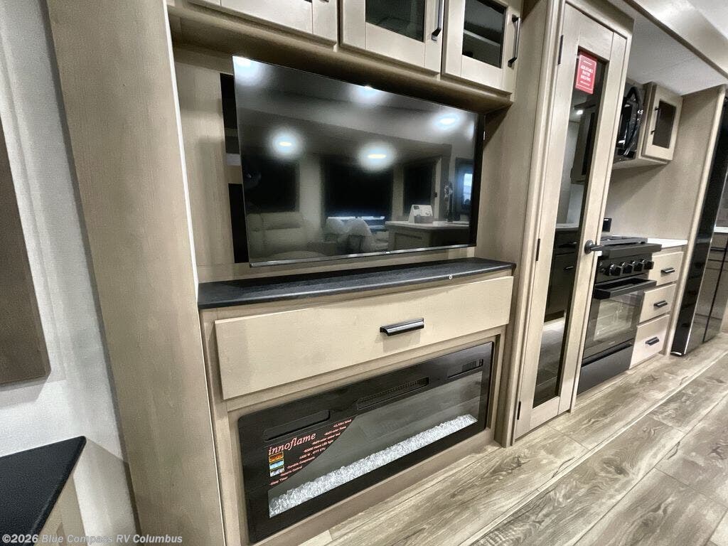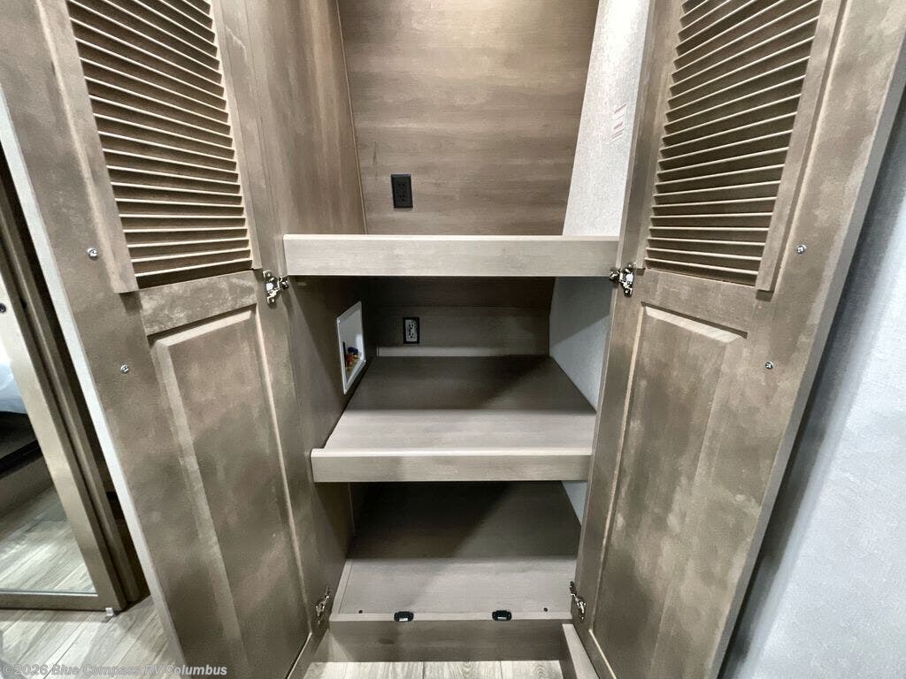 You can enjoy a spacious rear living area in this RV with dual opposing slides offering you entertainment, kitchen amenities, seating and windows for great views! The rear tri-fold sofa also converts into extra sleeping space for an extra guest or two, just like the booth dinette does. Yet you might like to add the swivel dinette option. There are theater seats to enjoy while you place your drinks in the cupholders and watch the entertainment center with a 40" LED HDTV and fireplace. The pantry is big enough to store your favorite snacks, and the kitchen island will make meal prepping easier, plus there is a 16 cu. ft. refrigerator to store any leftovers. The full bathroom has a 30" x 48" fiberglass shower and a linen closet to store your towels. The front private bedroom has a comfortable queen bed slide that can be switched out for the optional king bed, a dresser with overhead cabinets, and a full wall wardrobe that is prepped to add the optional washer and dryer so that you can extend your camping trip with clean clothes!