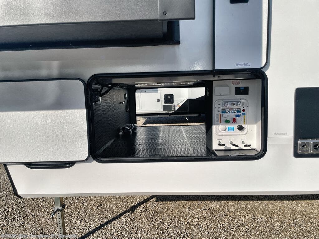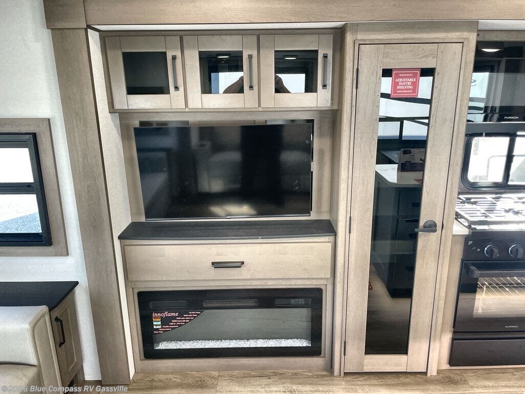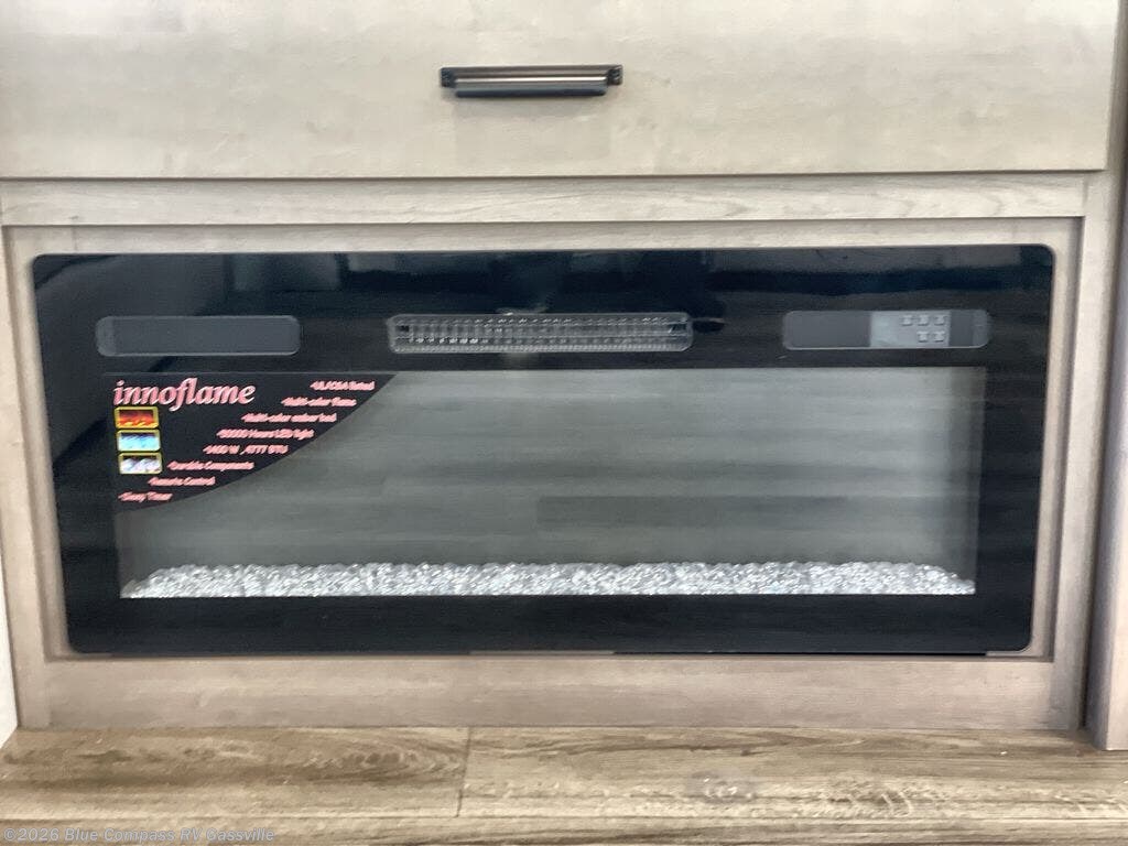 You can enjoy a spacious rear living area in this RV with dual opposing slides offering you entertainment, kitchen amenities, seating and windows for great views! The rear tri-fold sofa also converts into extra sleeping space for an extra guest or two, just like the booth dinette does. Yet you might like to add the swivel dinette option. There are theater seats to enjoy while you place your drinks in the cupholders and watch the entertainment center with a 40" LED HDTV and fireplace. The pantry is big enough to store your favorite snacks, and the kitchen island will make meal prepping easier, plus there is a 16 cu. ft. refrigerator to store any leftovers. The full bathroom has a 30" x 48" fiberglass shower and a linen closet to store your towels. The front private bedroom has a comfortable queen bed slide that can be switched out for the optional king bed, a dresser with overhead cabinets, and a full wall wardrobe that is prepped to add the optional washer and dryer so that you can extend your camping trip with clean clothes!