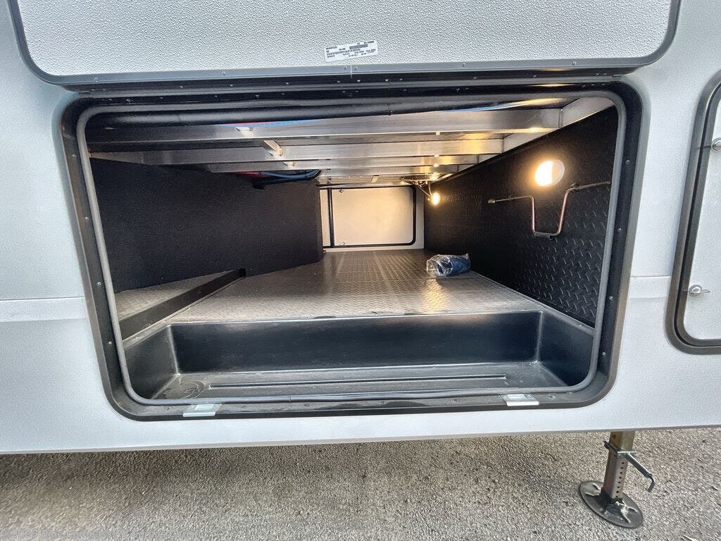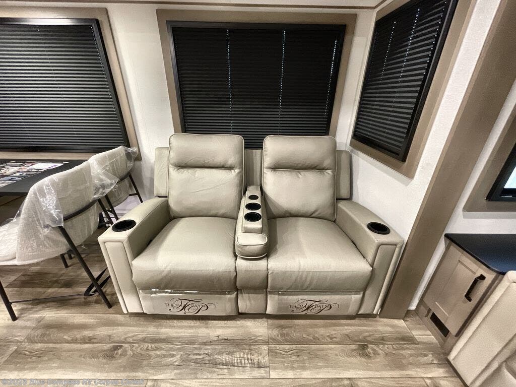 You can enjoy a spacious rear living area in this RV with dual opposing slides offering you entertainment, kitchen amenities, seating and windows for great views! The rear tri-fold sofa also converts into extra sleeping space for an extra guest or two, just like the booth dinette does. Yet you might like to add the swivel dinette option. There are theater seats to enjoy while you place your drinks in the cupholders and watch the entertainment center with a 40" LED HDTV and fireplace. The pantry is big enough to store your favorite snacks, and the kitchen island will make meal prepping easier, plus there is a 16 cu. ft. refrigerator to store any leftovers. The full bathroom has a 30" x 48" fiberglass shower and a linen closet to store your towels. The front private bedroom has a comfortable queen bed slide that can be switched out for the optional king bed, a dresser with overhead cabinets, and a full wall wardrobe that is prepped to add the optional washer and dryer so that you can extend your camping trip with clean clothes!
