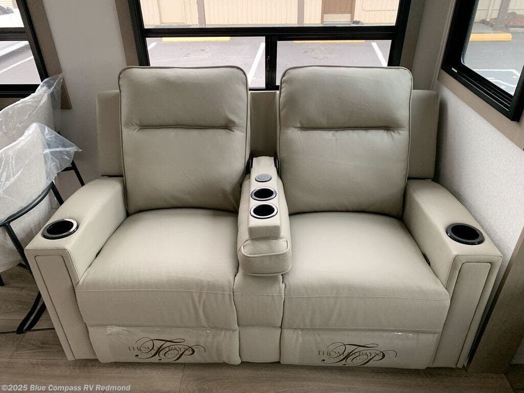You can enjoy a spacious rear living area in this RV with dual opposing slides offering you entertainment, kitchen amenities, seating and windows for great views! The rear tri-fold sofa also converts into extra sleeping space for an extra guest or two, just like the booth dinette does. Yet you might like to add the swivel dinette option. There are theater seats to enjoy while you place your drinks in the cupholders and watch the entertainment center with a 40" LED HDTV and fireplace. The pantry is big enough to store your favorite snacks, and the kitchen island will make meal prepping easier, plus there is a 16 cu. ft. refrigerator to store any leftovers. The full bathroom has a 30" x 48" fiberglass shower and a linen closet to store your towels. The front private bedroom has a comfortable queen bed slide that can be switched out for the optional king bed, a dresser with overhead cabinets, and a full wall wardrobe that is prepped to add the optional washer and dryer so that you can extend your camping trip with clean clothes!