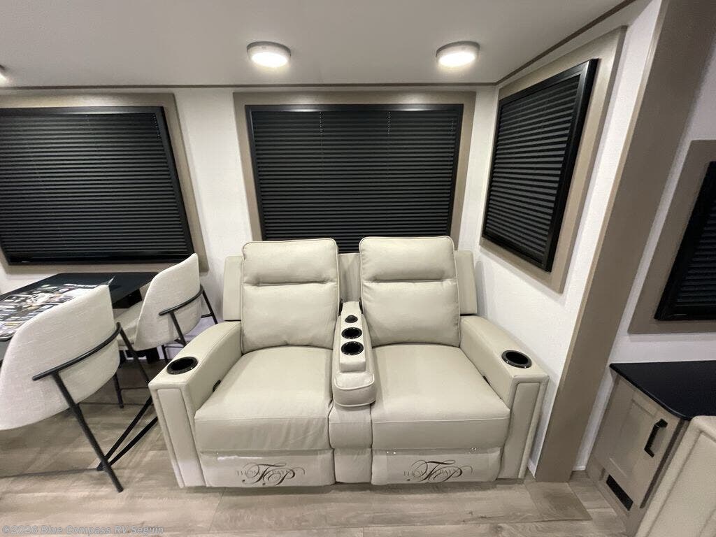 You can enjoy a spacious rear living area in this RV with dual opposing slides offering you entertainment, kitchen amenities, seating and windows for great views! The rear tri-fold sofa also converts into extra sleeping space for an extra guest or two, just like the booth dinette does. Yet you might like to add the swivel dinette option. There are theater seats to enjoy while you place your drinks in the cupholders and watch the entertainment center with a 40" LED HDTV and fireplace. The pantry is big enough to store your favorite snacks, and the kitchen island will make meal prepping easier, plus there is a 16 cu. ft. refrigerator to store any leftovers. The full bathroom has a 30" x 48" fiberglass shower and a linen closet to store your towels. The front private bedroom has a comfortable queen bed slide that can be switched out for the optional king bed, a dresser with overhead cabinets, and a full wall wardrobe that is prepped to add the optional washer and dryer so that you can extend your camping trip with clean clothes!