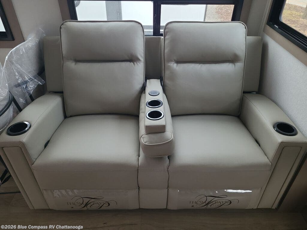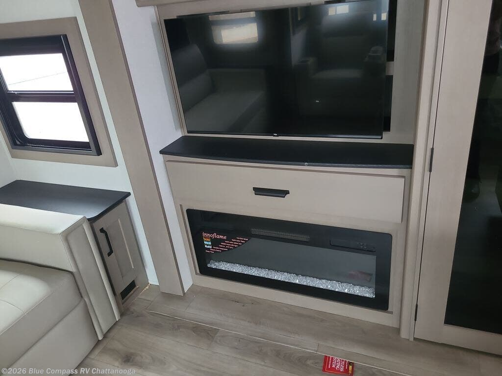 You can enjoy a spacious rear living area in this RV with dual opposing slides offering you entertainment, kitchen amenities, seating and windows for great views! The rear tri-fold sofa also converts into extra sleeping space for an extra guest or two, just like the booth dinette does. Yet you might like to add the swivel dinette option. There are theater seats to enjoy while you place your drinks in the cupholders and watch the entertainment center with a 40" LED HDTV and fireplace. The pantry is big enough to store your favorite snacks, and the kitchen island will make meal prepping easier, plus there is a 16 cu. ft. refrigerator to store any leftovers. The full bathroom has a 30" x 48" fiberglass shower and a linen closet to store your towels. The front private bedroom has a comfortable queen bed slide that can be switched out for the optional king bed, a dresser with overhead cabinets, and a full wall wardrobe that is prepped to add the optional washer and dryer so that you can extend your camping trip with clean clothes!