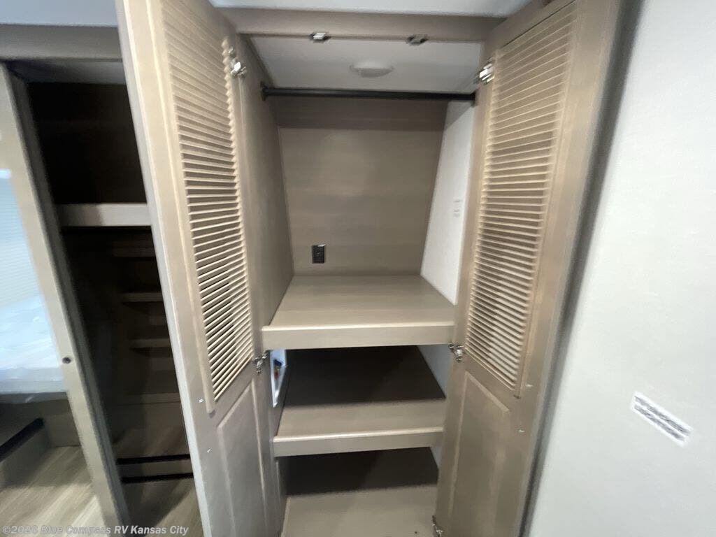 You can enjoy a spacious rear living area in this RV with dual opposing slides offering you entertainment, kitchen amenities, seating and windows for great views! The rear tri-fold sofa also converts into extra sleeping space for an extra guest or two, just like the booth dinette does. Yet you might like to add the swivel dinette option. There are theater seats to enjoy while you place your drinks in the cupholders and watch the entertainment center with a 40" LED HDTV and fireplace. The pantry is big enough to store your favorite snacks, and the kitchen island will make meal prepping easier, plus there is a 16 cu. ft. refrigerator to store any leftovers. The full bathroom has a 30" x 48" fiberglass shower and a linen closet to store your towels. The front private bedroom has a comfortable queen bed slide that can be switched out for the optional king bed, a dresser with overhead cabinets, and a full wall wardrobe that is prepped to add the optional washer and dryer so that you can extend your camping trip with clean clothes!