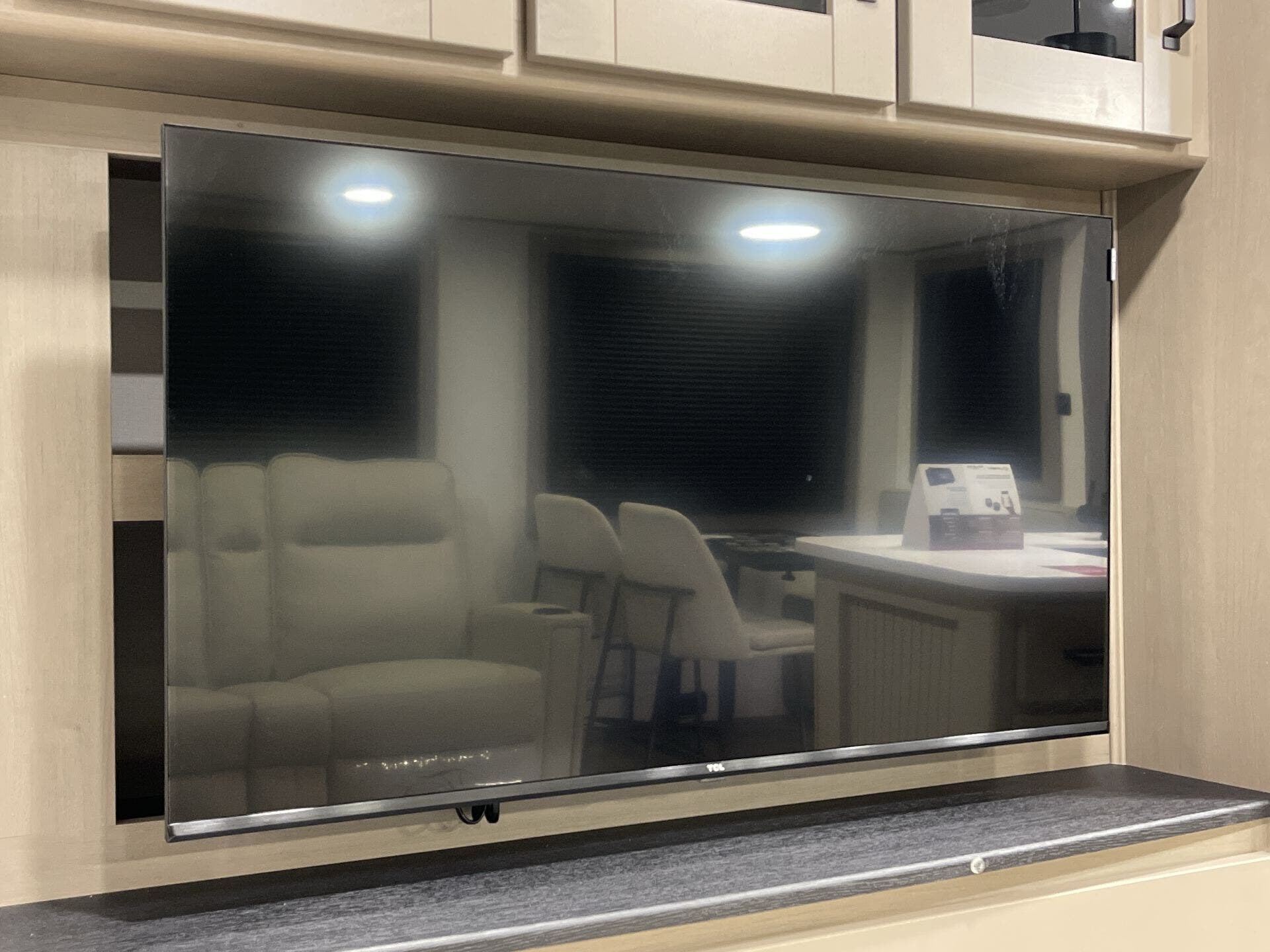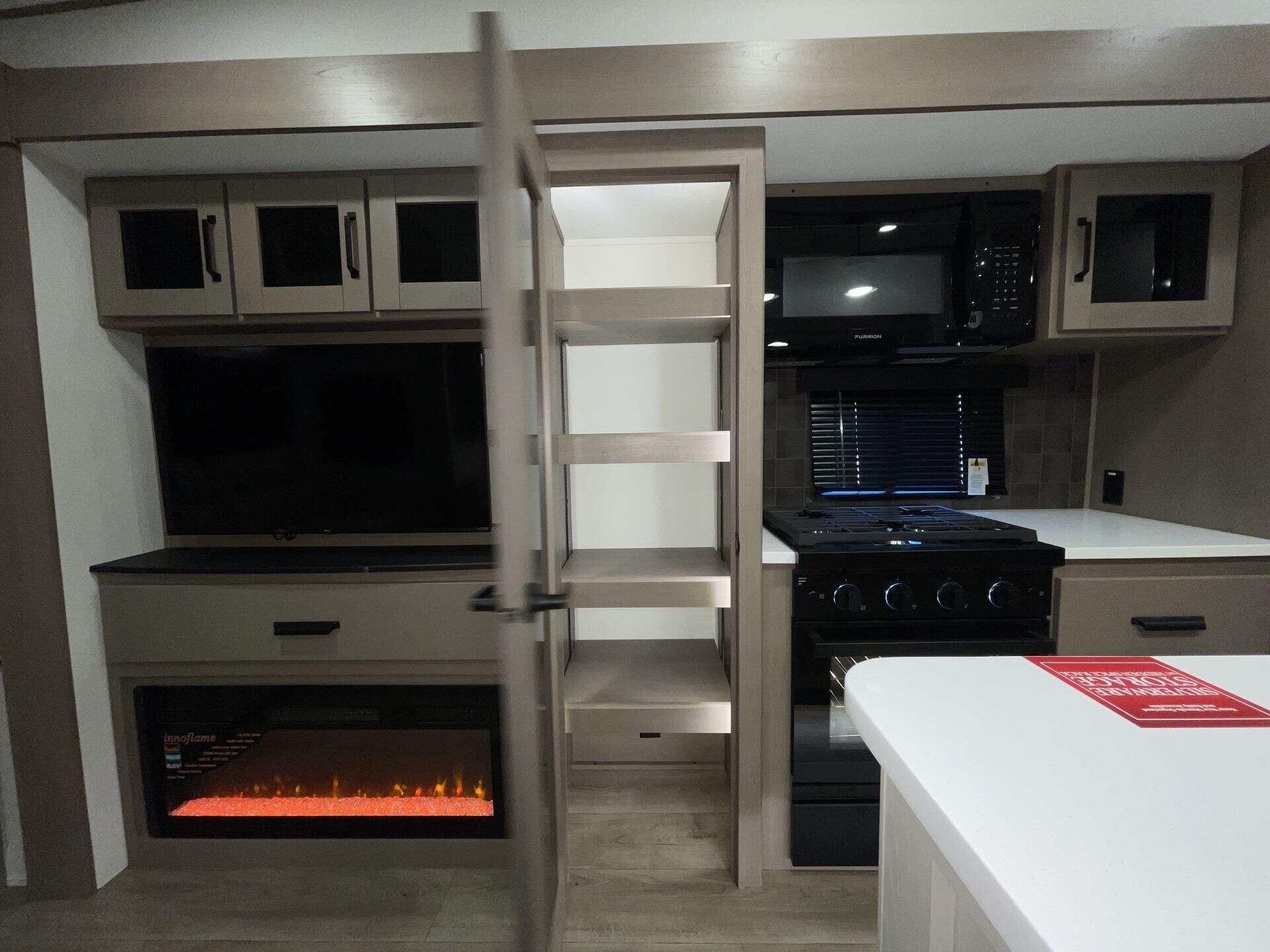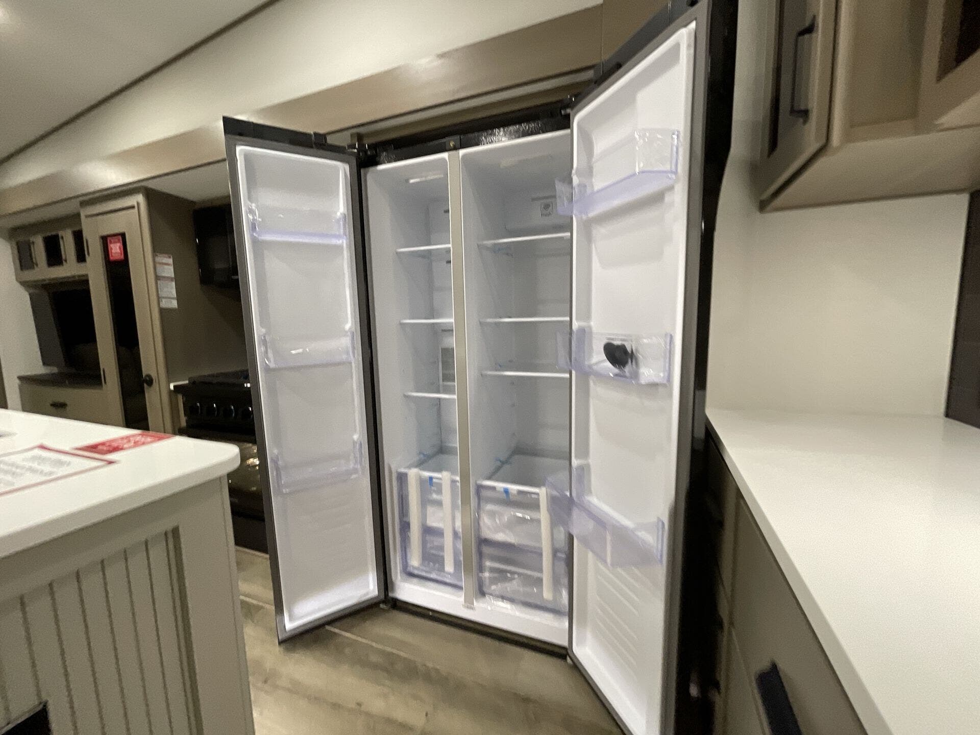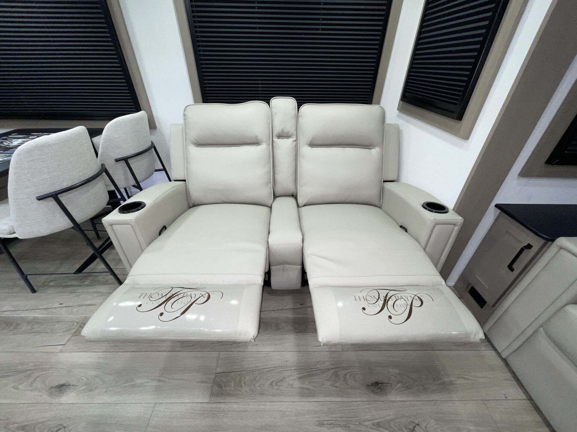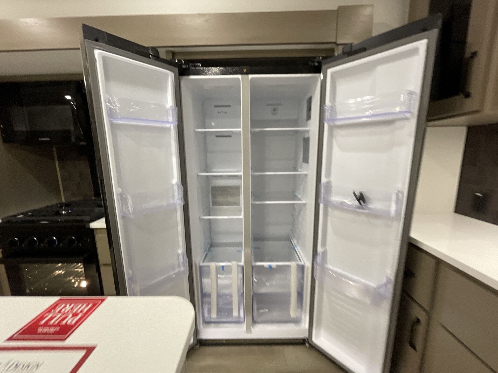 Inside, the rear lounge layout features theater seating, a tri-fold sofa, and a full entertainment center—perfect for relaxing after a day of travel. Large panoramic windows bring in natural light, enhancing the open-concept design. The kitchen is built for real use, with a center island, solid-surface countertops, a large 16 cu. ft. refrigerator, and ample pantry storage for longer stays.