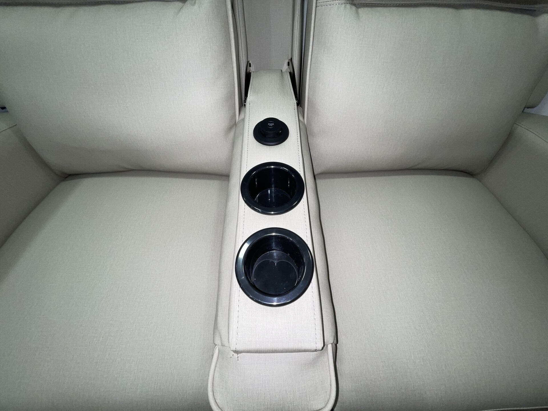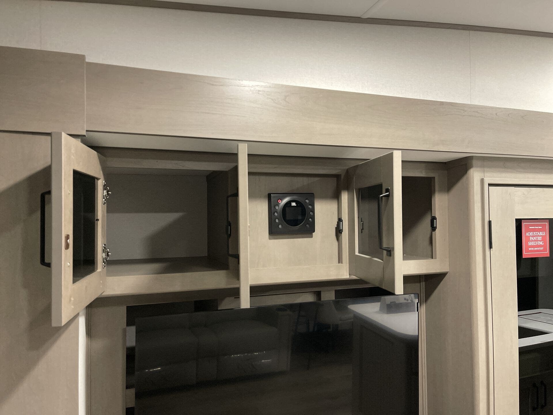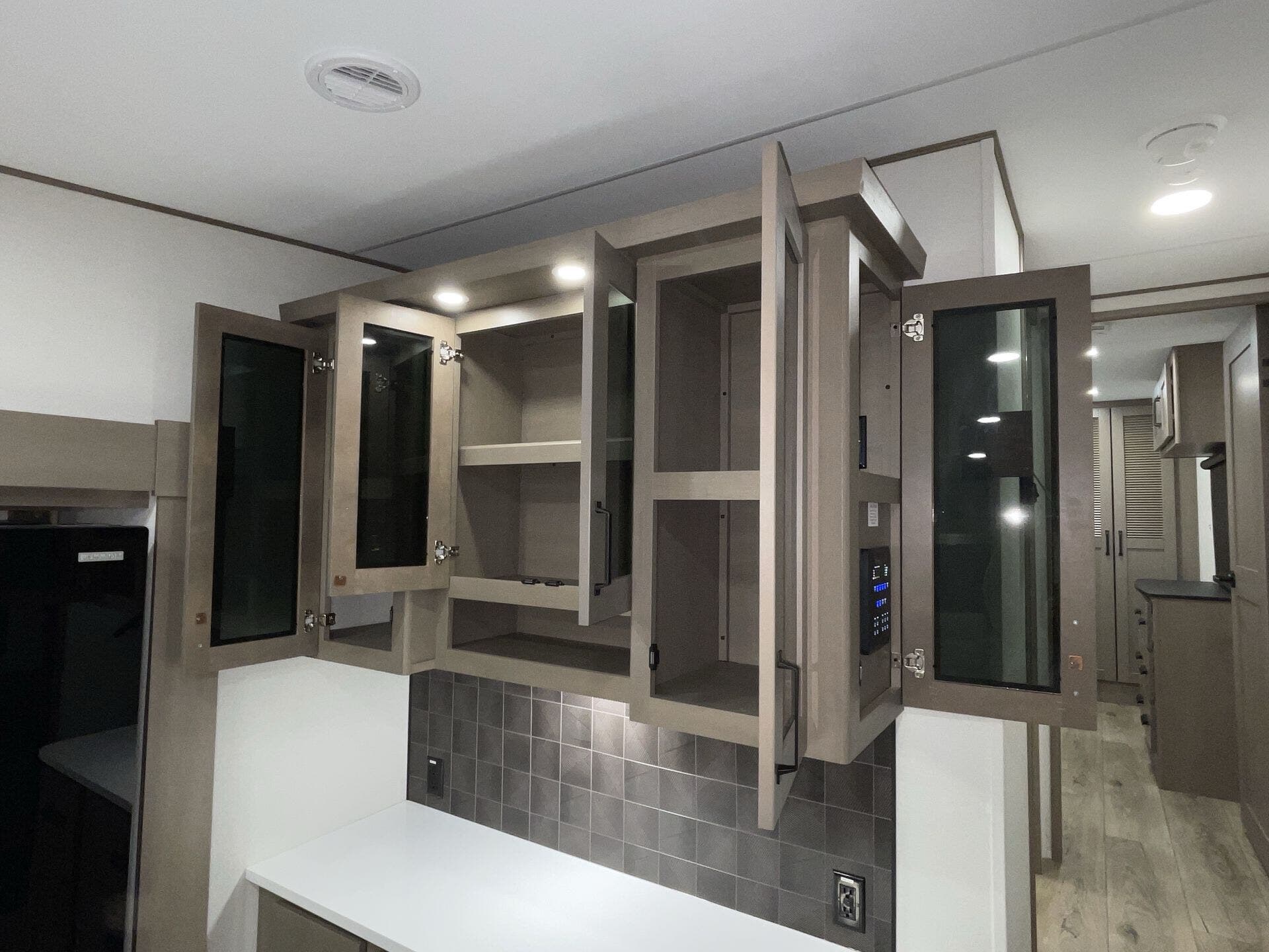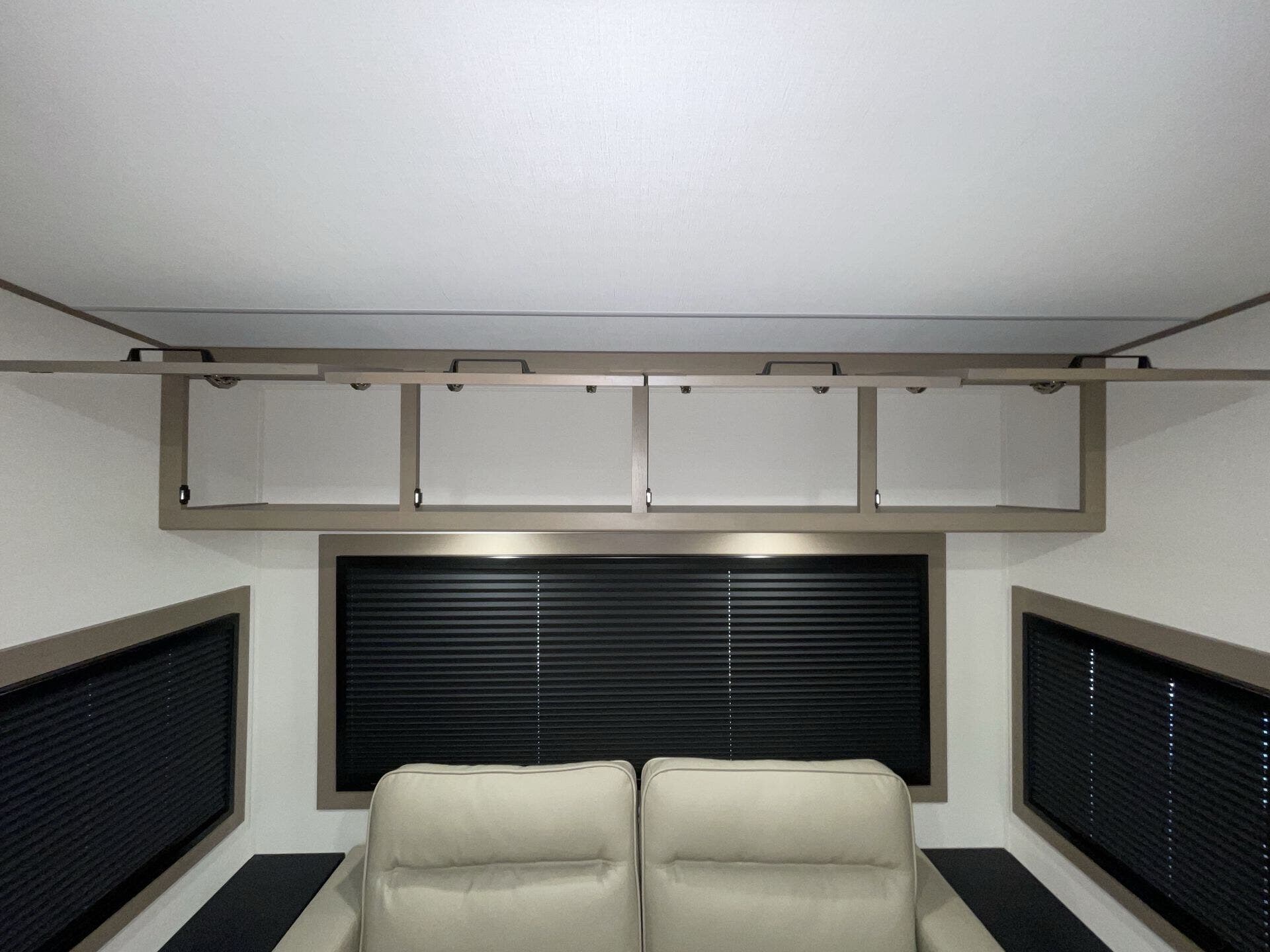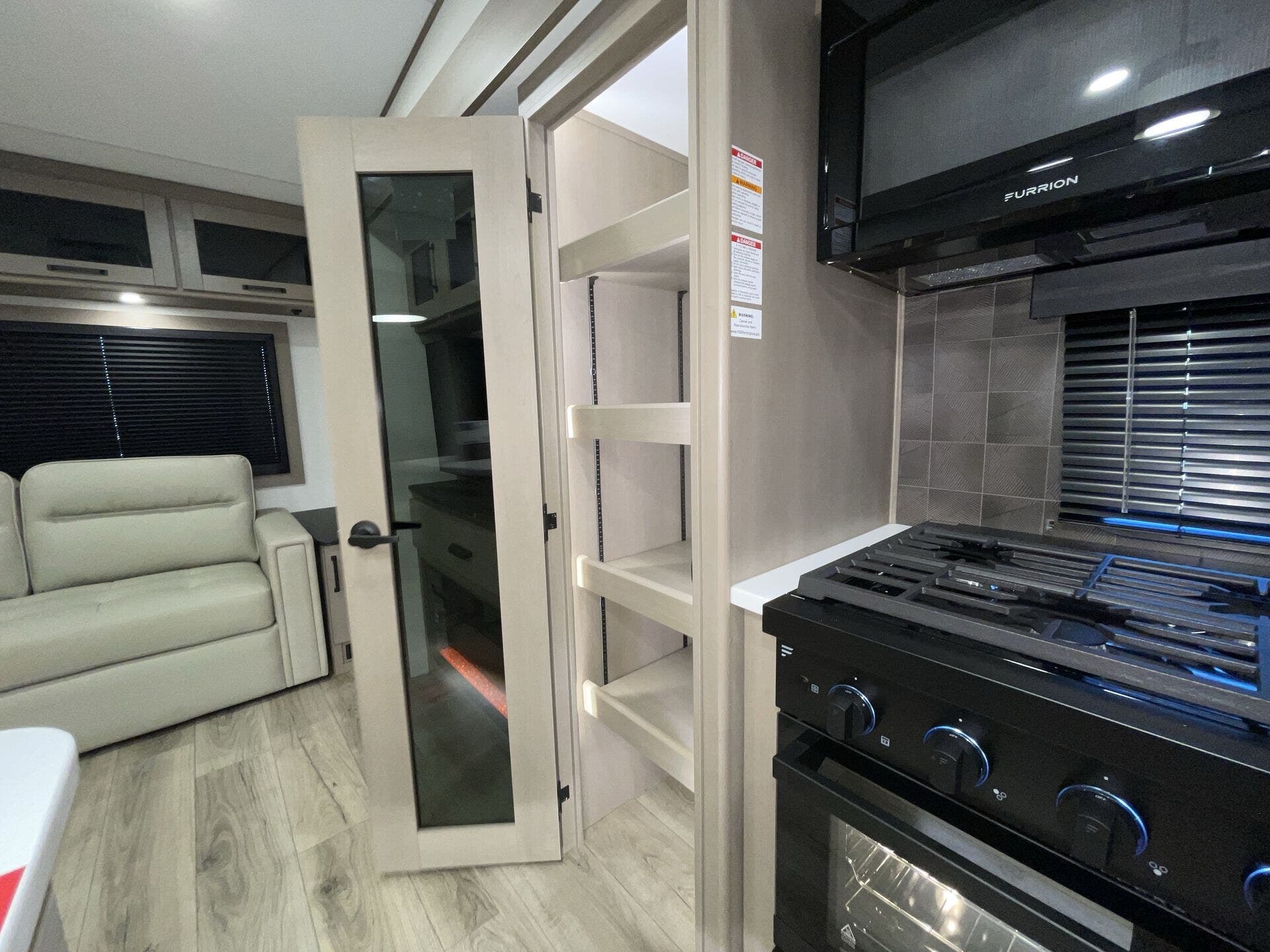 Inside, the rear lounge layout features theater seating, a tri-fold sofa, and a full entertainment center—perfect for relaxing after a day of travel. Large panoramic windows bring in natural light, enhancing the open-concept design. The kitchen is built for real use, with a center island, solid-surface countertops, a large 16 cu. ft. refrigerator, and ample pantry storage for longer stays.